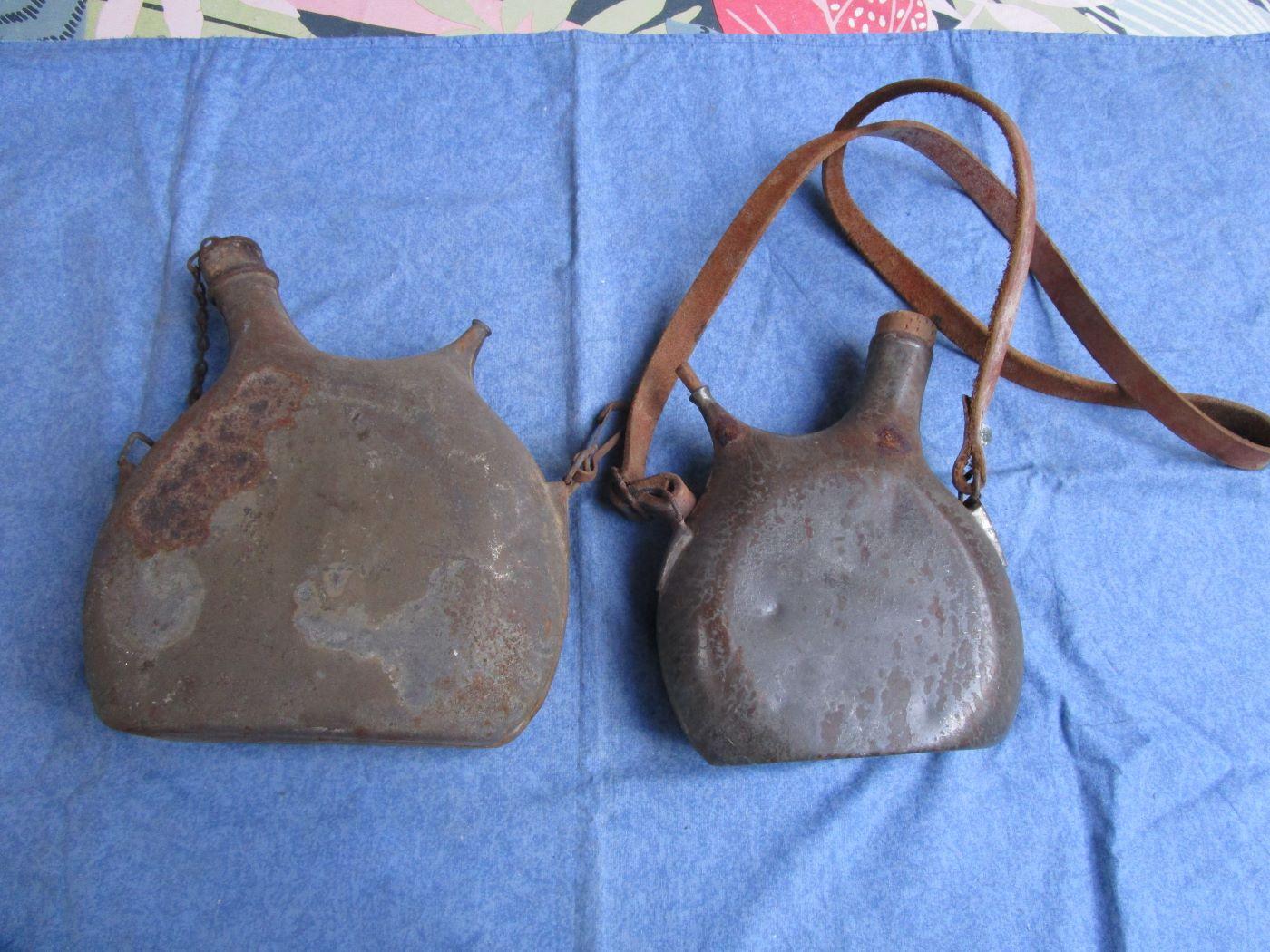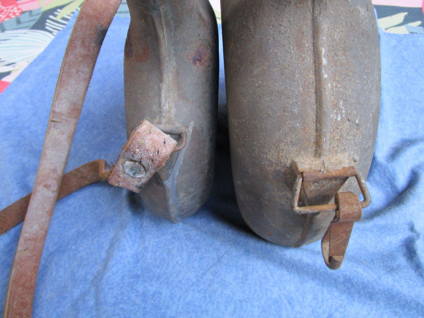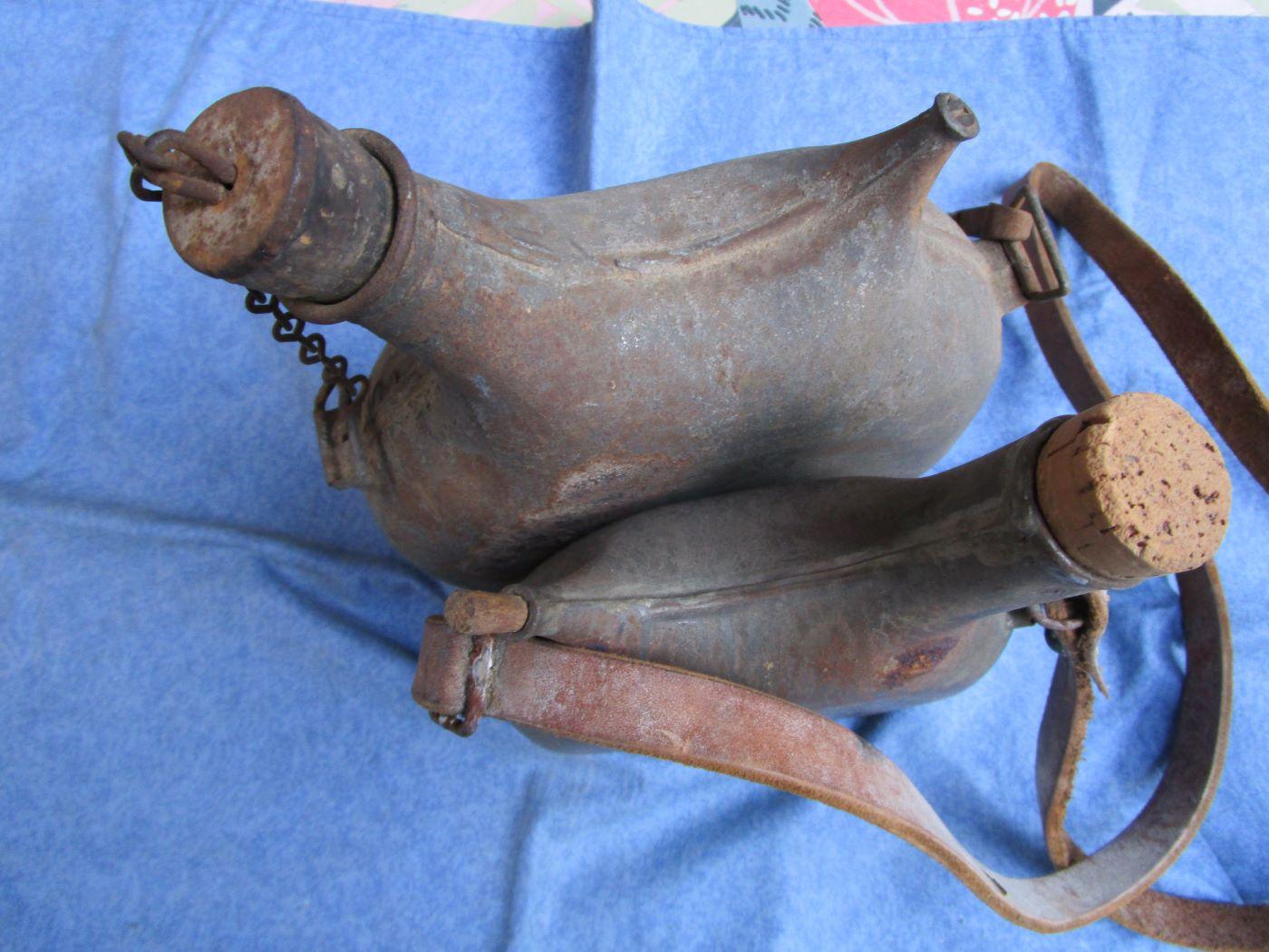 Le bouchon n'est pas d'origine sur le petit. Aucun trou. Cuir de la bretelle épais, certainement un ersatz. Marquage fabricant sur le 1 litre.Reste de peinture kaki sur le 2 litres. Autres photos sur demande. Prévoir 10.70 euros en colissimo ou 7. euros par mondial relay. Prix pour les deux pièces