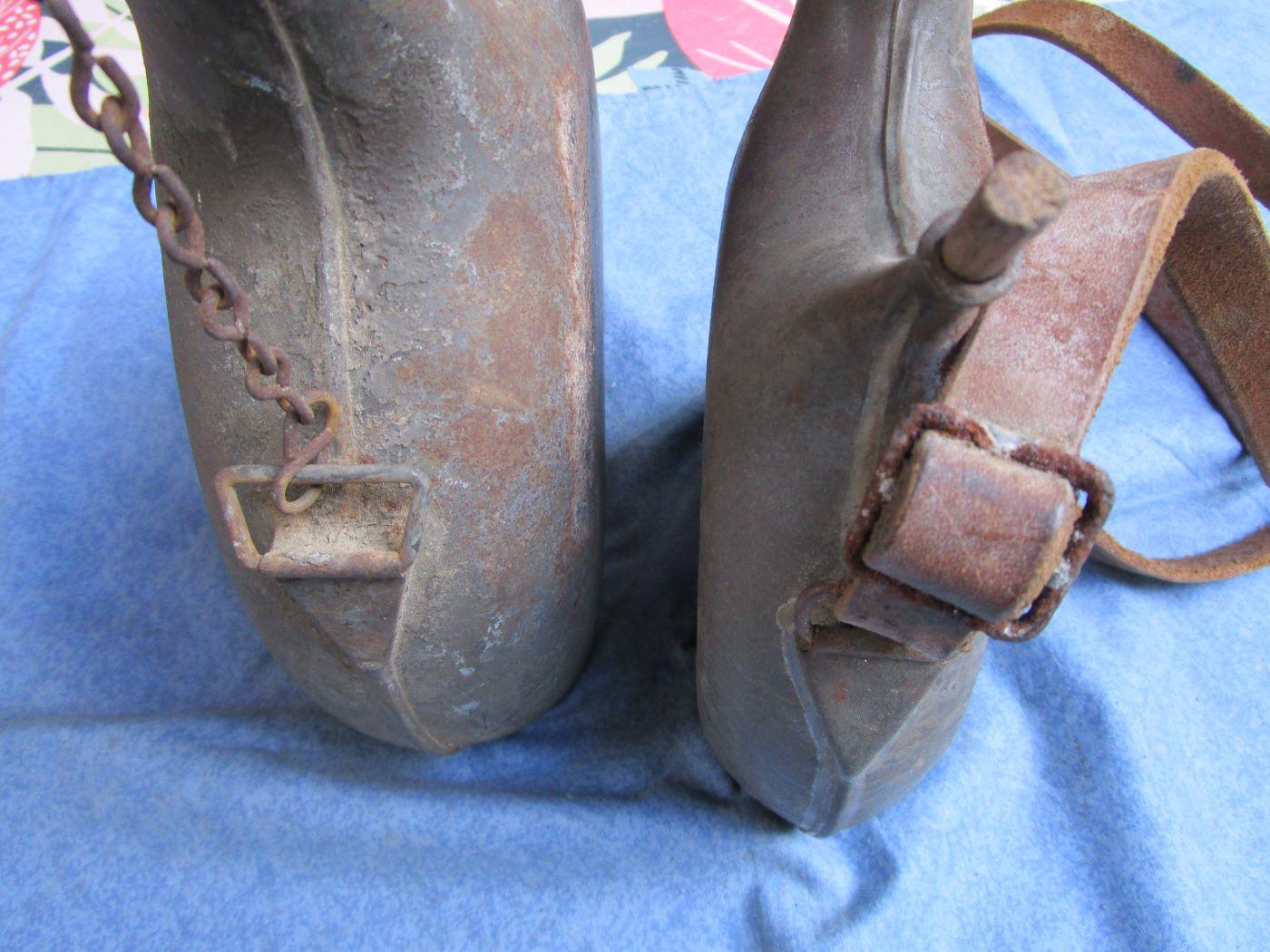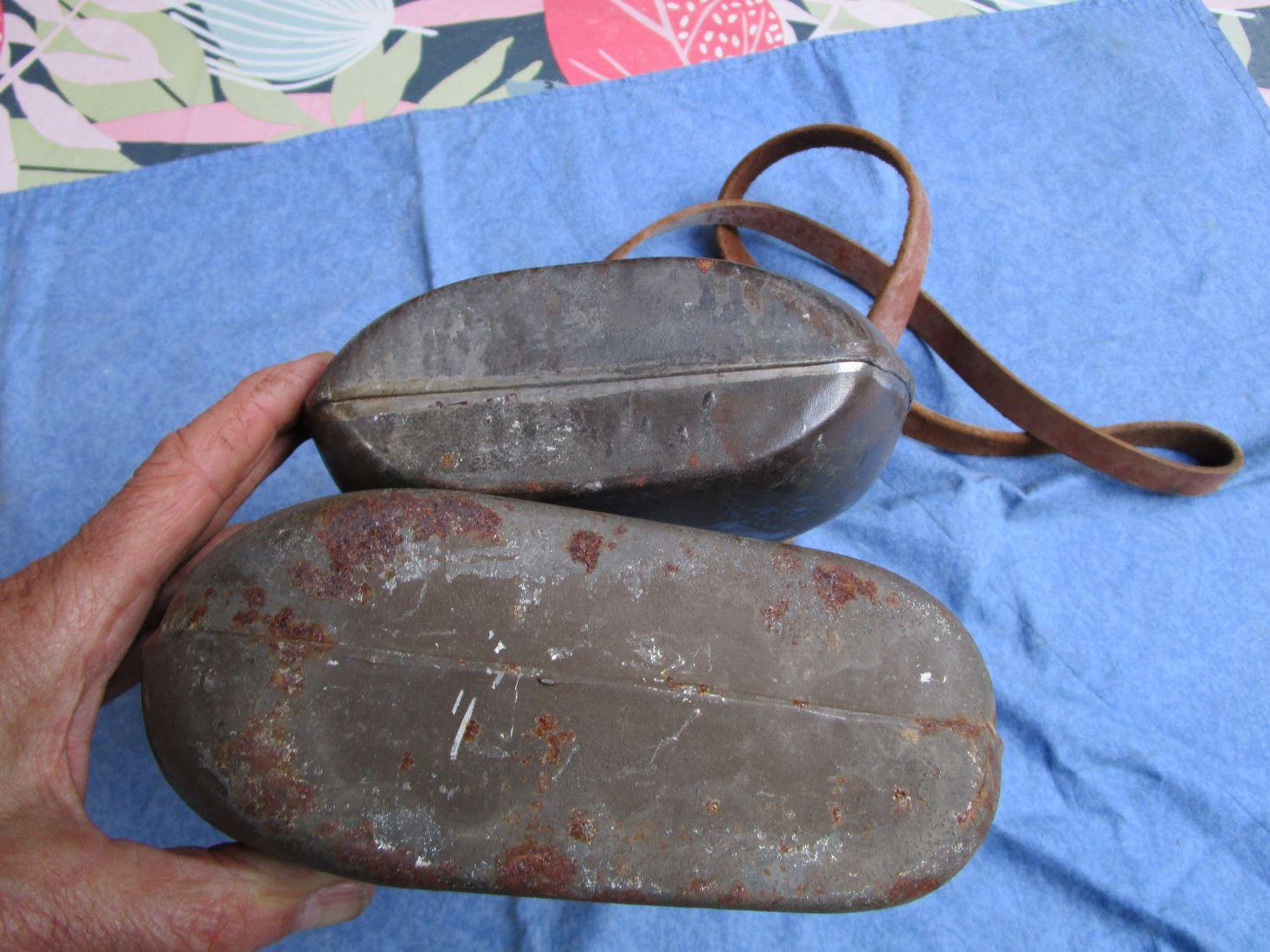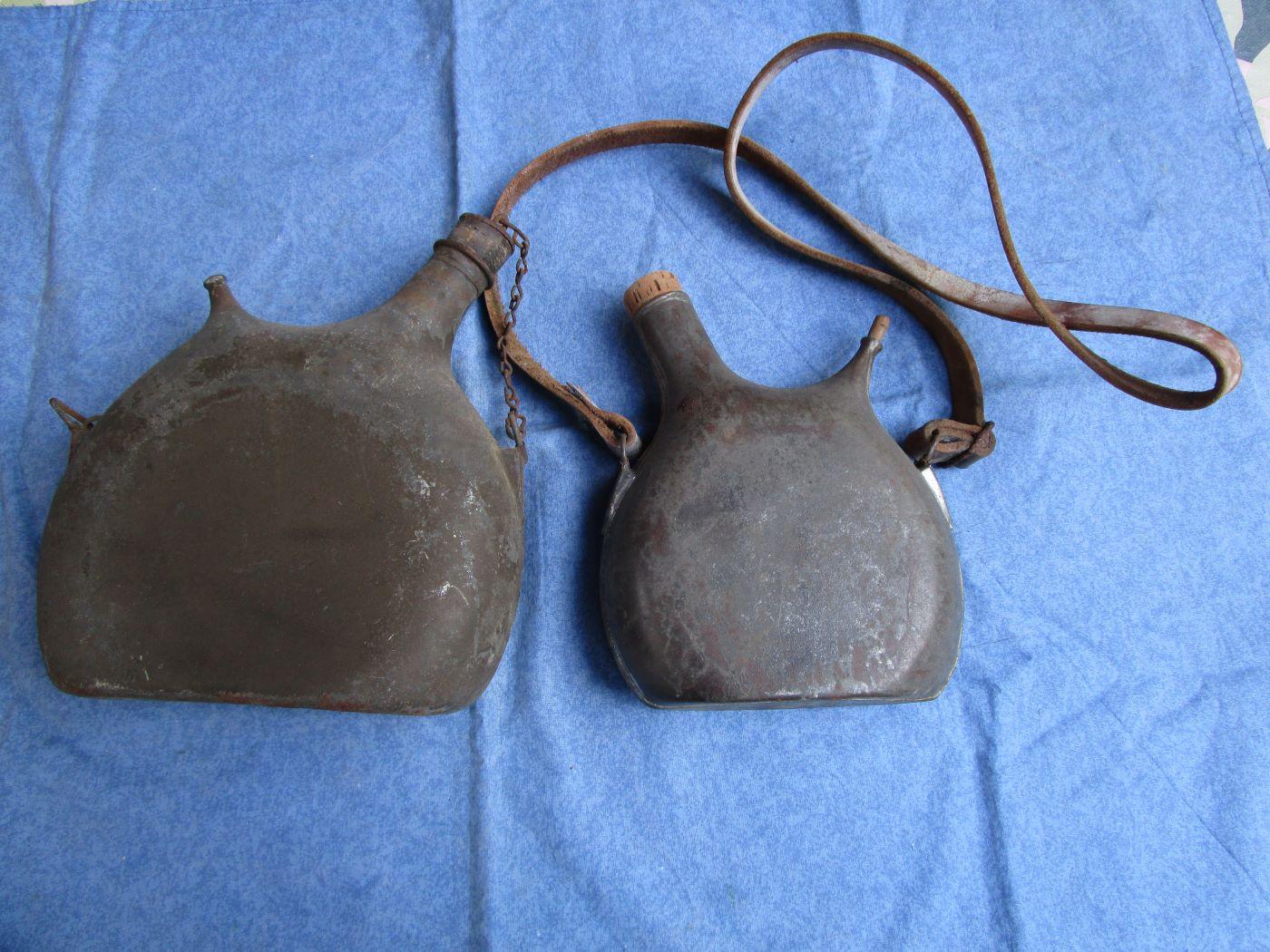Le bouchon n'est pas d'origine sur le petit. Aucun trou. Cuir de la bretelle épais, certainement un ersatz. Marquage fabricant sur le 1 litre.Reste de peinture kaki sur le 2 litres. Autres photos sur demande. Prévoir 10.70 euros en colissimo ou 7. euros par mondial relay. Prix pour les deux pièces