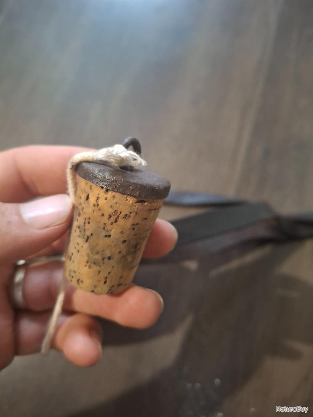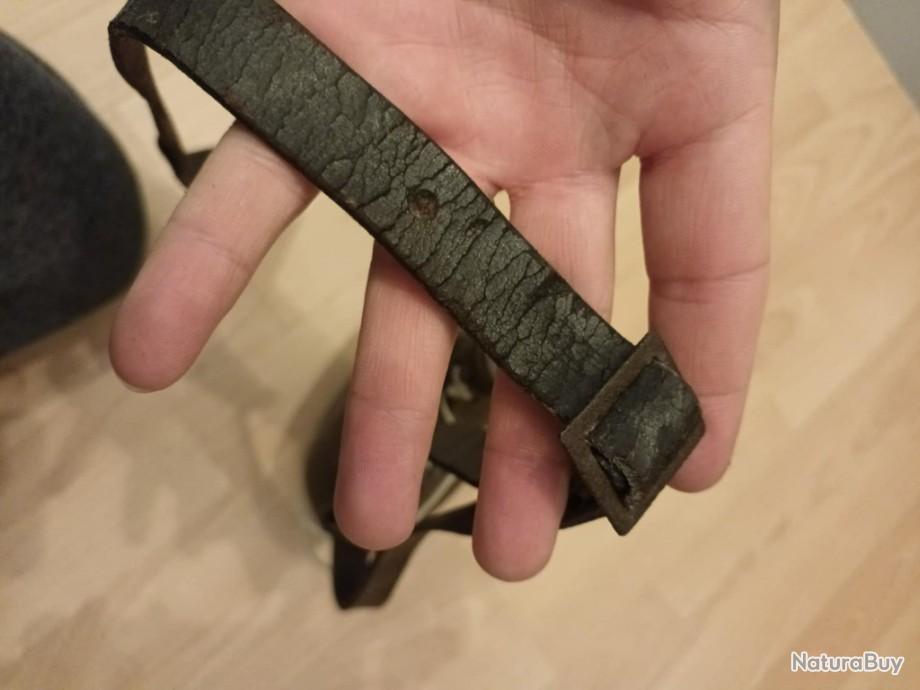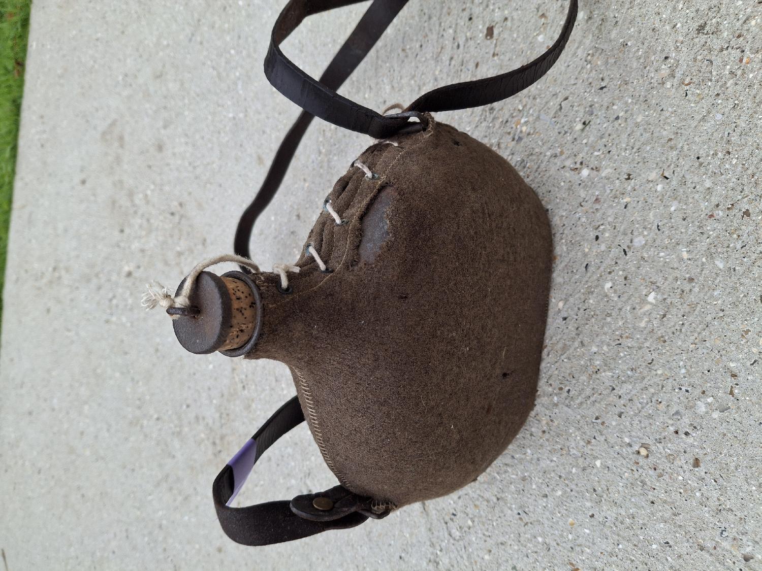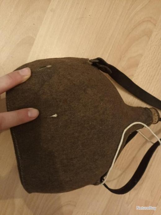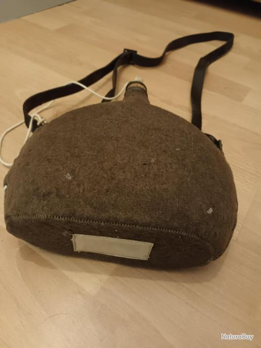 Gourde militaire Française seconde guerre mondiale avec sa housse de protection en tissu moutarde, son bouchon d'origine, sa sangle de transport et les fils de fermeture de la gourde.