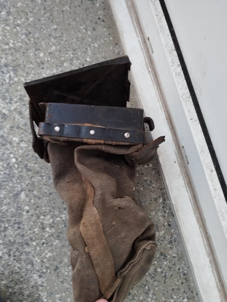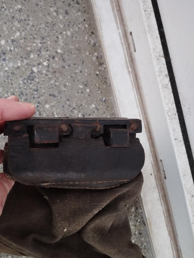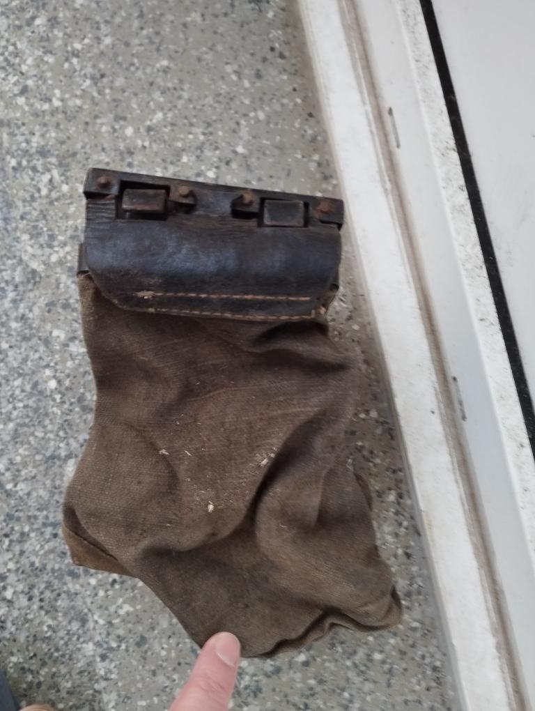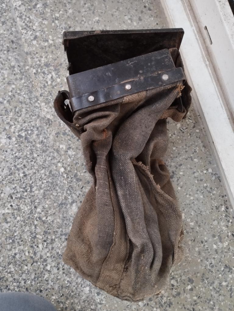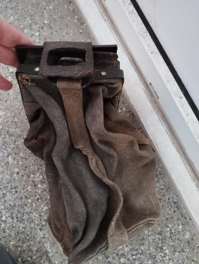 La toile est présente. La charnière cuir et le dispositif de fermeture sont HS (cuirs secs) mais les morceaux sont présents.