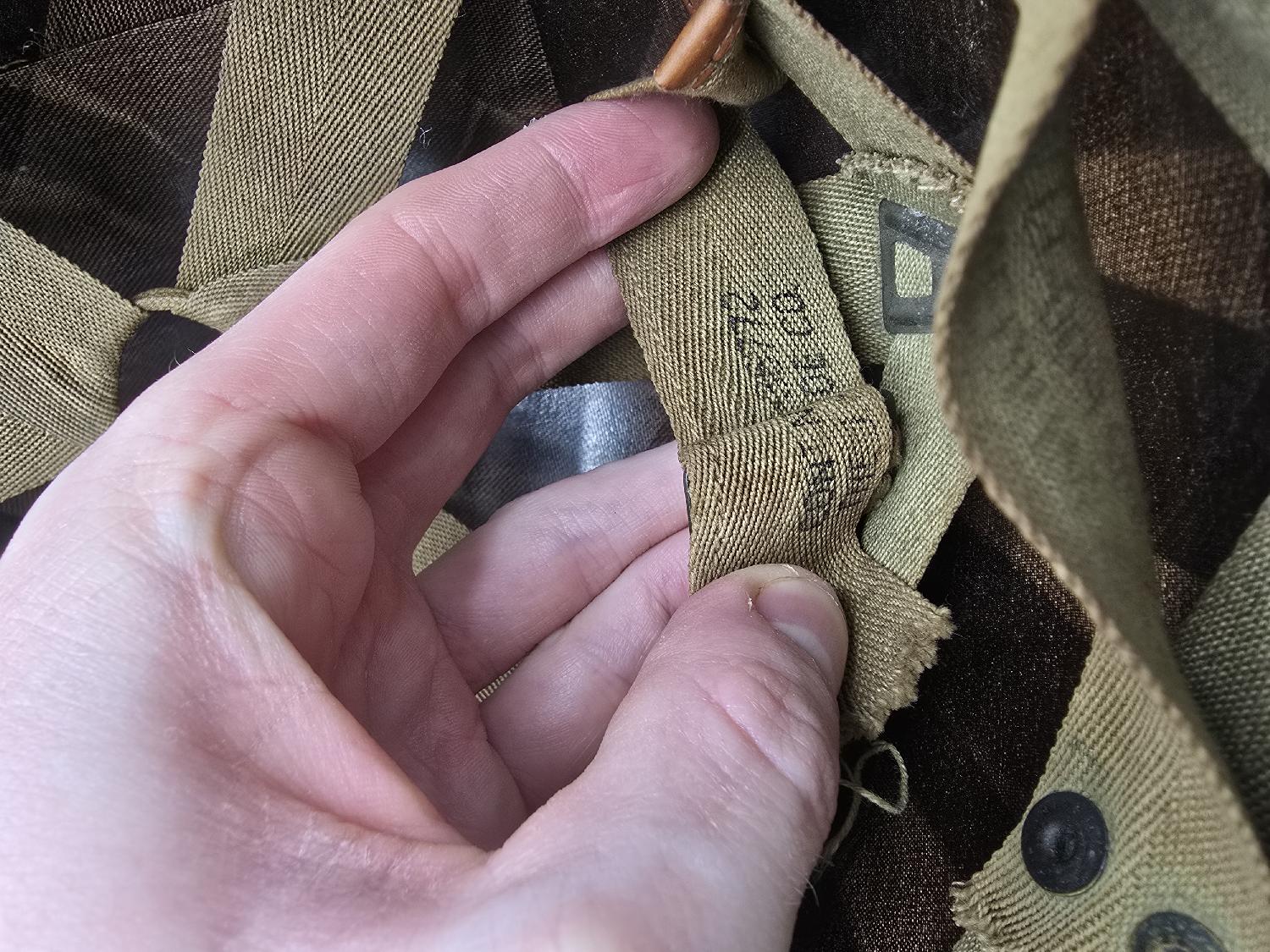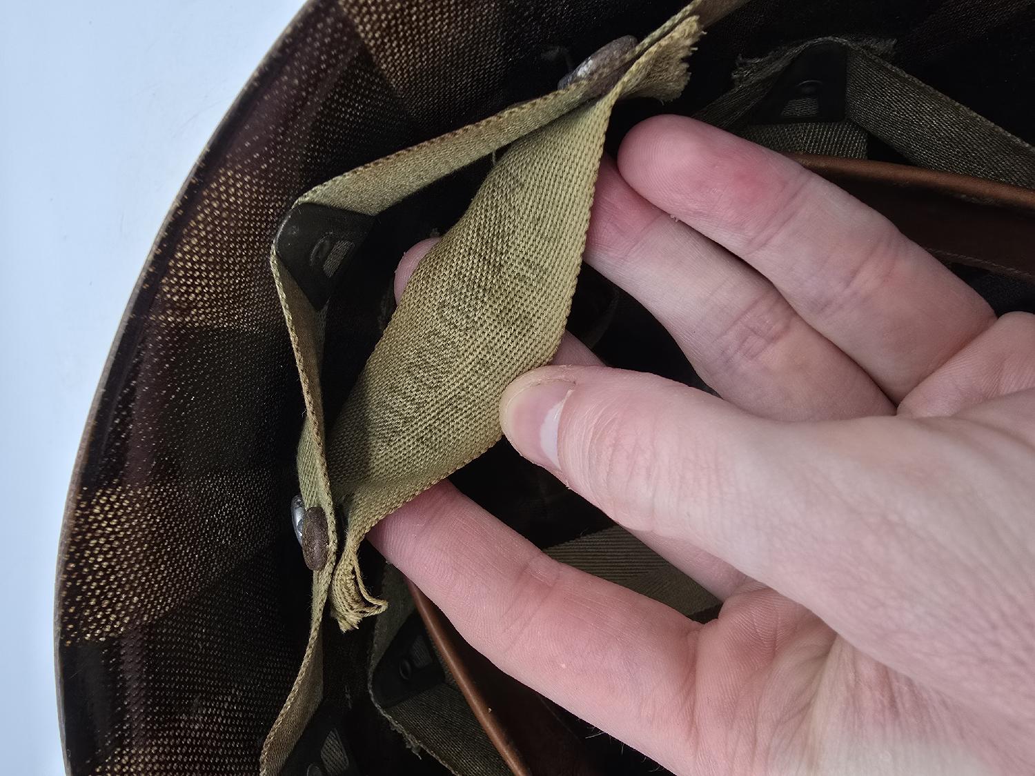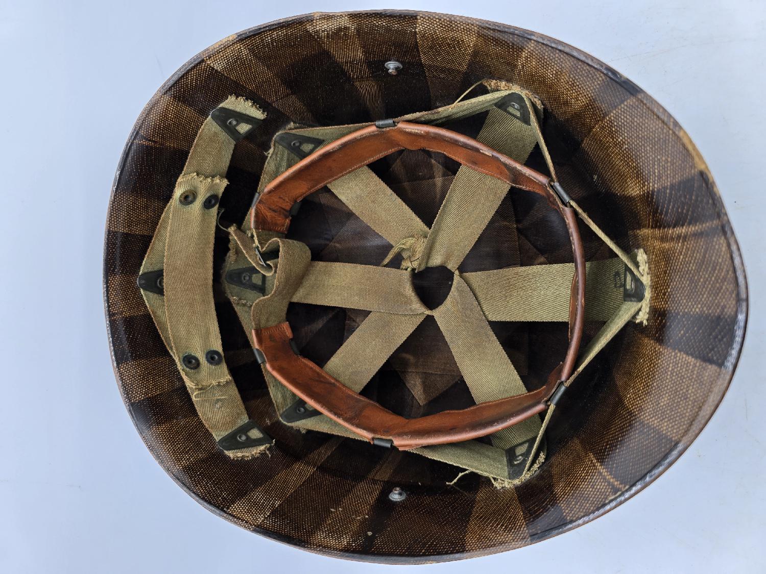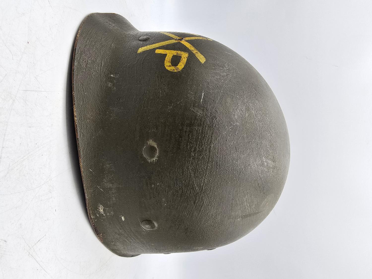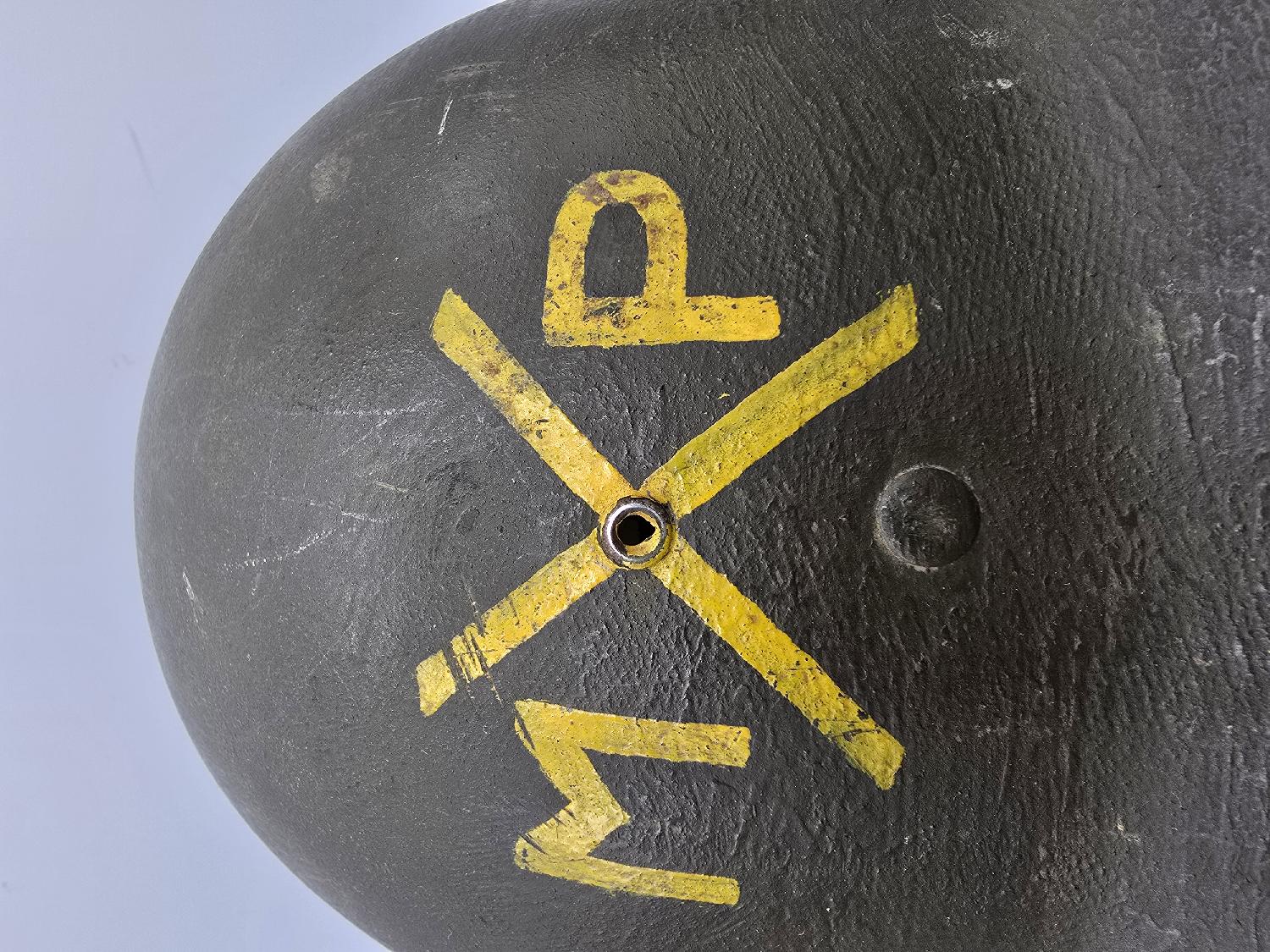 Magnifique sous casque US M1 de Military Police de l'armée américaine. Ici peint en jaune. Croix signification inconnu. Marquages au crayon de papier sur le dessus.