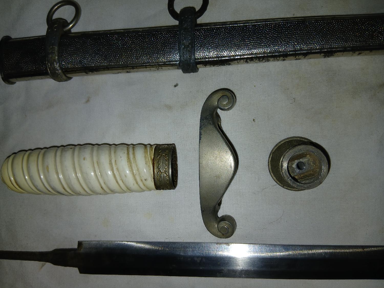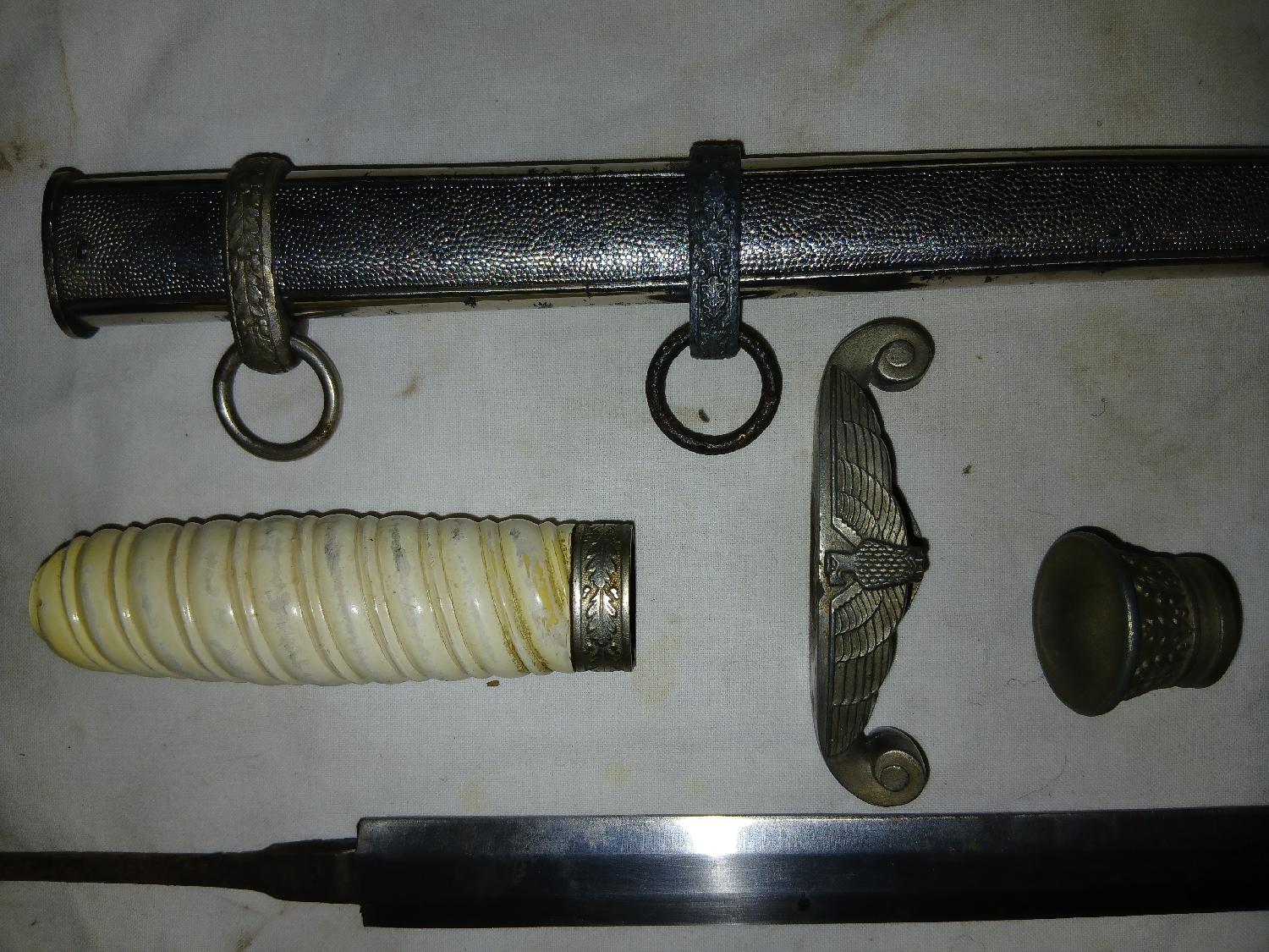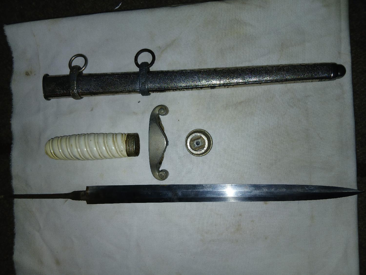 Lot de pièces pour dague WH. Etuis avec sa vis. Lame non marquée du fabricant mais marquage sur la soie. Poignée avec quelques petites rayures. Aigle avec croix cassé ( dénazifié). Vis de poignée.