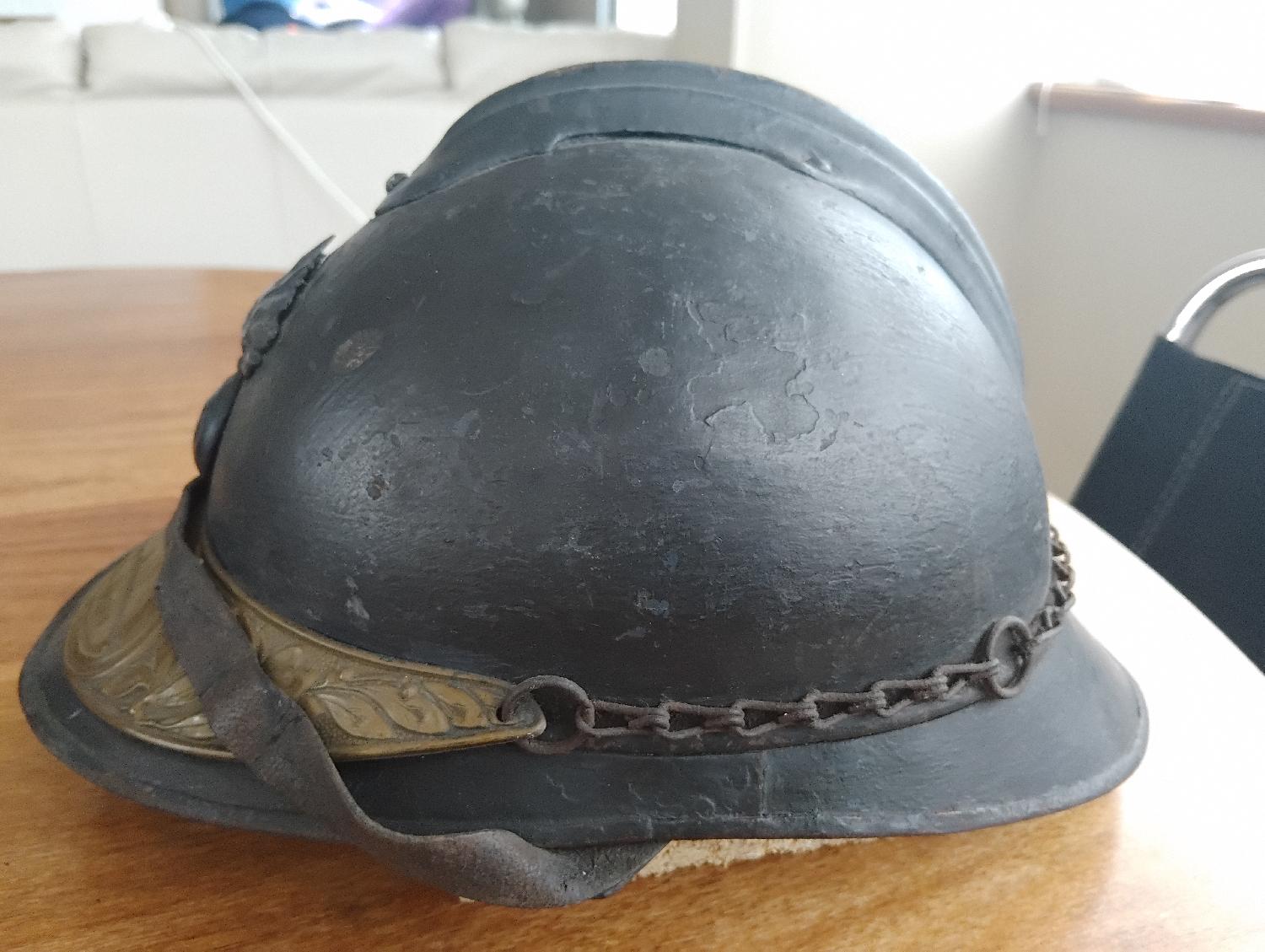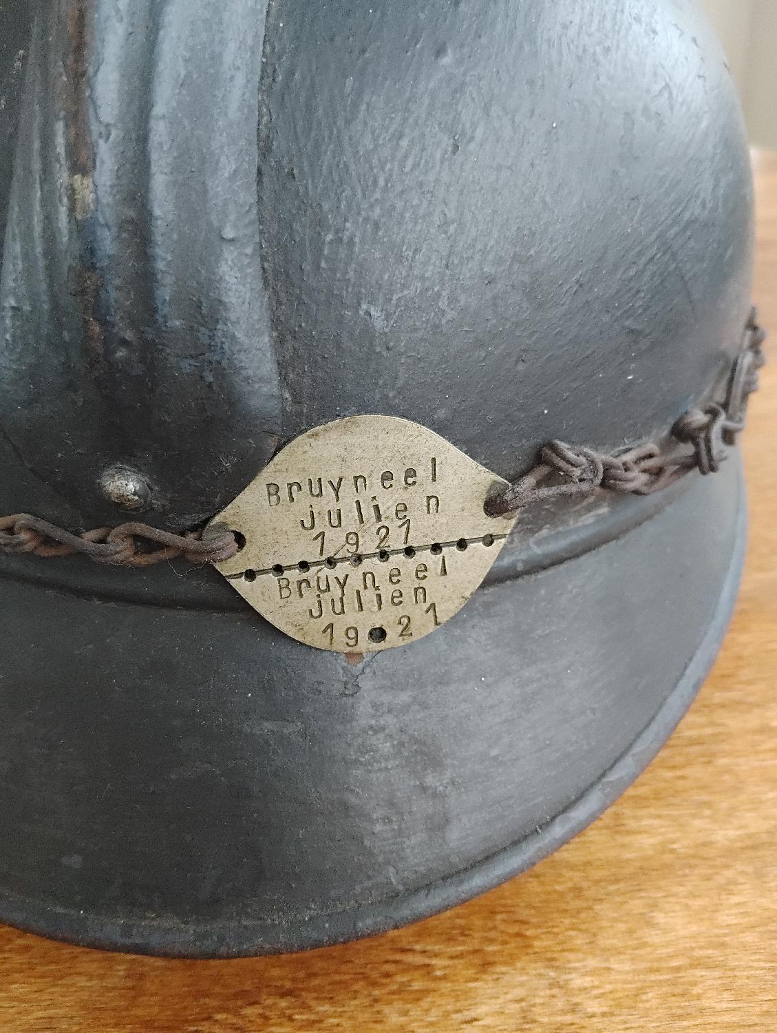 Vend beau casque Adrian model 15 infanterie bleu nuit avec jugulaire , plaque " grande guerre " tenu par une chaîne avec plaque ID " bruyneel Julien 1921 " la plaque est la chaîne n'a aucun jeu , elle ne bouge pas d'un poil intérieur doublure tissu rouge garance