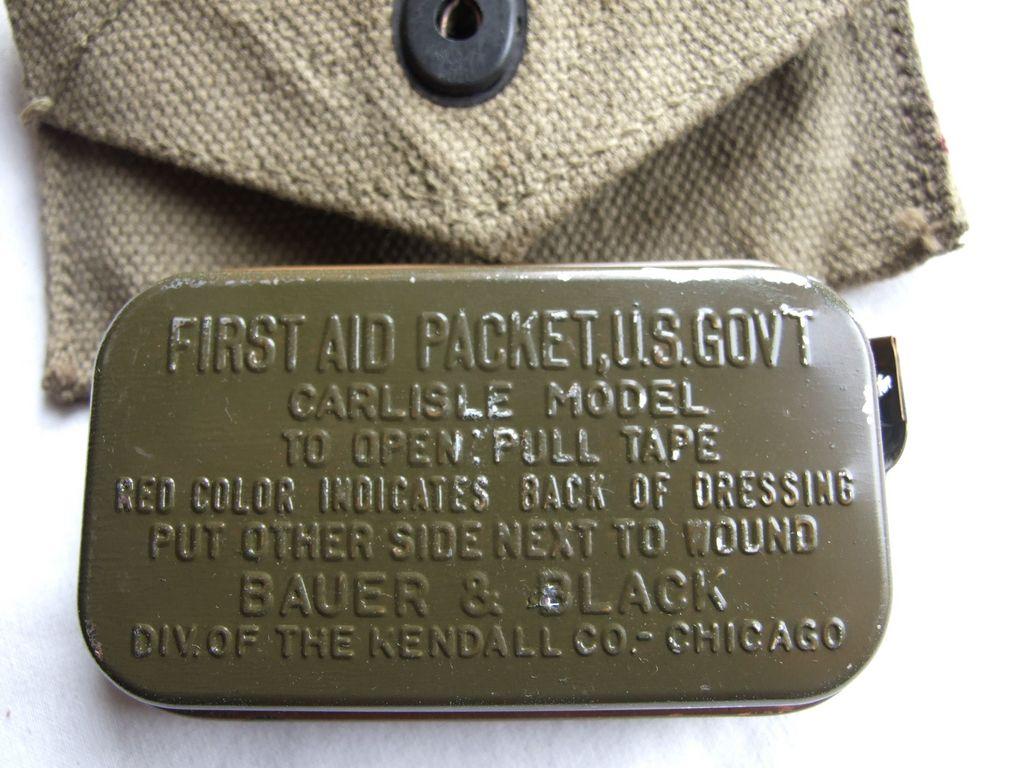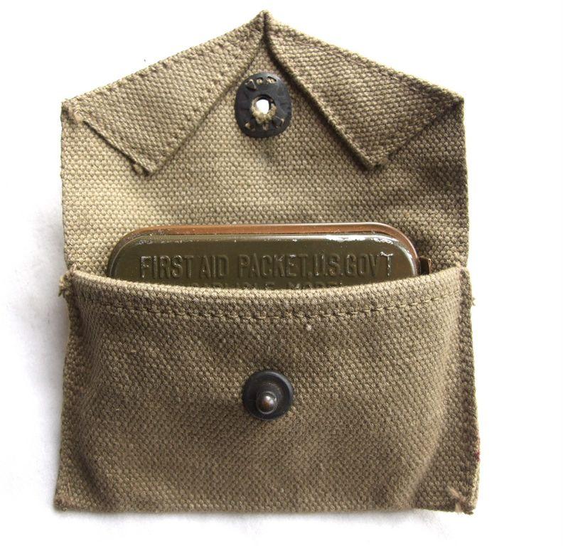 Pochette à pansement M-1924 datée 1943 avec un pansement en boîte métallique