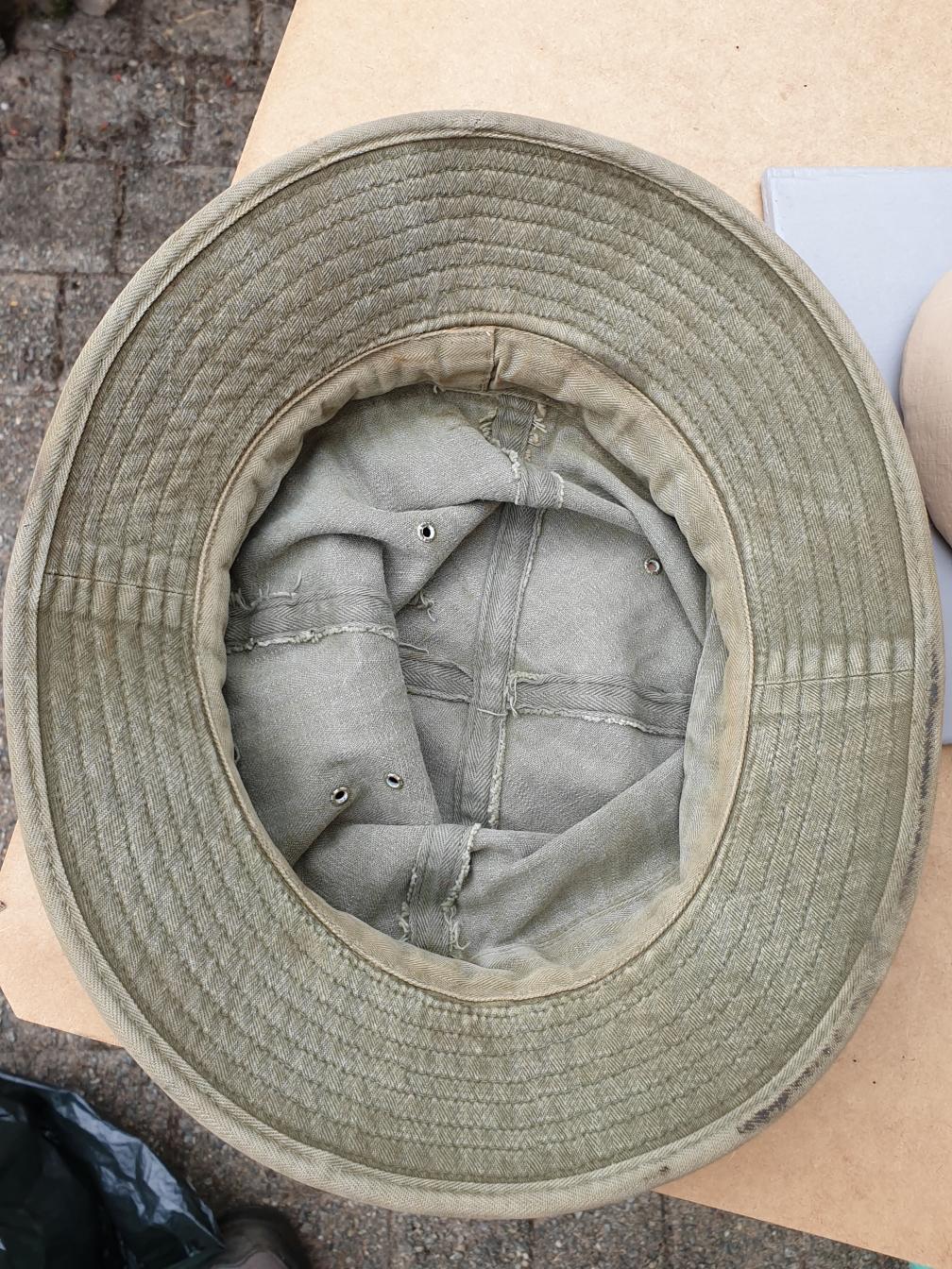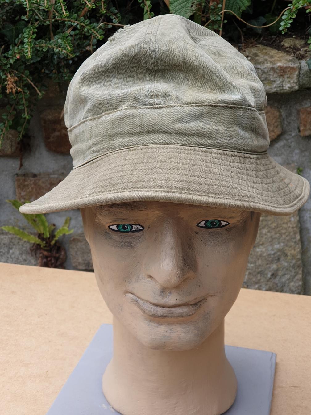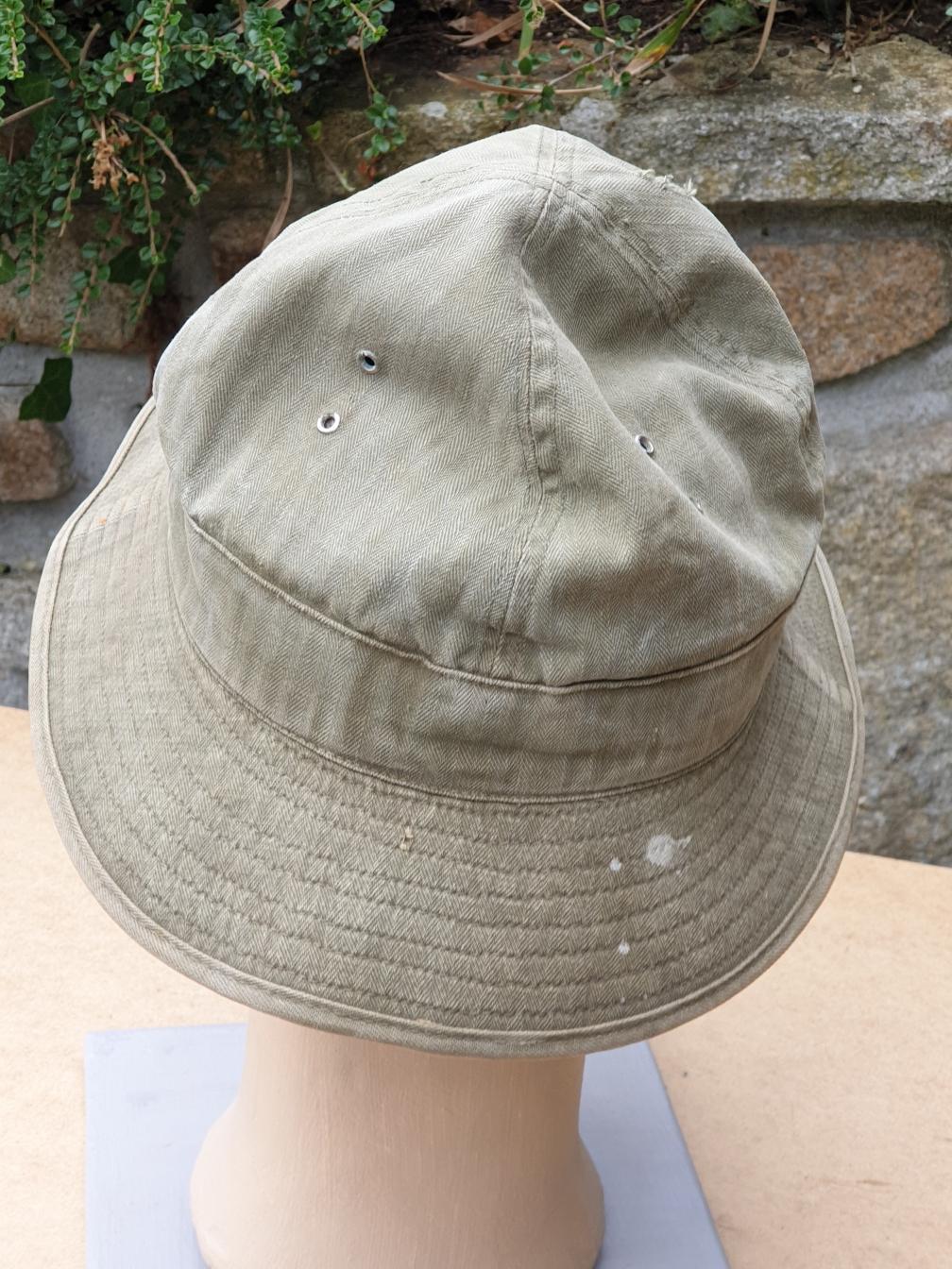 Chapeau de l'US Army Daisie Mai WW2 1942 HBT présentant quatre œillets d'aération. Adopté en janvier 1941 pour accompagner la tenue de treillis deux pièces, il doit être porté bord rabattu, modèle classé « Limited Standard » en juillet 1943. Pièce de terrain, tour de tête 54. A noter une entaille de 2 cm sur le côté.