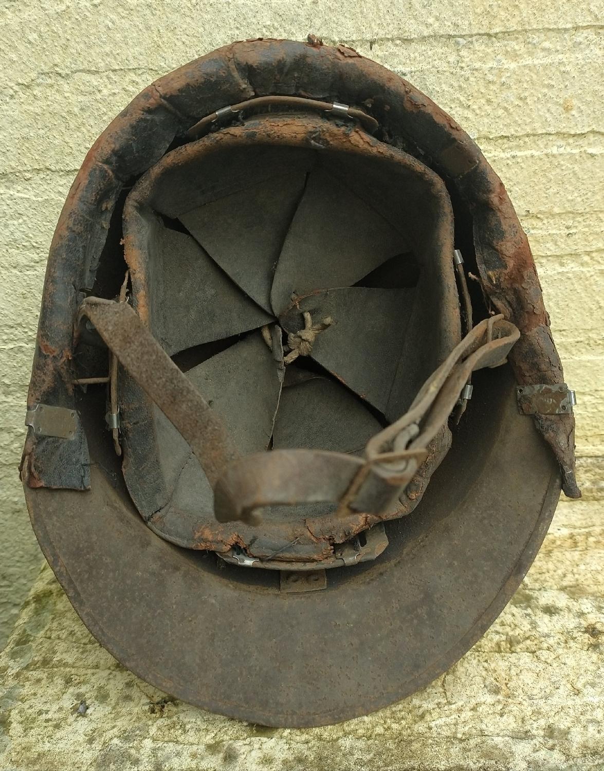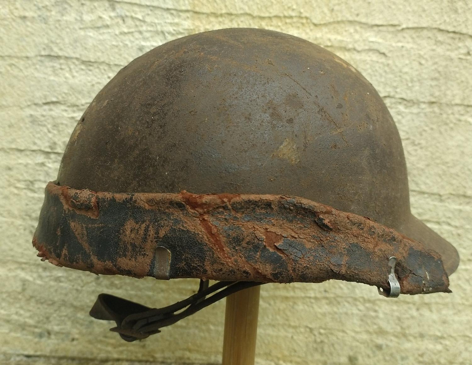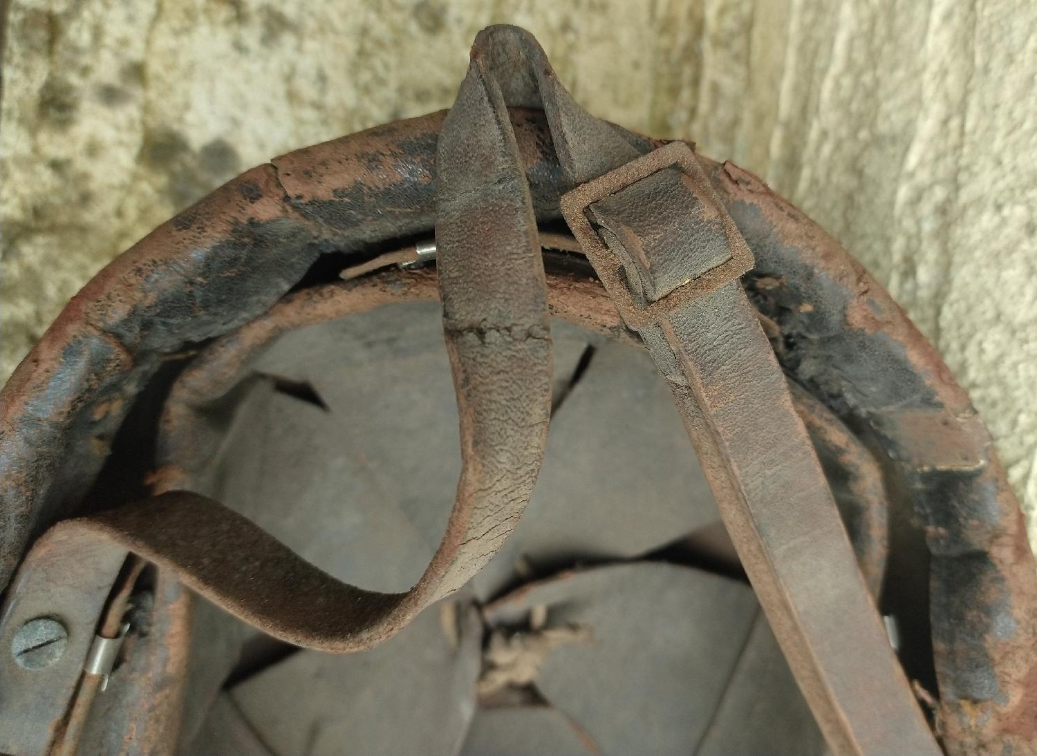 Casque Adrian 26 modifié; suppression du cimier, visière avant coupée, adjonction d'un bourrelet en cuir tenu par des agrafes de coiffe...modification d'époque et transitoire inspirée des casques mdl 26/27 et 31, avant l'adoption du mdl 35.