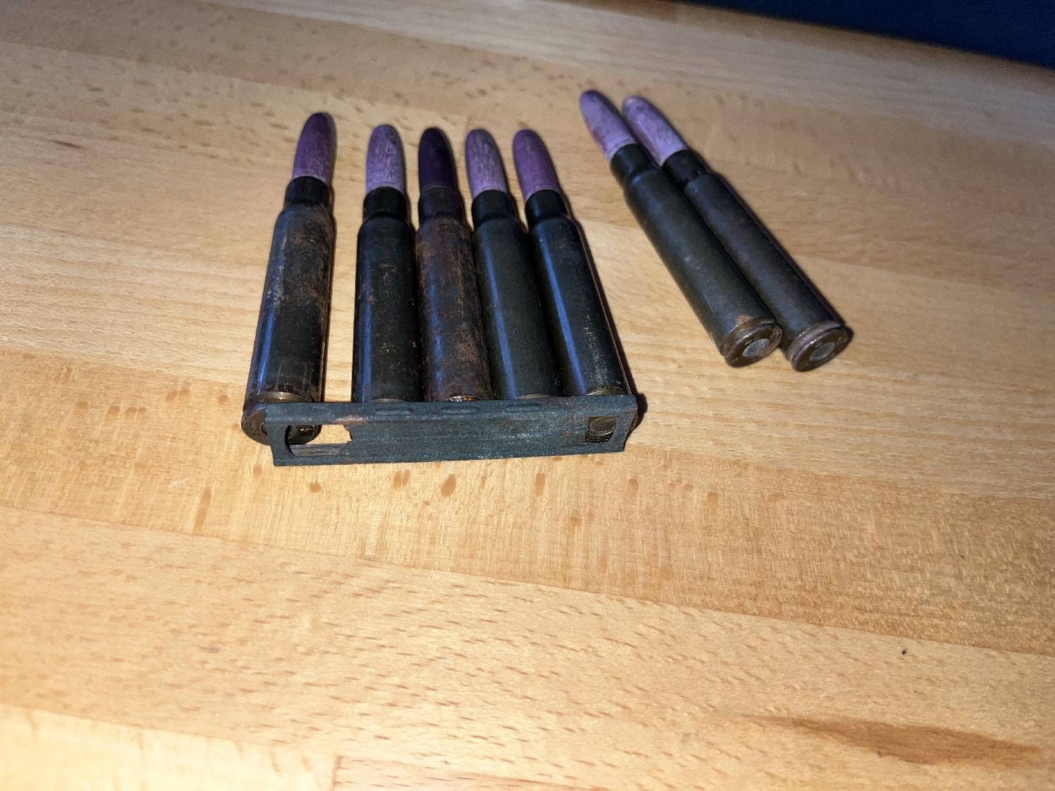 7 cartouches d'exercice Mauser 98K et lame chargeur.