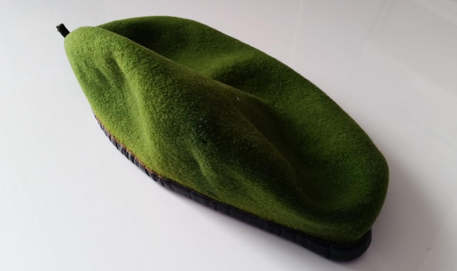 Béret vert de la Légion étrangère. 100% pure laine vierge. Marque « spécial commandos ». Bord renforcé par du cuir noir. Sans insigne. Attribué. Etat porté.