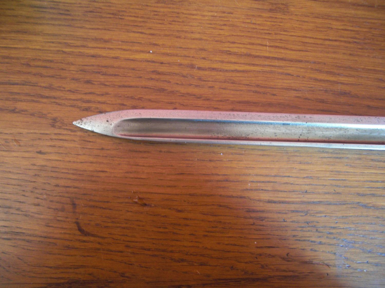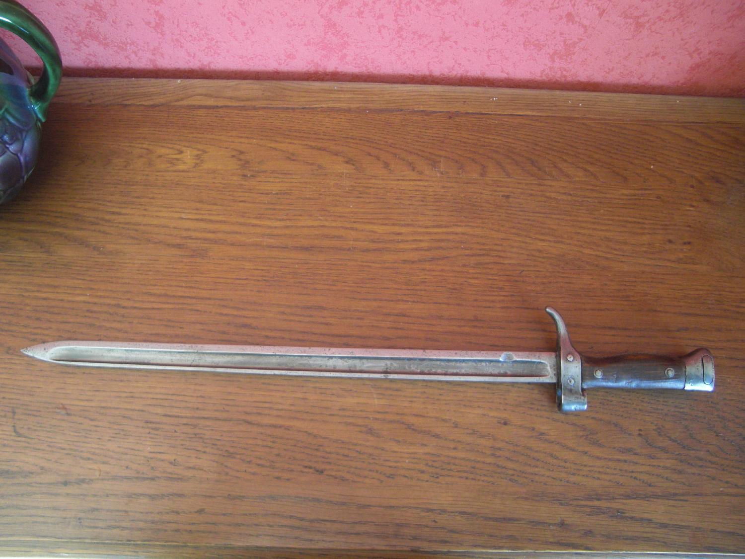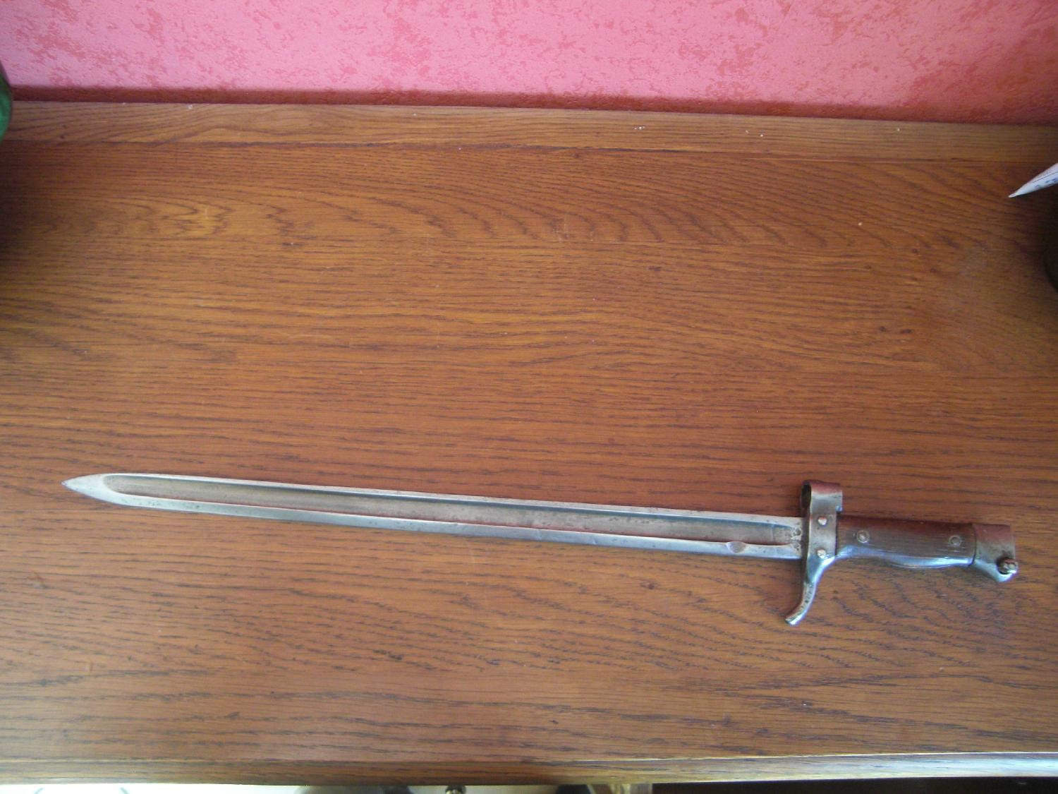 baïonnette réglementaire pour mousqueton Berthier modèle 1892, lame à gouttière en bon état, poignée bois à deux rivets saine, verrou arrière fonctionnel, baïonnette solide et conforme au modèle d'époque, très bon état général, vendue sans fourreau, vente en France uniquement