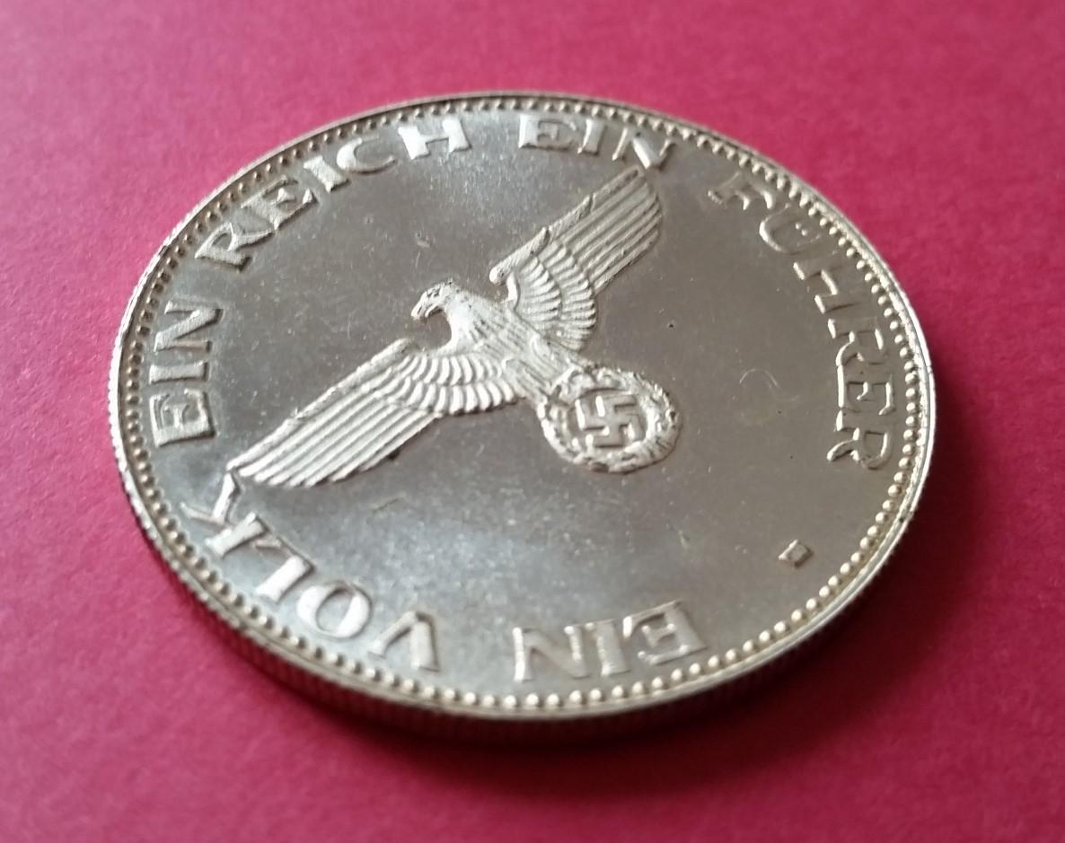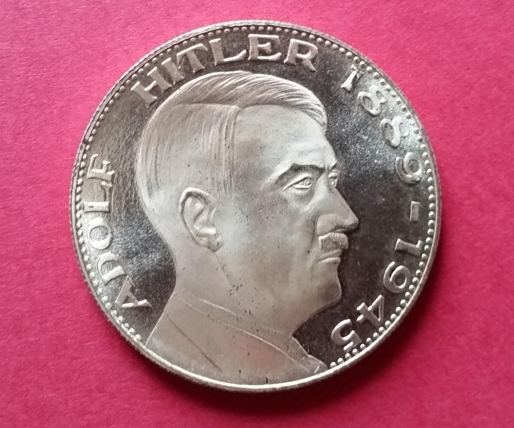 Médaillon commémoratif après-guerre en métal argenté à l'effigie d'Adolf Hitler. Gravure en relief avec marquage « Ein Volk, Ein Reich, Ein Führer ». Très bon état. Diamètre de 3,5 cm.
