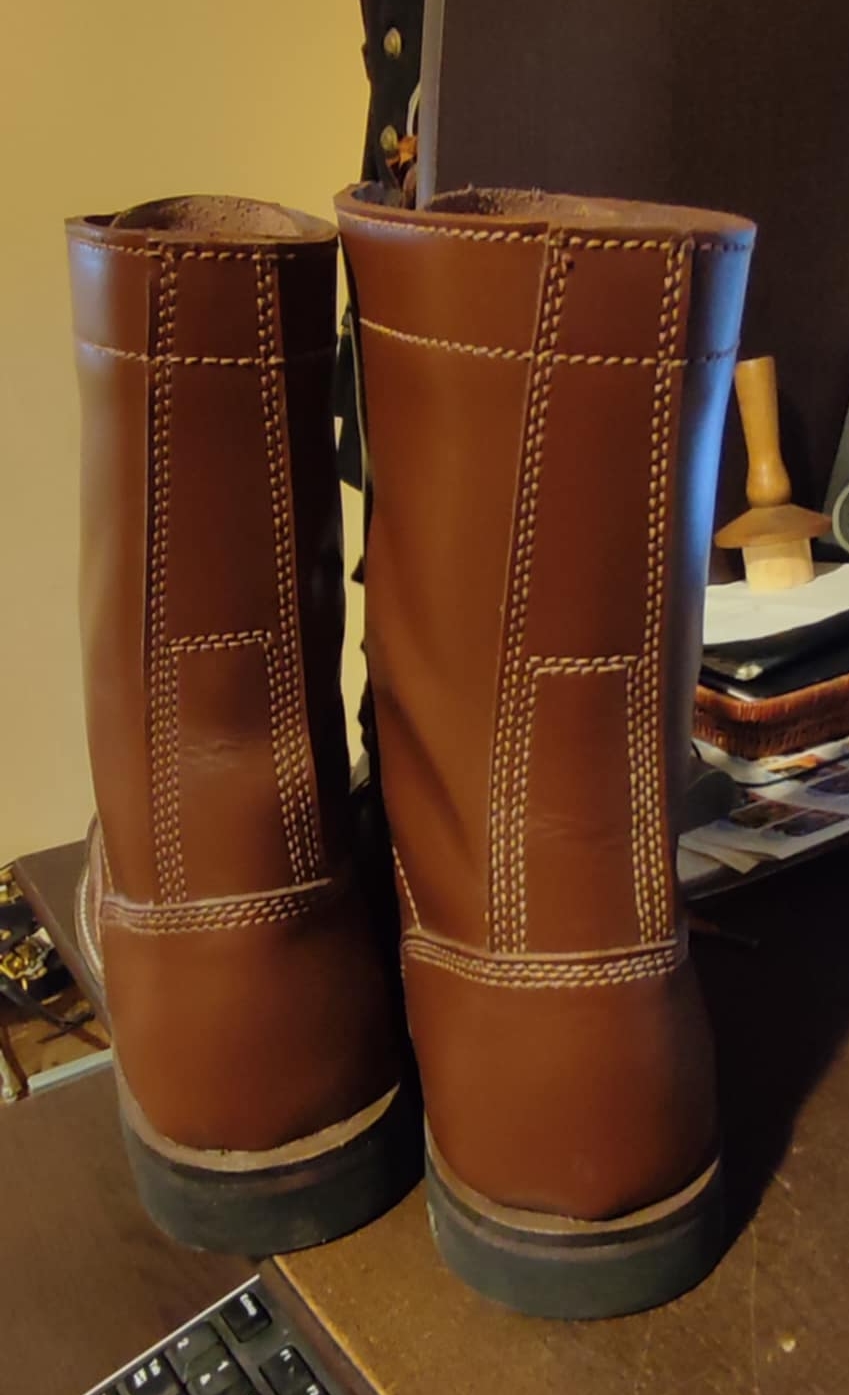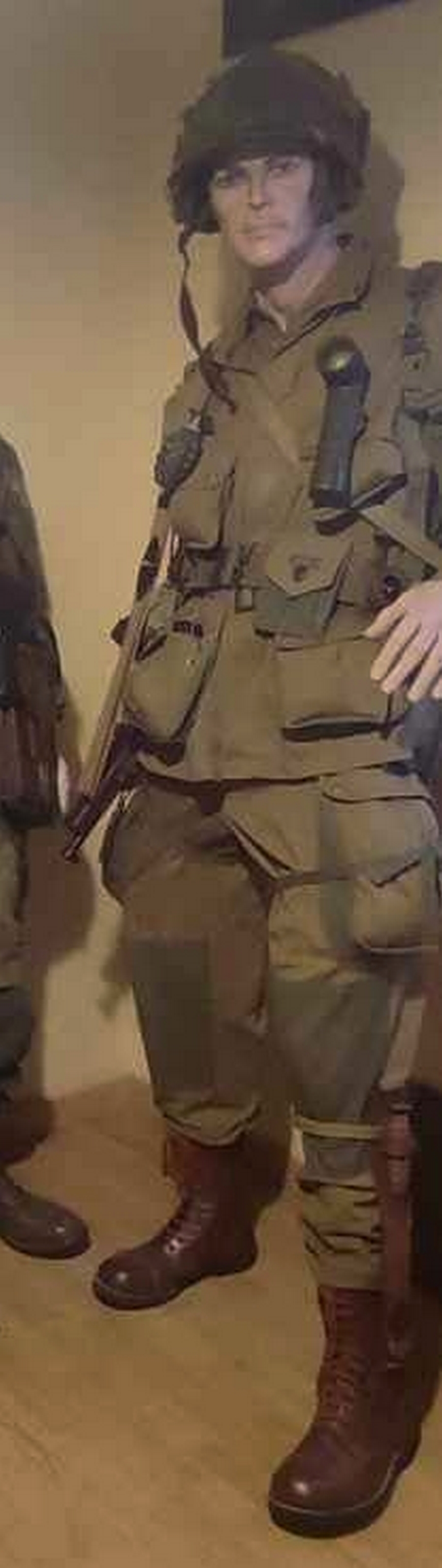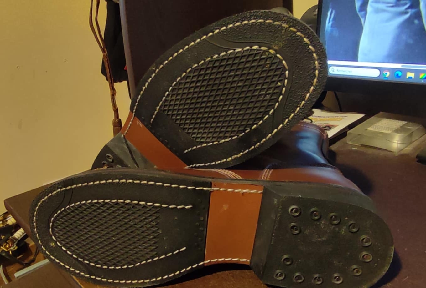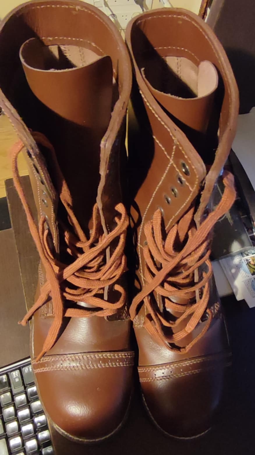 Bottes de saut (jump boots) pour parachutistes américains. Elles sont dotées d'une tige en cuir marron roux, d'embouts, de 12 œillets, de semelles en cuir et de talons inclinés. Elles sont livrées avec des lacets en tissu, la taille est 44. Neuves, jamais servies sauf sur un mannequin.