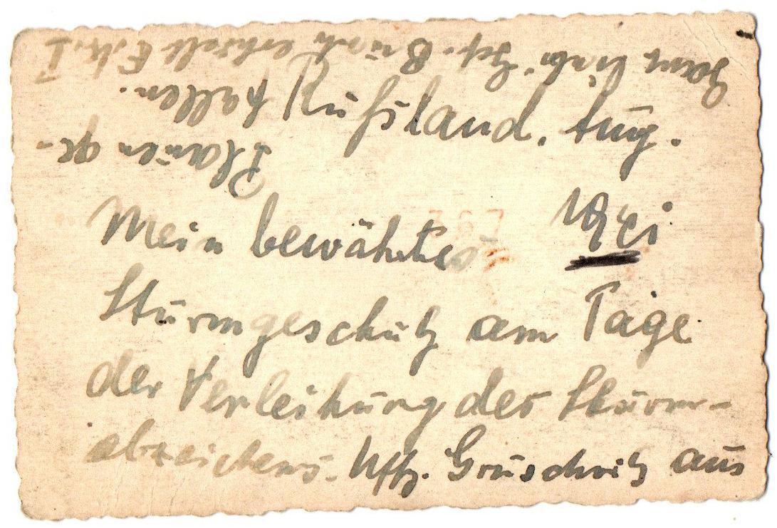 "Russie, août 1941 Mon éprouvé Canon d'assaut (Sturmgeschütz) le jour de la remise de l'insigne de combat d'infanterie (Sturmabzeichen). Sous-officier (Uffz.) Gruschwitz de (Texte inversé en haut) : Bien affectueusement. Reçu la Croix de fer de 1ère classe (E.K. I)"