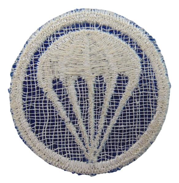 Insigne de calot de l'US Army, d'origine Deuxième Guerre, arborant un parachute blanc sur fond bleu (couleur commune à l'infanterie parachutiste).