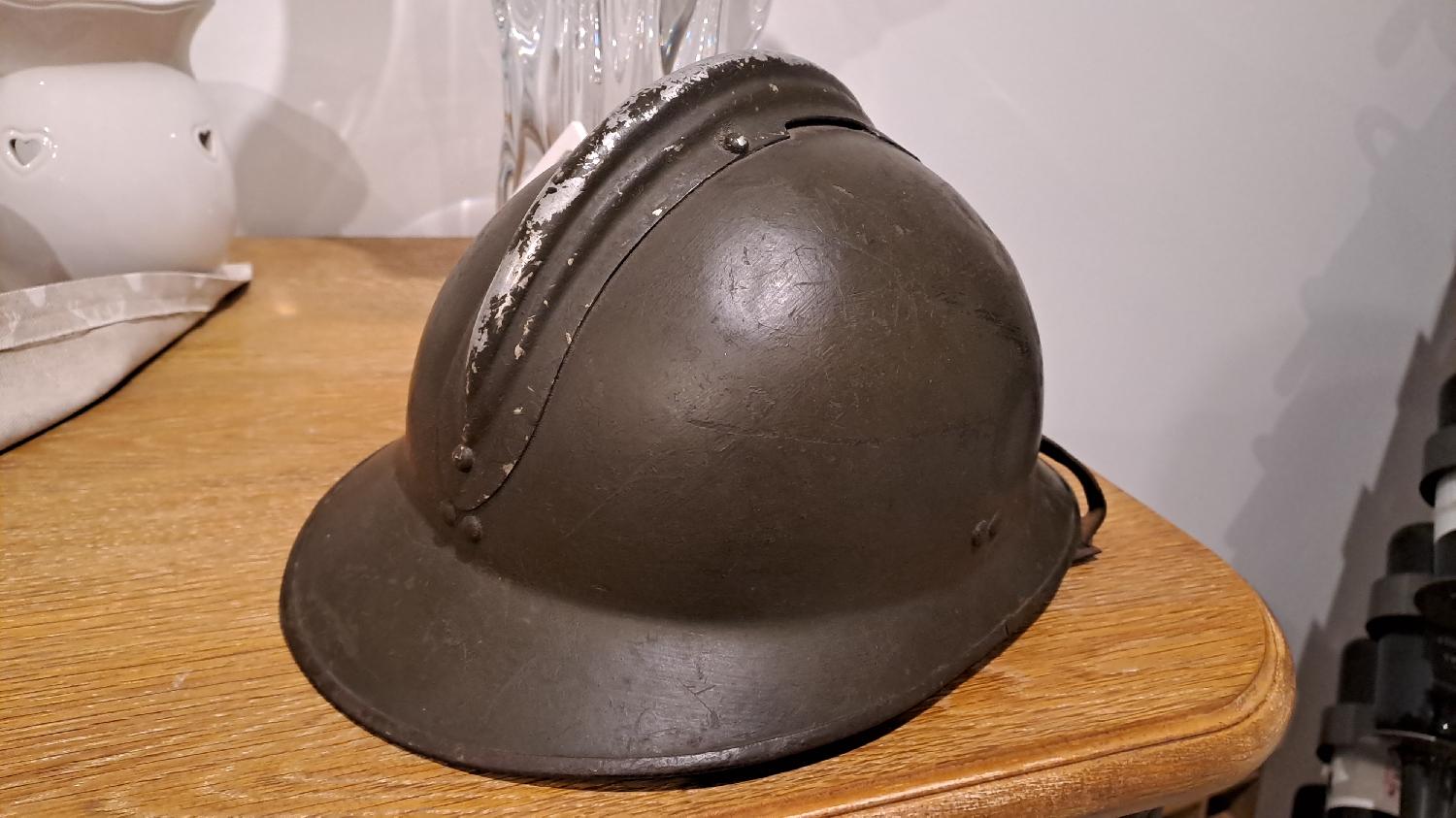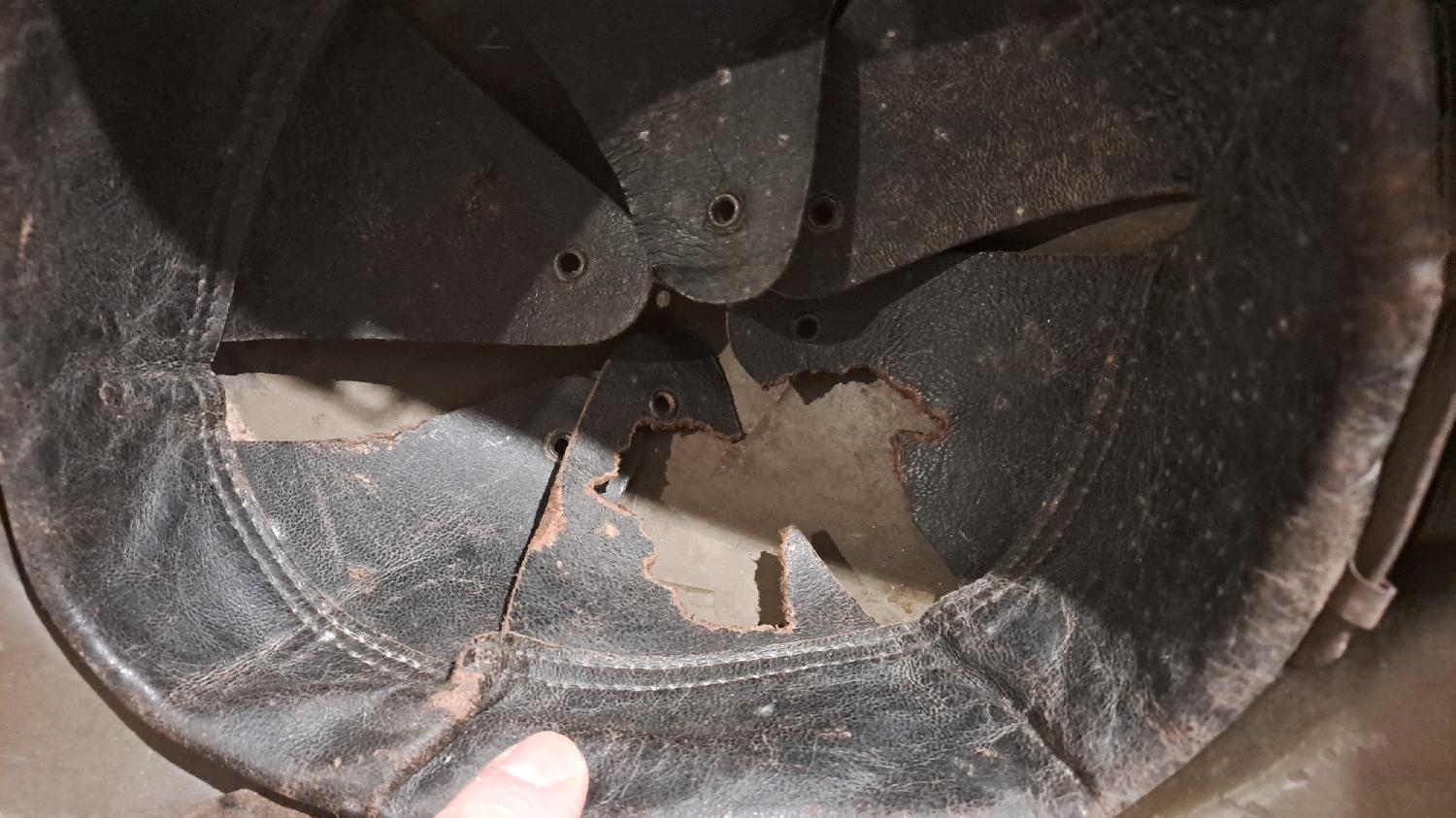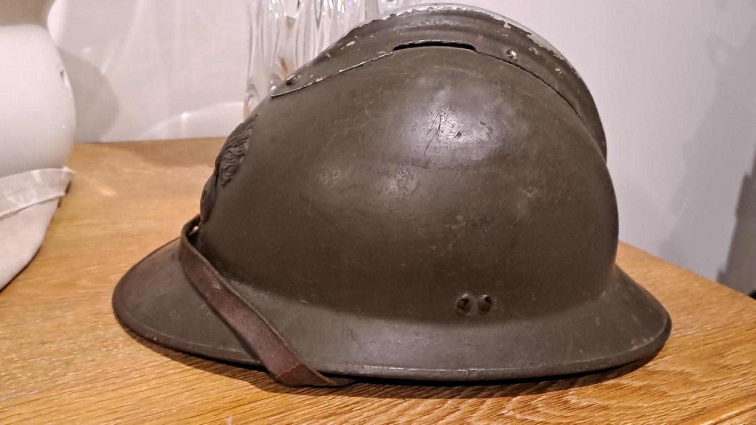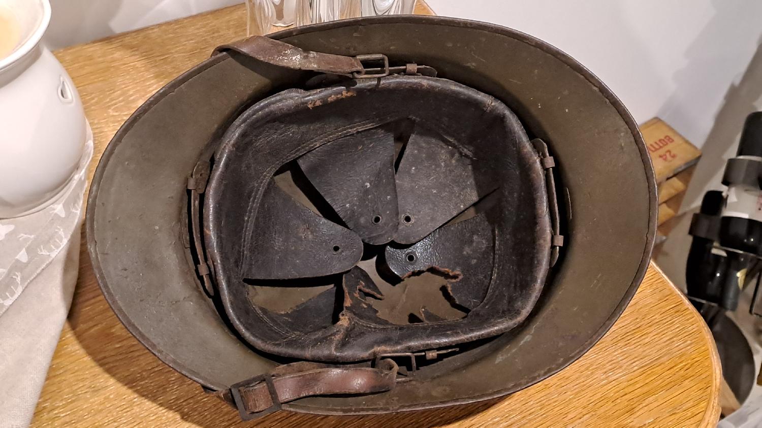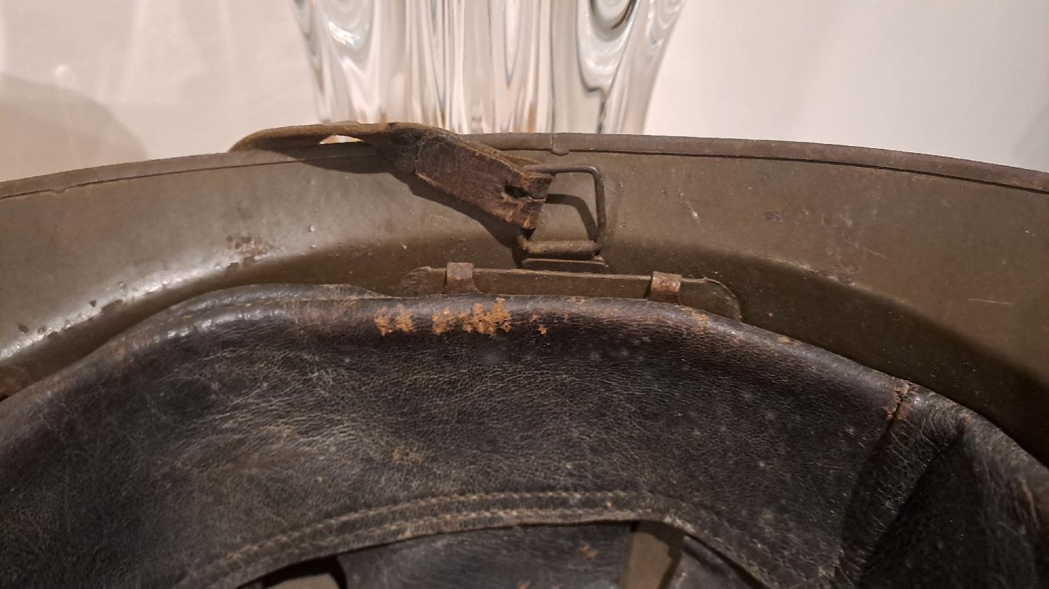 Superbe état, cuir un peu grignoté mais feutrine présente, attaches aussi, jugulaire d'origine manque le petit rivet bouton. Monté d'origine Intouché d'époque. Nominatif difficilement lisible dans la bombe.