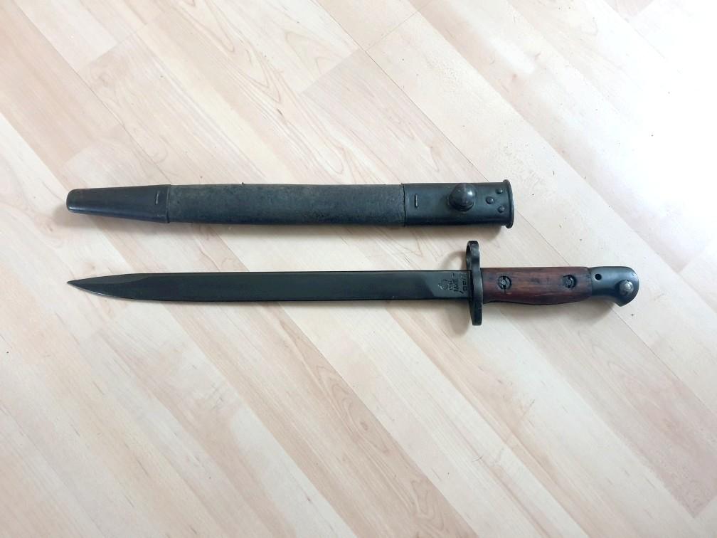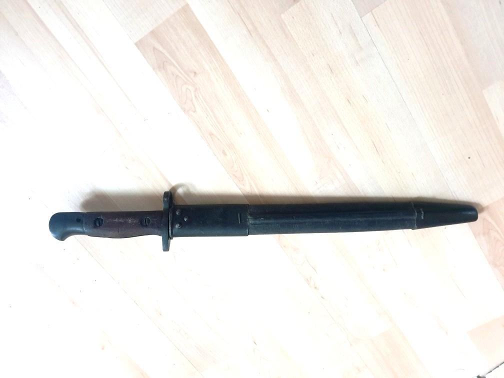 Baïonnette courte originale pour PM Lanchester datée 1943 avec son fourreau. Cet article convient aussi pour fusil Enfield. Beaux marquages, article en très bon état, bouton poussoir fonctionnel.