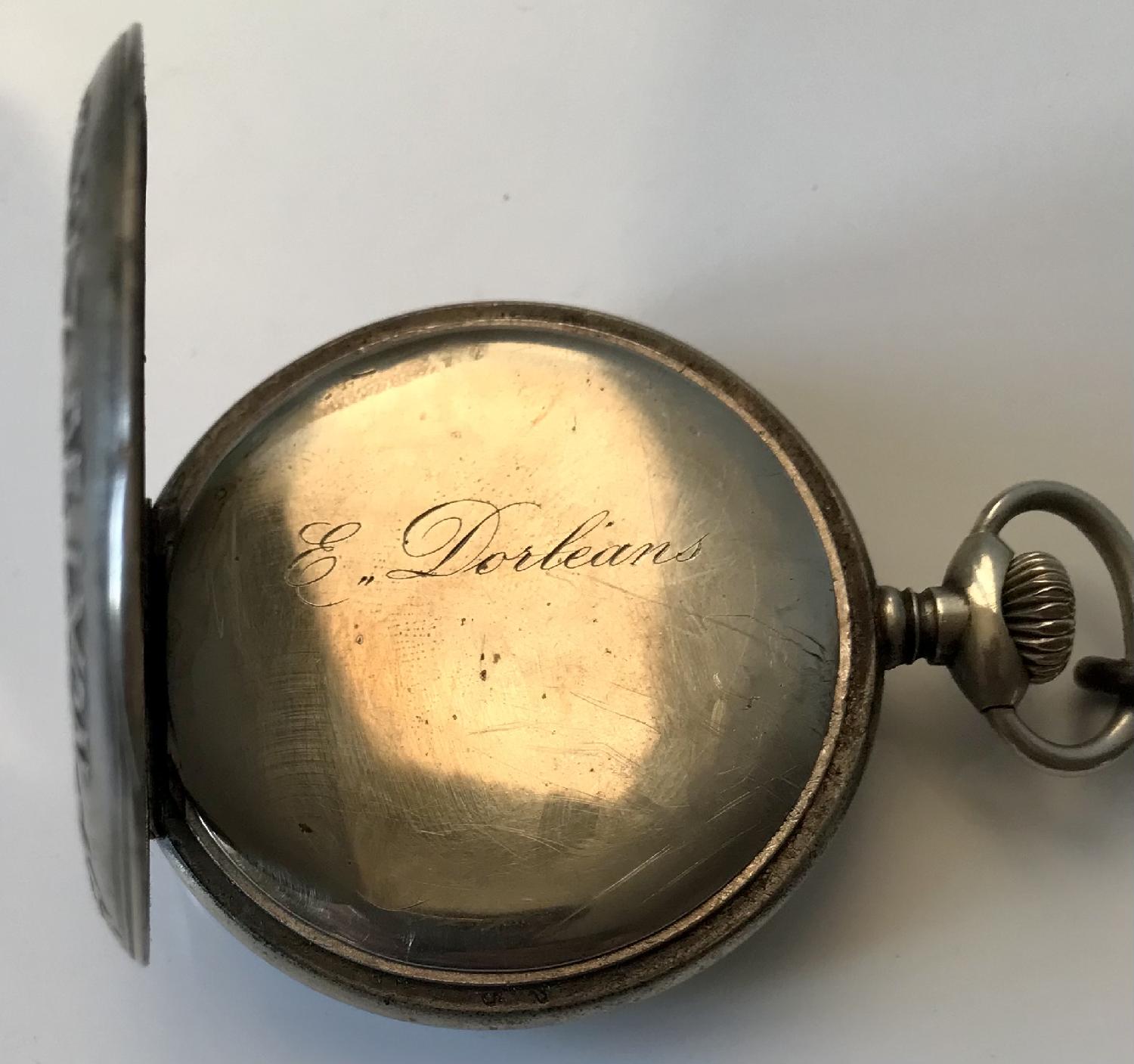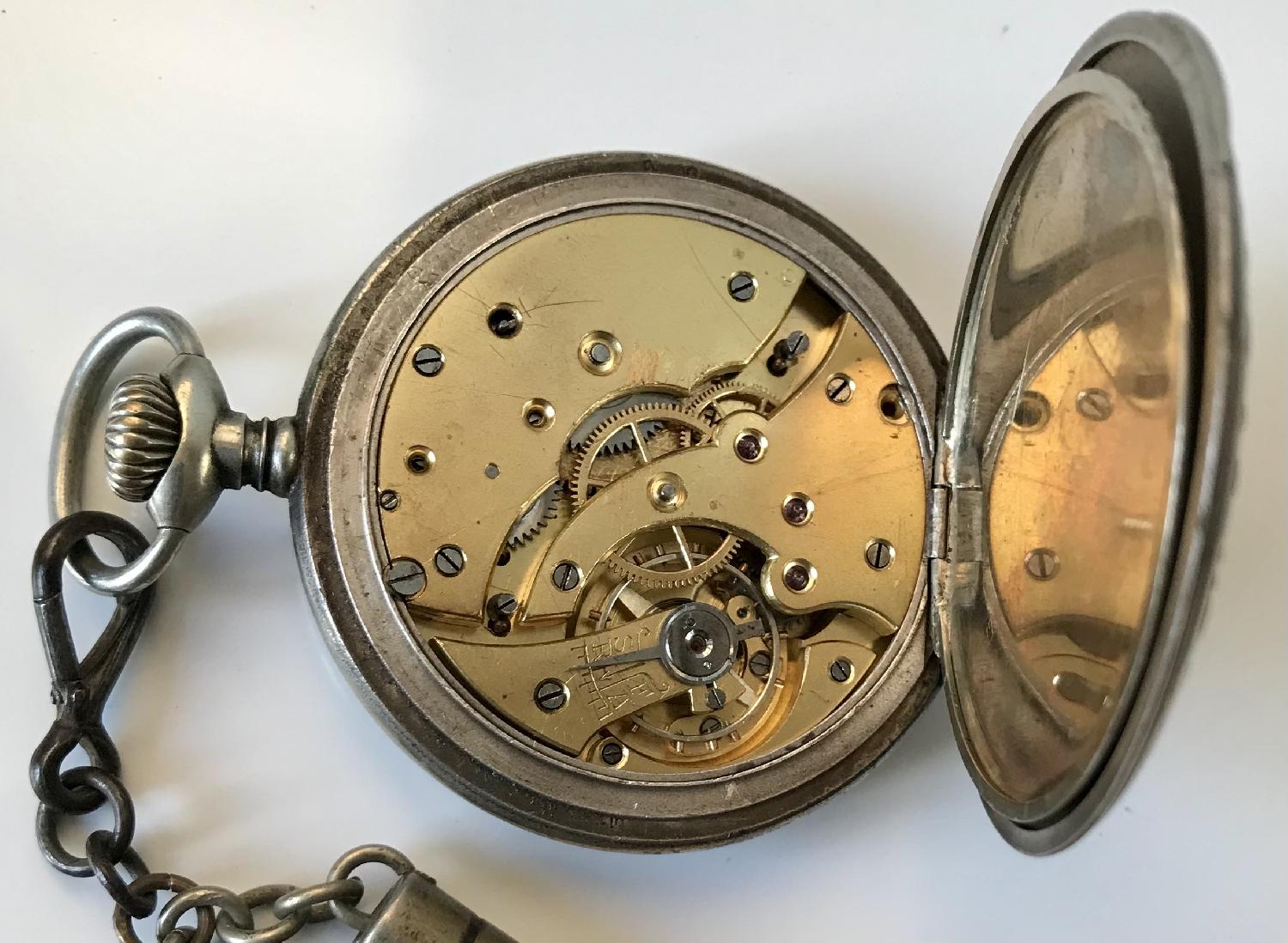 Elle mesure 5,2 cm de diamètre, et sa chaine est probablement un art de tranchée. La montre ne fonctionne pas, le mécanisme doit être cassé, et il y a des éclats (mal réparés) sur l'émail. Protection de marque Argus, plexiglas jauni.