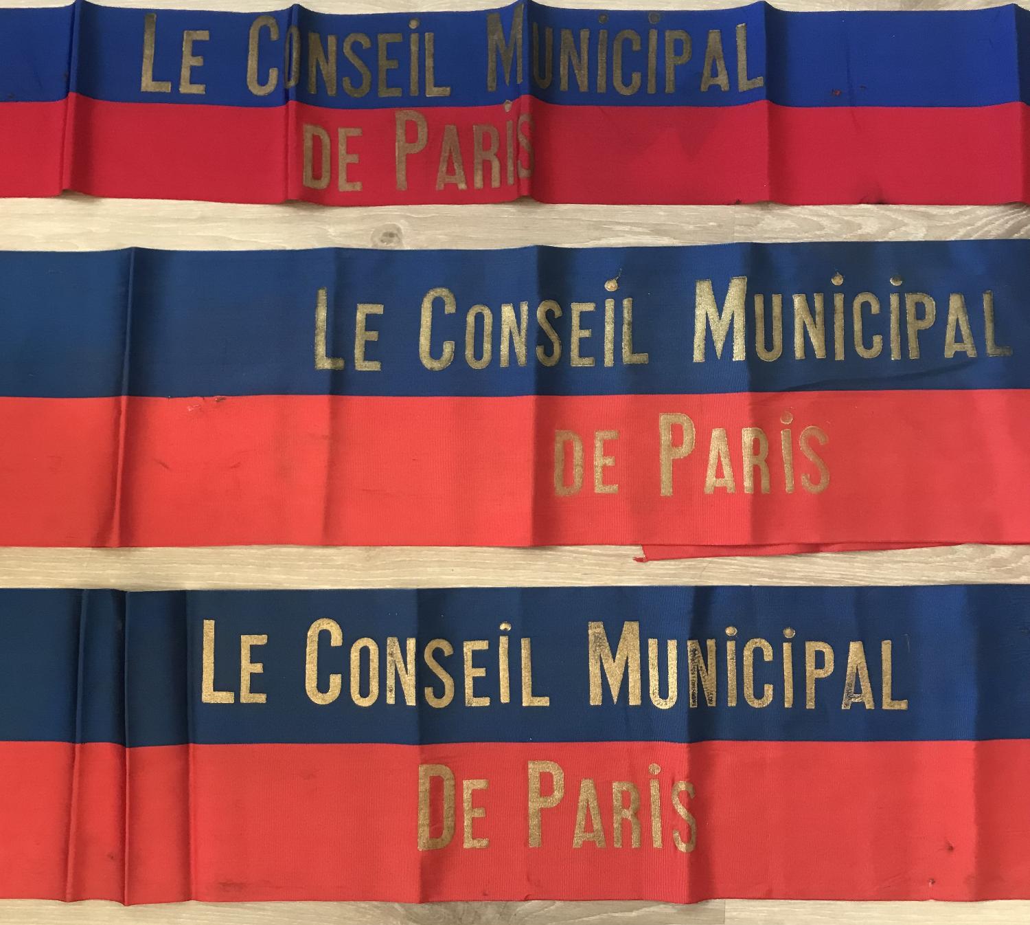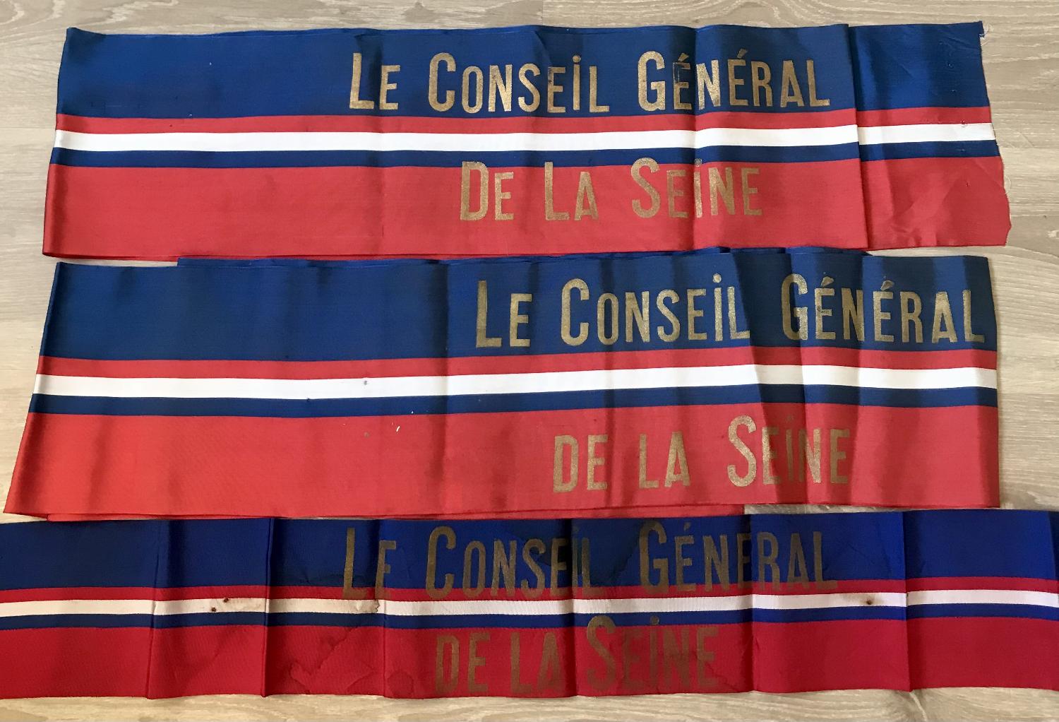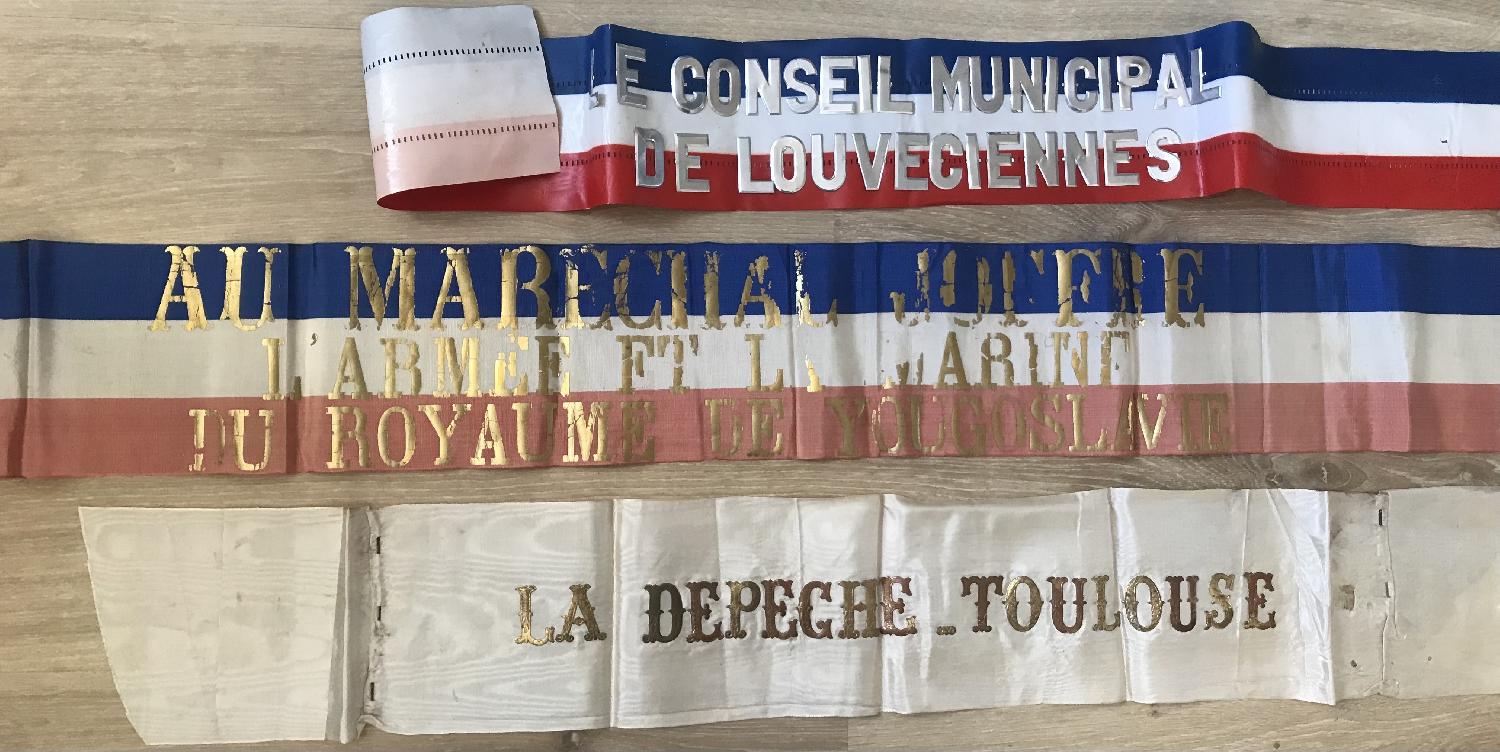- Lot de 10 oriflammes de couronne de fleurs à destination du maréchal Joffre décédé en 1931 de la part du conseil général de la Seine (3), du conseil municipal de la Seine (3), du conseil municipale du Louveciennes (plastique et métal), du Royaume de Yougoslavie (lettres très abimées), de la Depeche Toulouse, du 5 eme régiment du Génie (manque le R, et oriflamme déchiré).