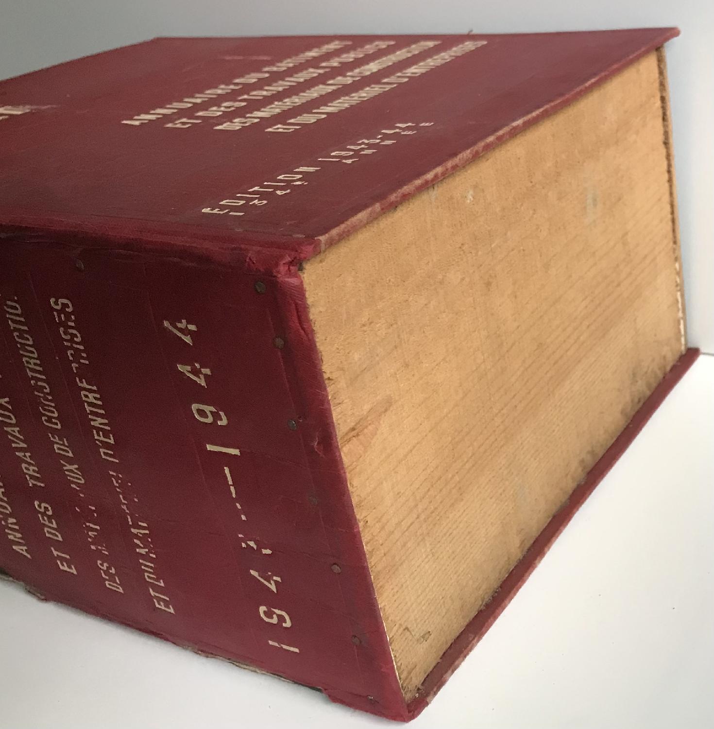 Annuaire en trompe oeil de 1944 en bois. Il mesure 28 cm X 21 cm X 13,5 cm. Les oriflammes étaient stockés dedans et a appartenu à la famille du maréchal.