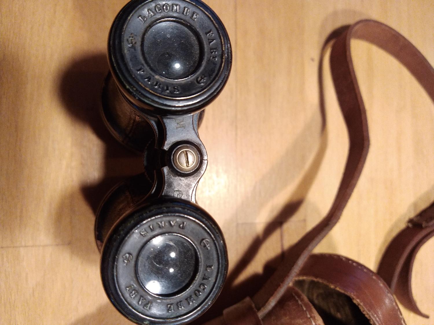 Belle paire de jumelles Lacombe Paris, bien marquée ministère de la guerre (MG). Optiques propres. Étui en très bon état.