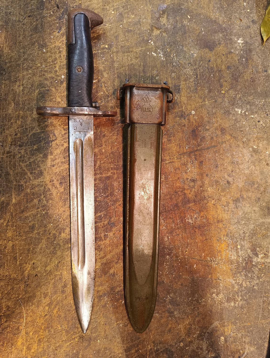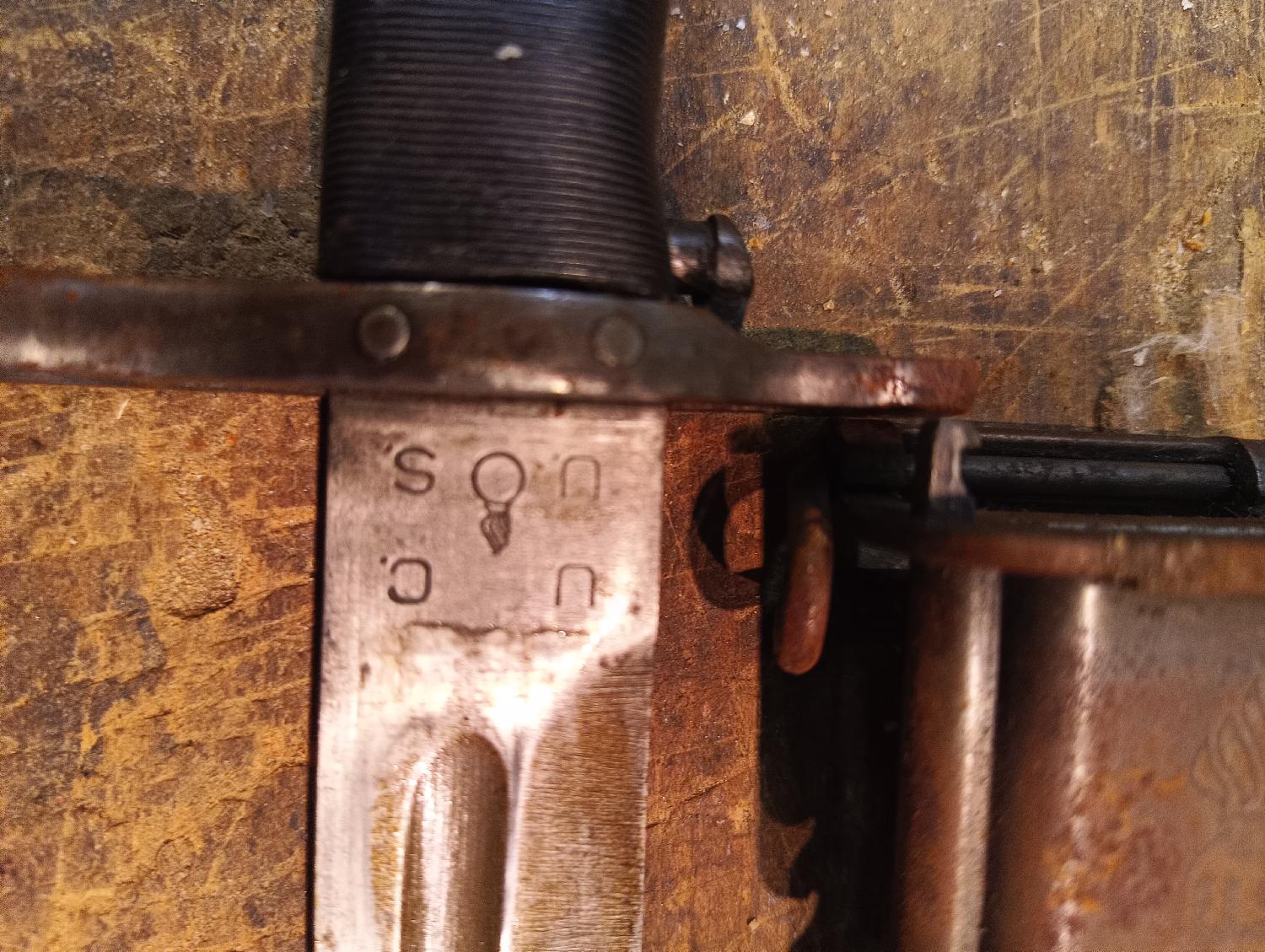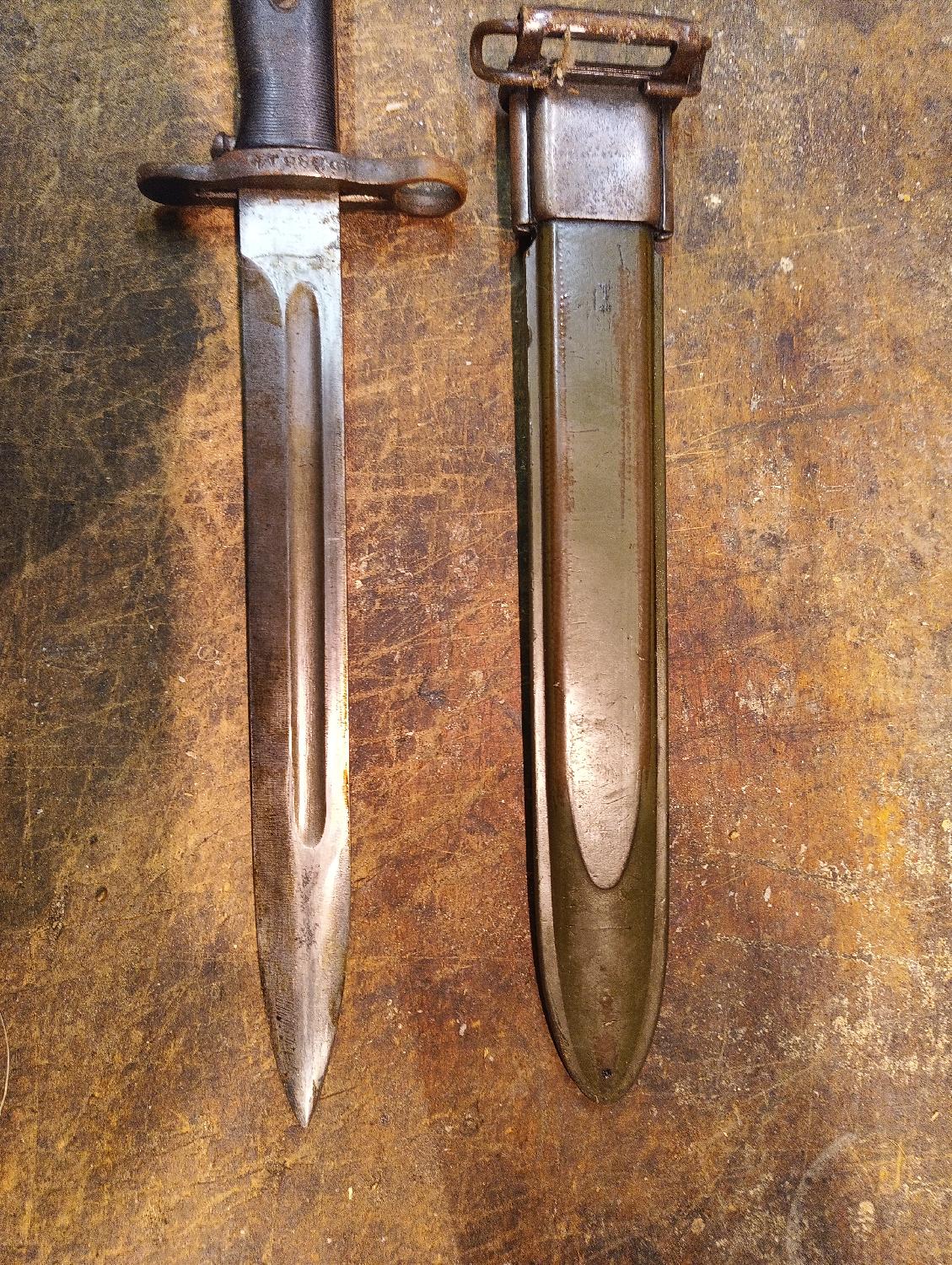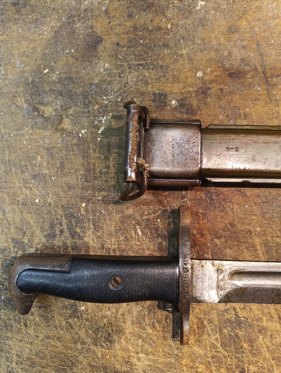Baïonnette complète.en très bon état. Baïonnette marquée.et fourreau a bien sa grenade tout en très bon état. Matricule estampé sur baïonnette.non affûtée ni cassee.7€ de port en mondial Relay