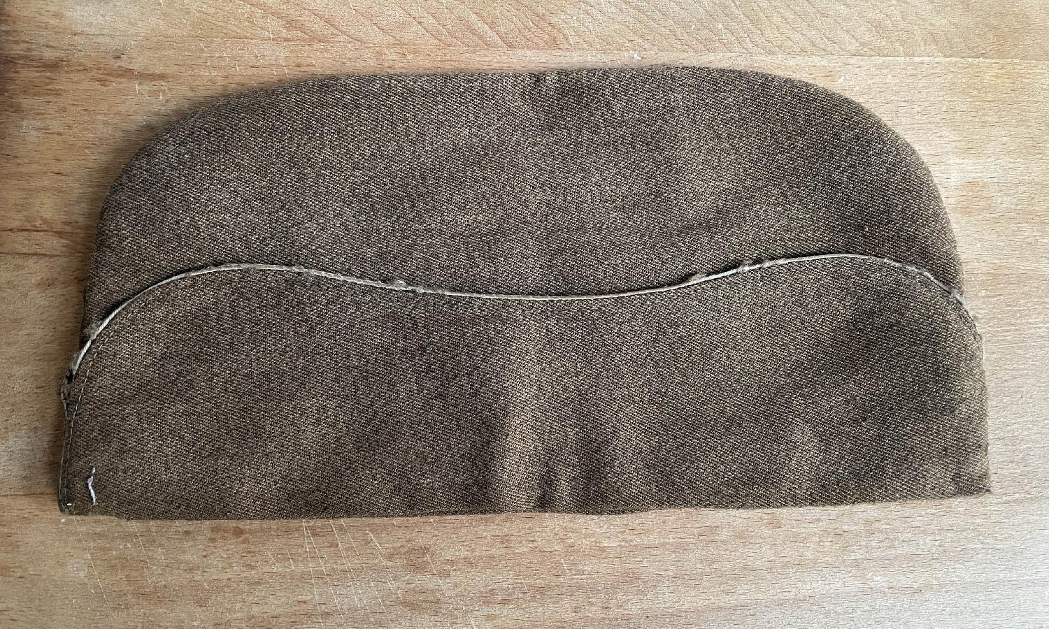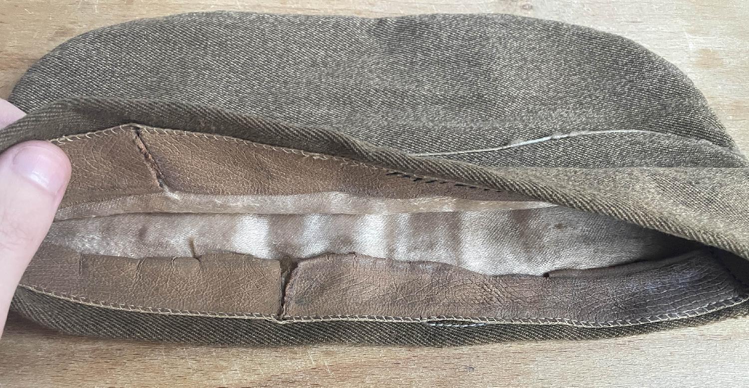 Un joli bonnet de police de tailleur, nominatif mais illisible, en toile doublée de satin et d'un bandeau de sudation en cuir. Parfait pour la tenue de repos d'un officier !