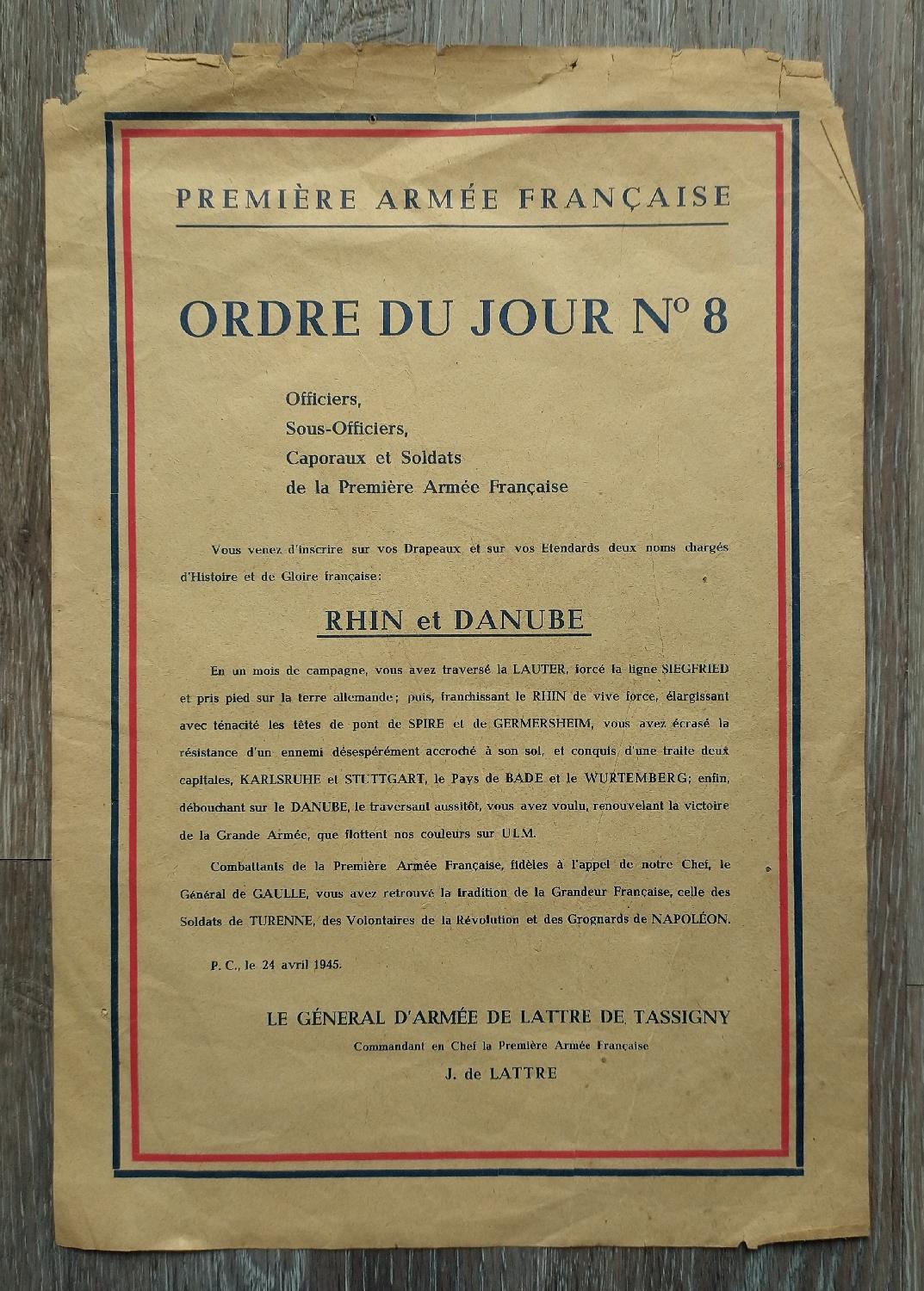 Affiche ordre du jour numéro 8 de la 1ére armée.