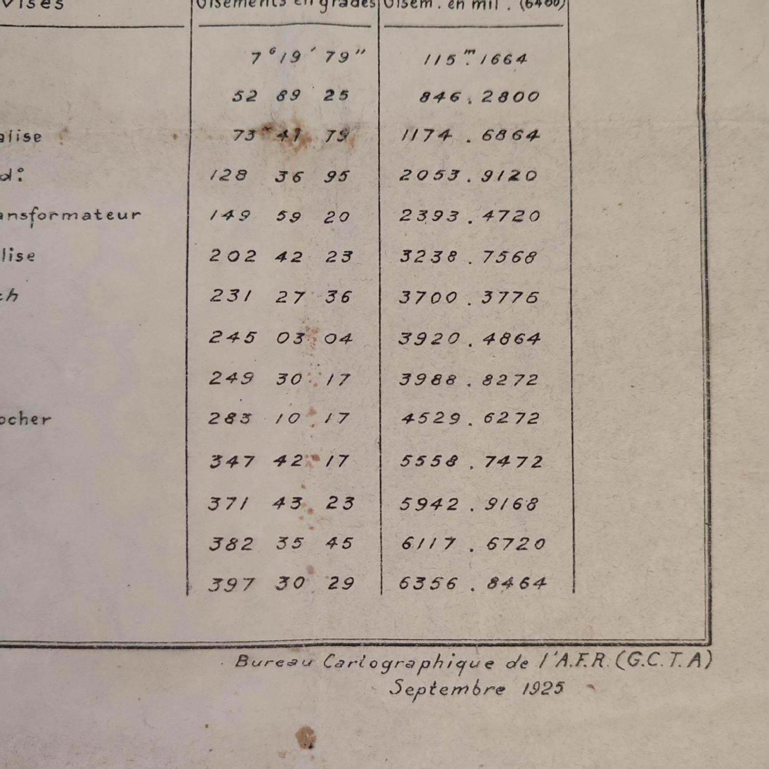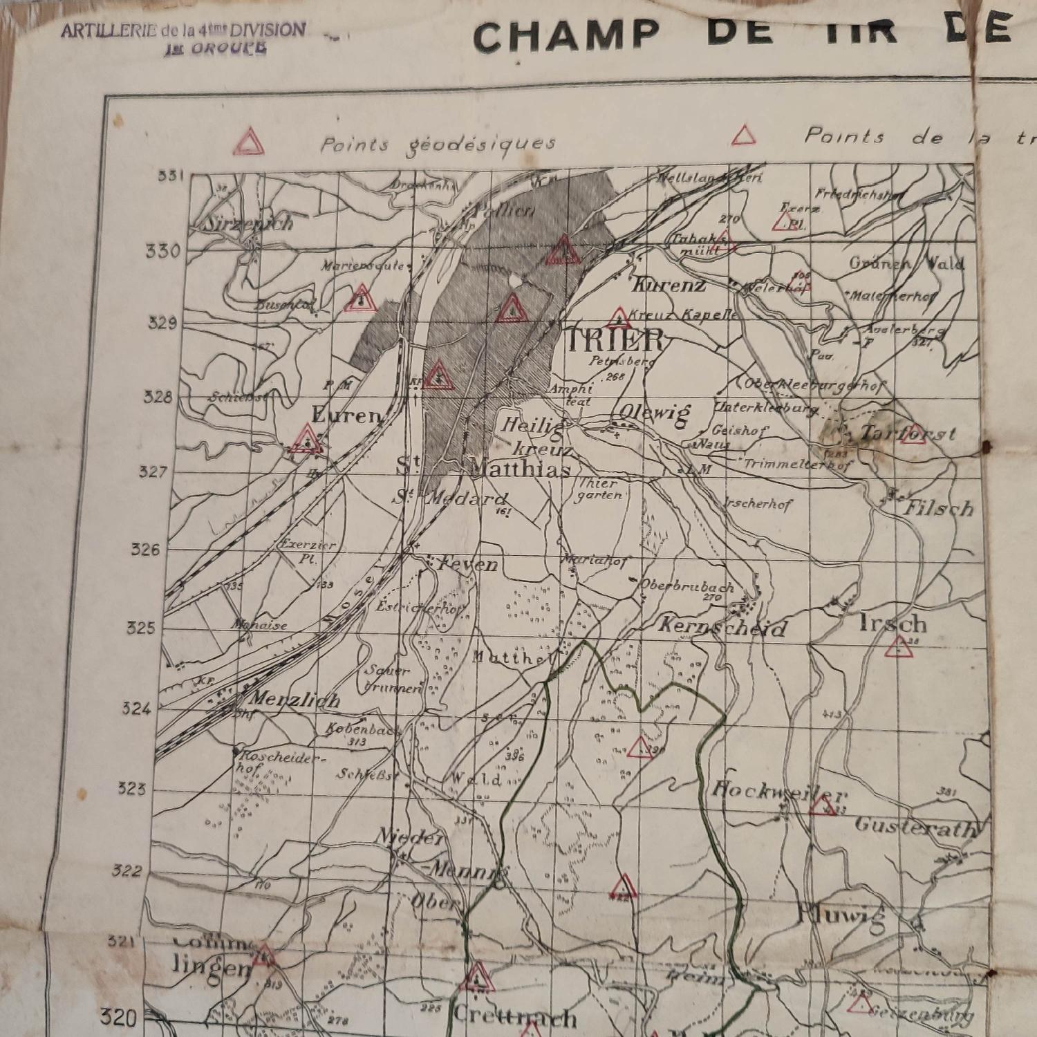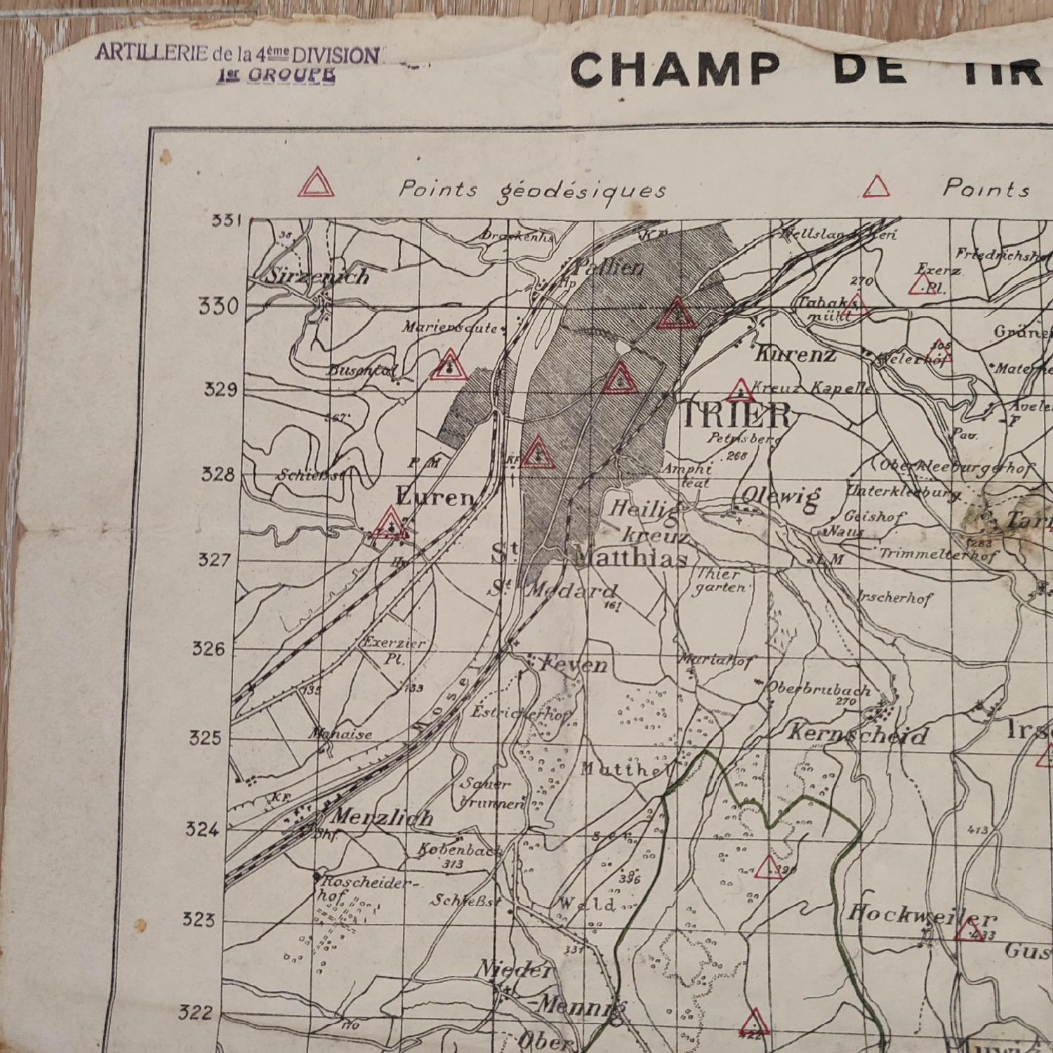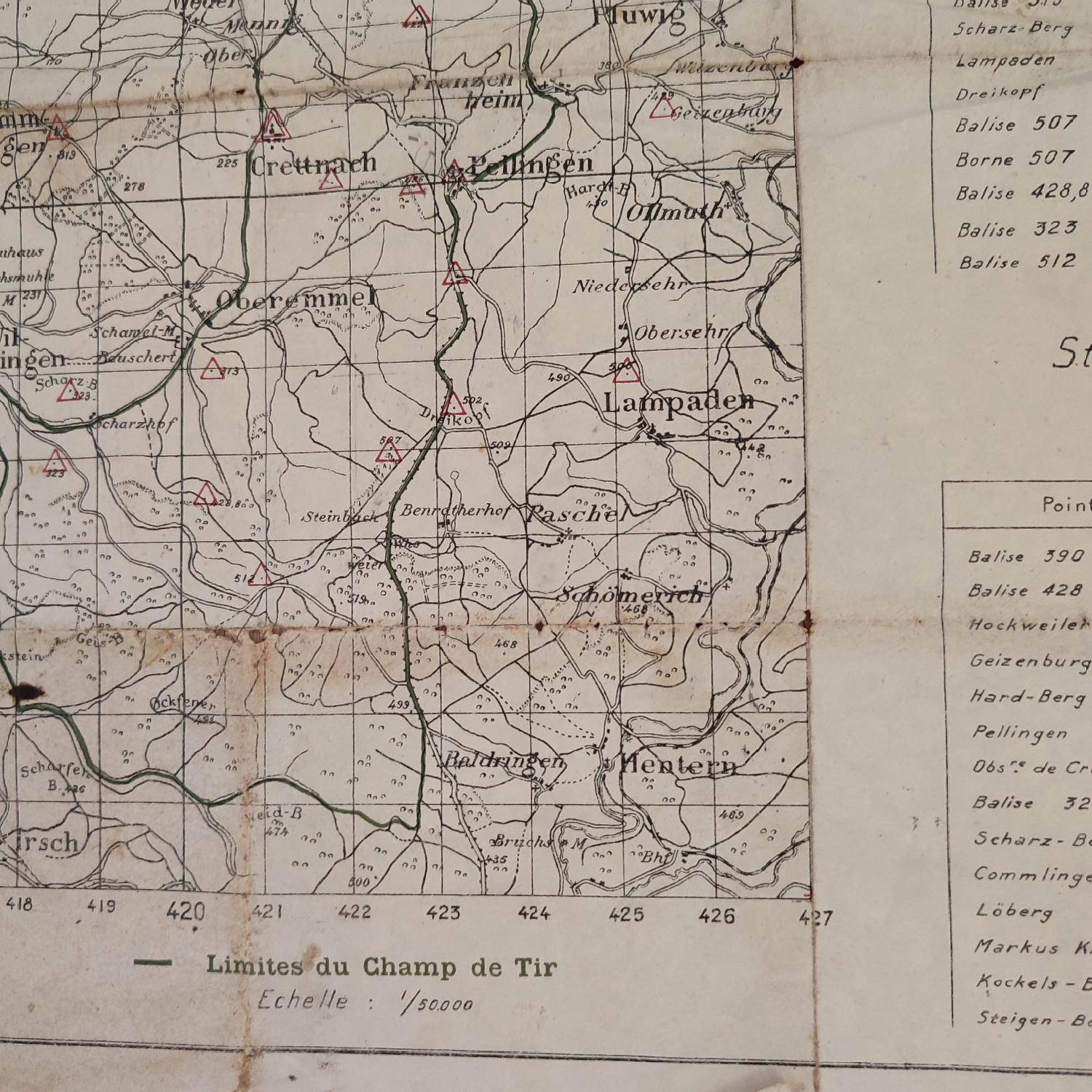 Carte du champ de tir de Pellingen. Datée 1925. Avec tampon Artillerie de la 4eme Division - 1er groupe. Pellingen est situé en Allemagne en secteur d'occupation Français. Dimensions 47 x 47 cms. Sera envoyée pliée. Prix 15 euros. Port 5 euros lettre suivie France.