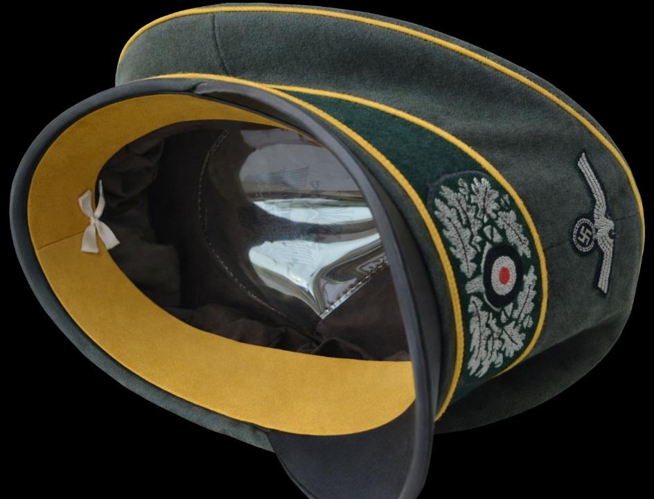 *Le doeskin est un drap de laine fin et dense, au toucher doux et légèrement duveteux, rappelant justement la douceur de la peau de daim (doe skin en anglais → « peau de biche »). Il s’agit d’un tissu de laine peignée, tissé serré, puis foulé et brossé pour obtenir cette surface lisse et veloutée. Très souple, mat, et avec une chute élégante, il était prisé pour les casquettes d’officiers et de généraux pour son apparence de haute couture militaire. Les coiffures réalisées en doeskin par les fournisseurs privés sont considérées comme ayant un aspect plus luxueux : forme élégante, surface lisse et veloutée, couleur plus uniforme, plis nets.