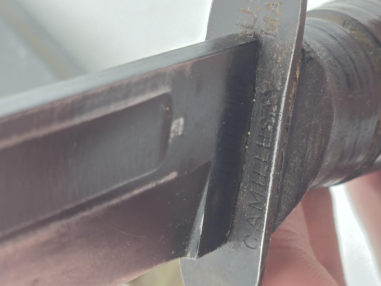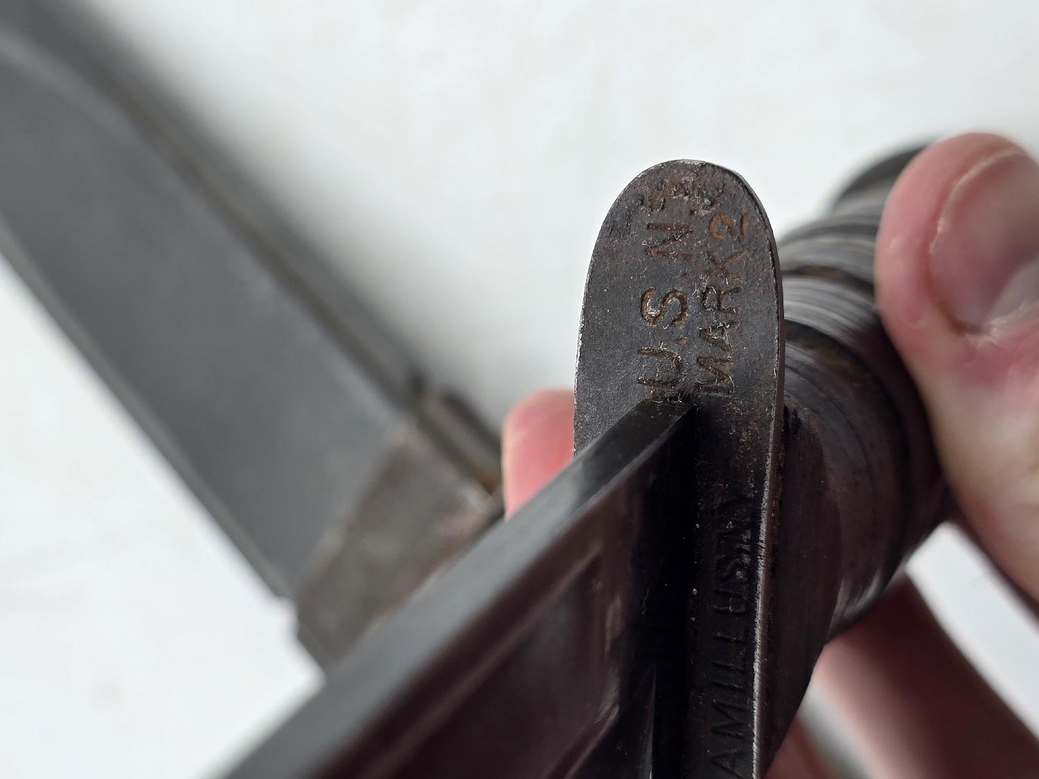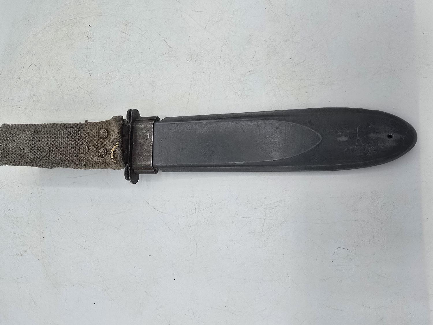Sympathique poignard USN Mark2 dans sont jus. Porter et légèrement affûtée. Belle pièce état terrain.