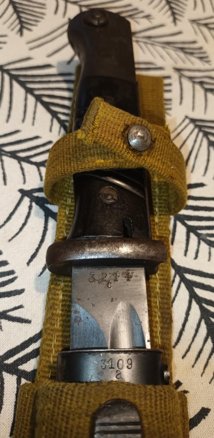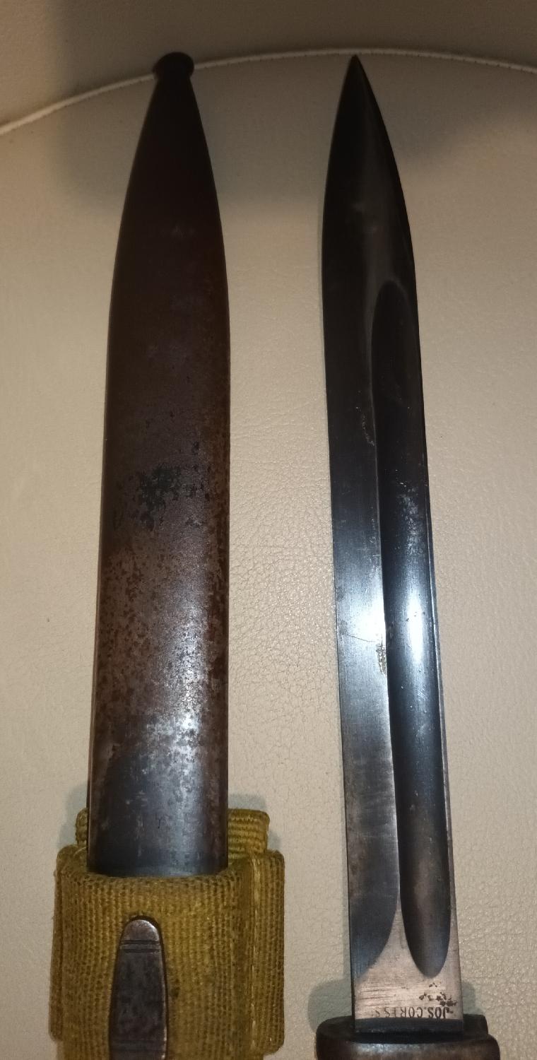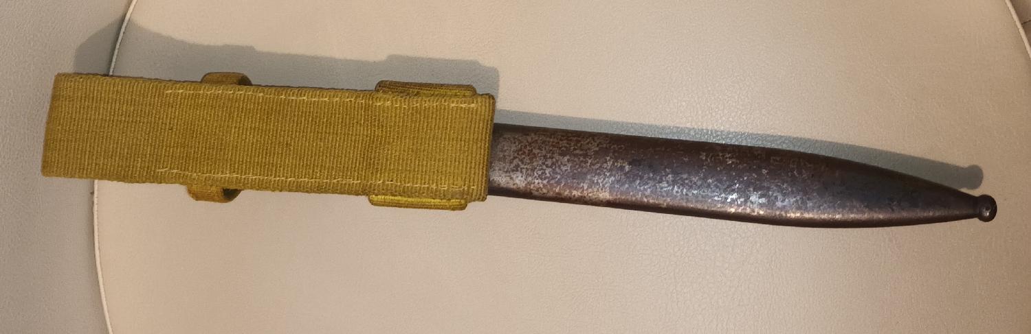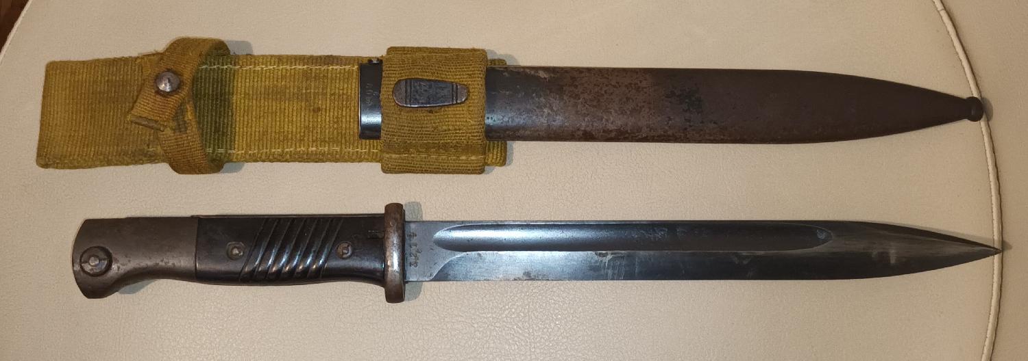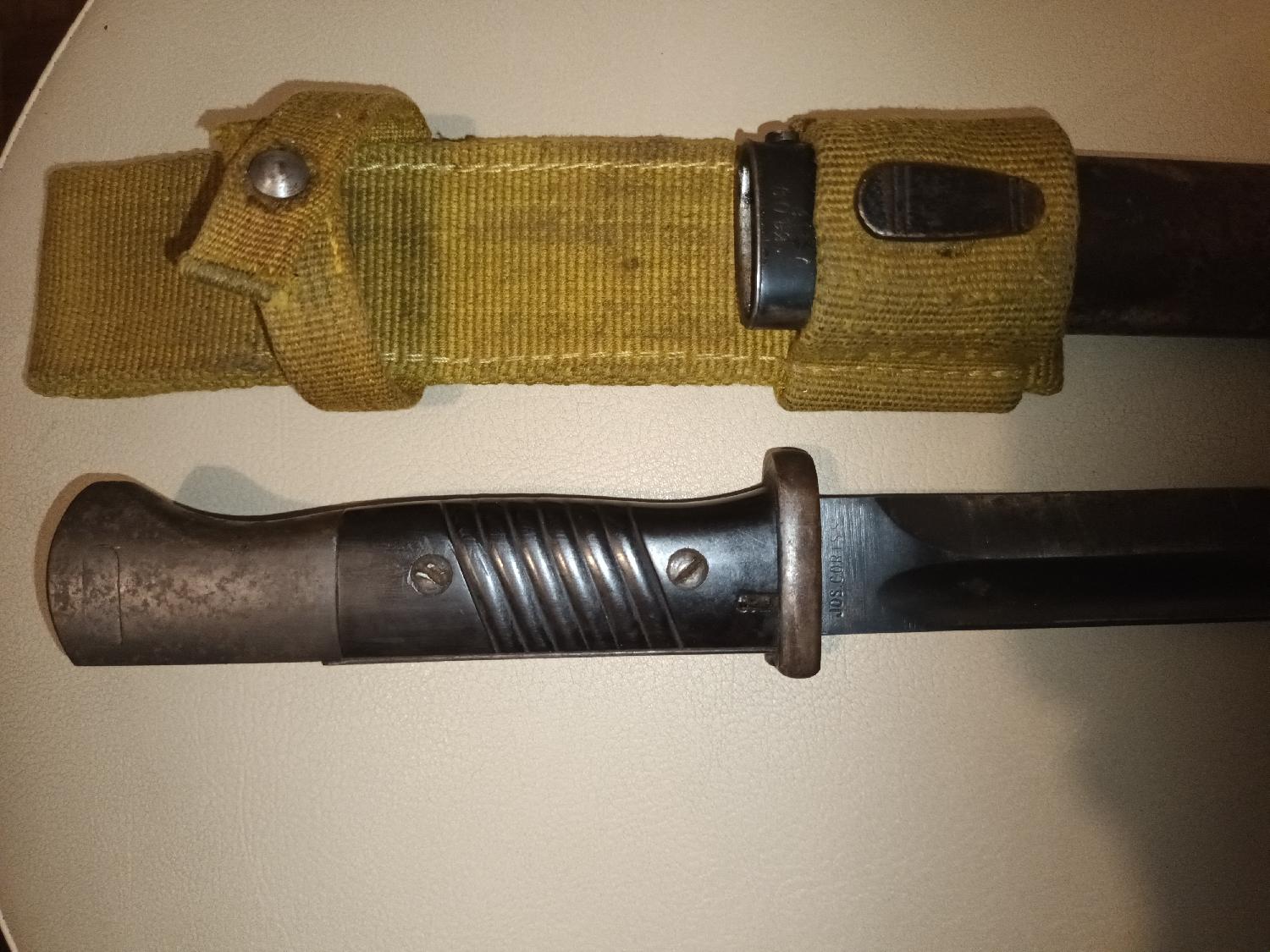 Très bel ensemble avec une belle baïonnette datée 40 pas au numéro avec un porte baïonnette toile Ak mais visible jusqu'à la fin du conflit. Lame propre non affûtée patine normale avec usage beau marquage 40 sur lame et fourreau légèrement oxydée. Livraison offerte mondial relais payable avec PayPal de préférence entre proche.