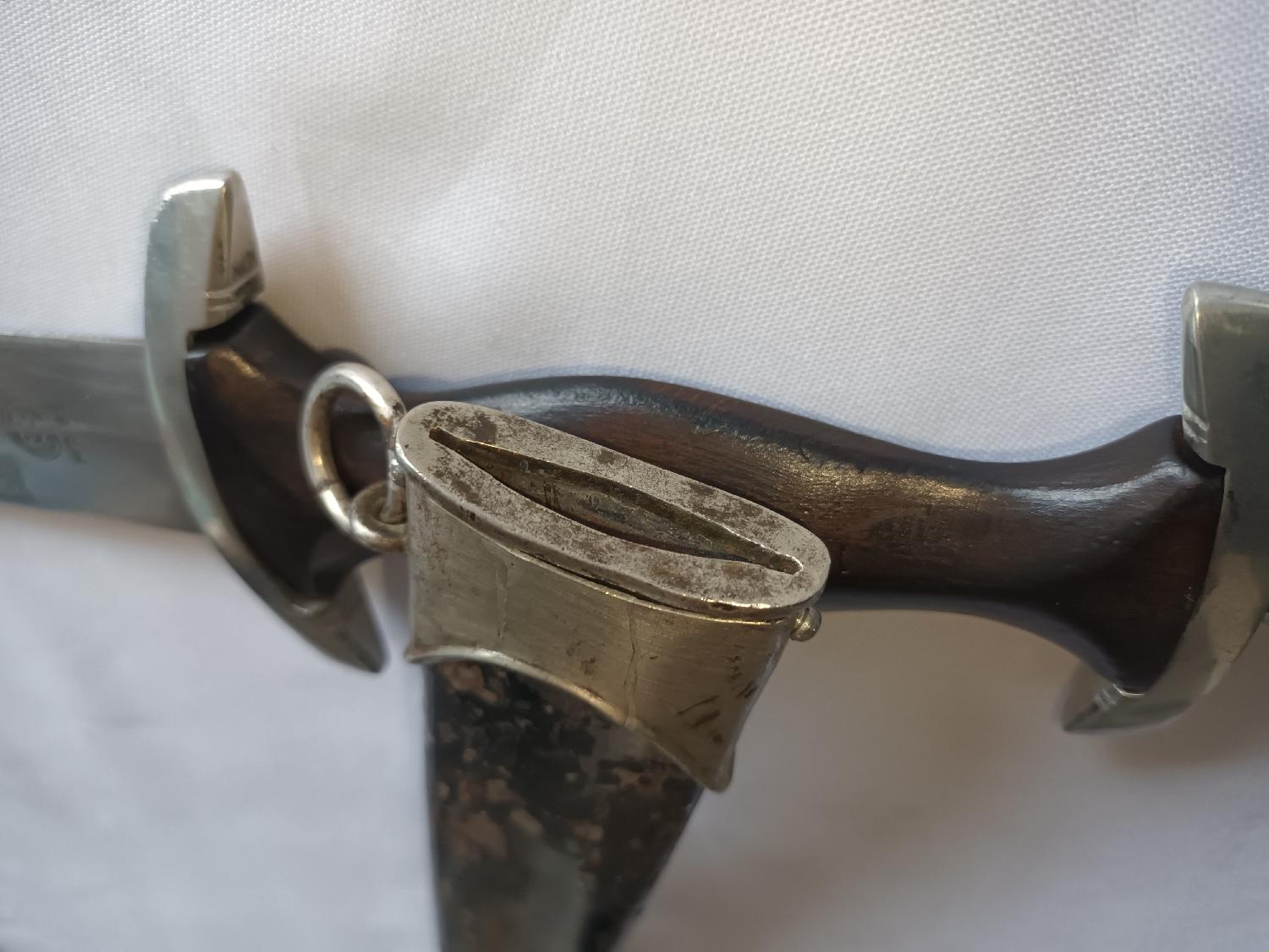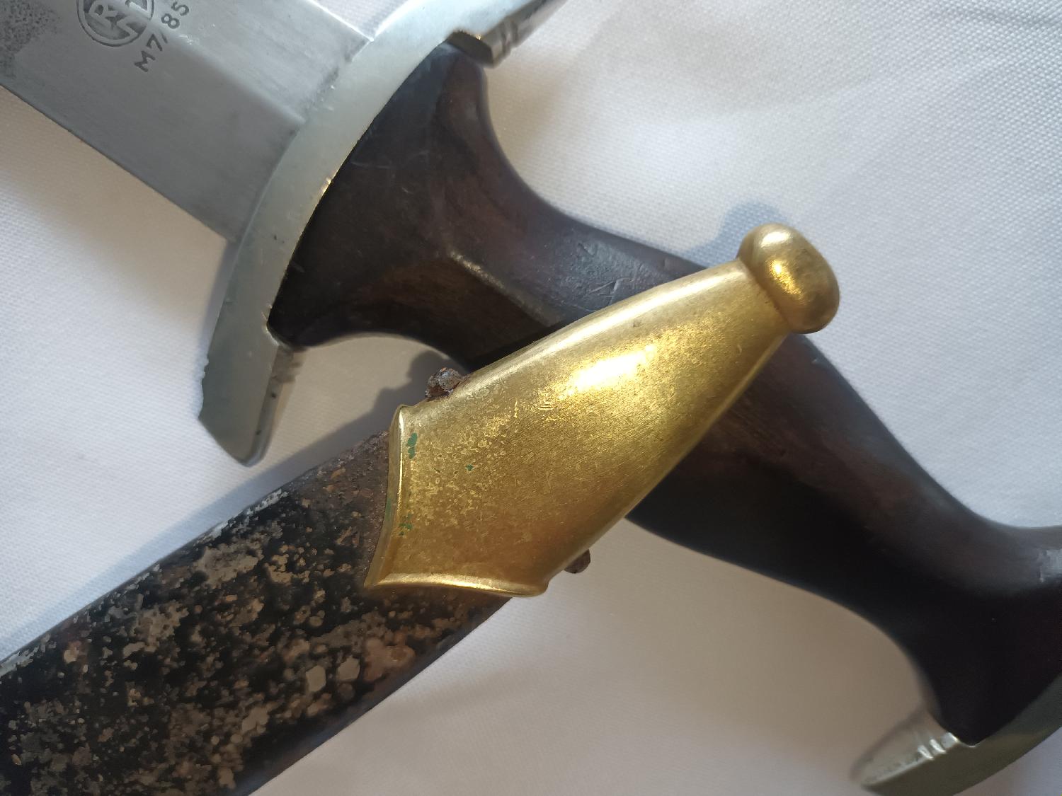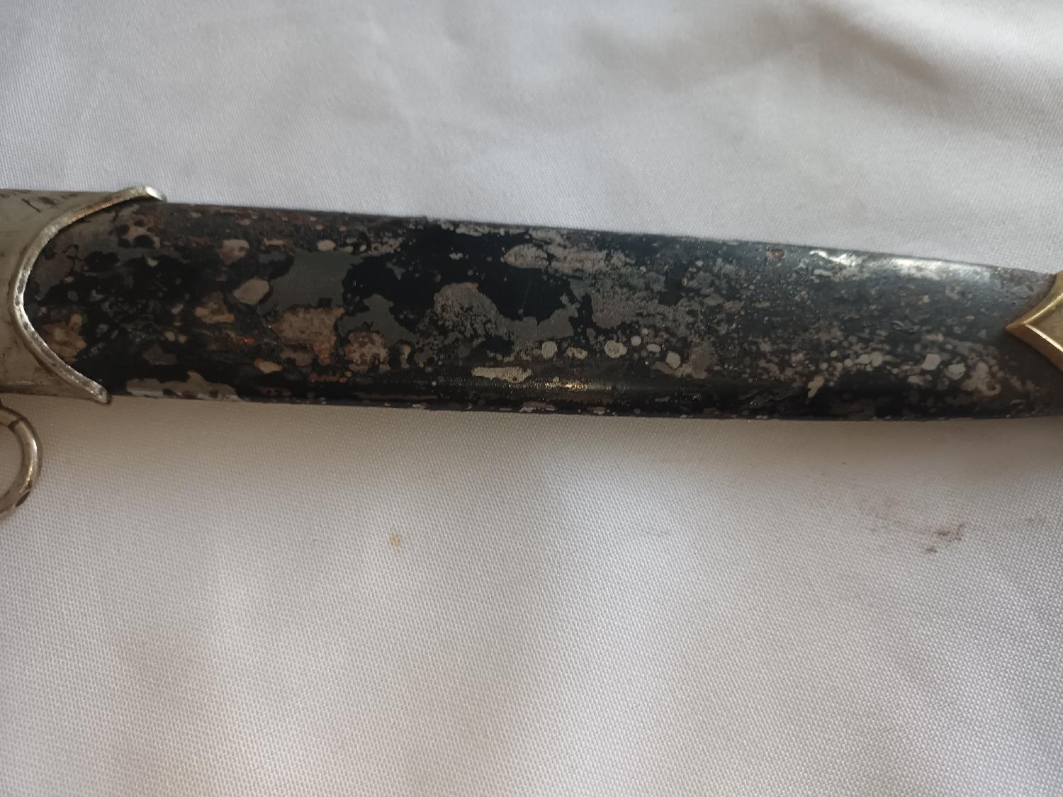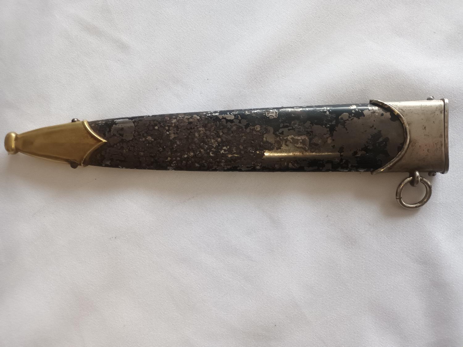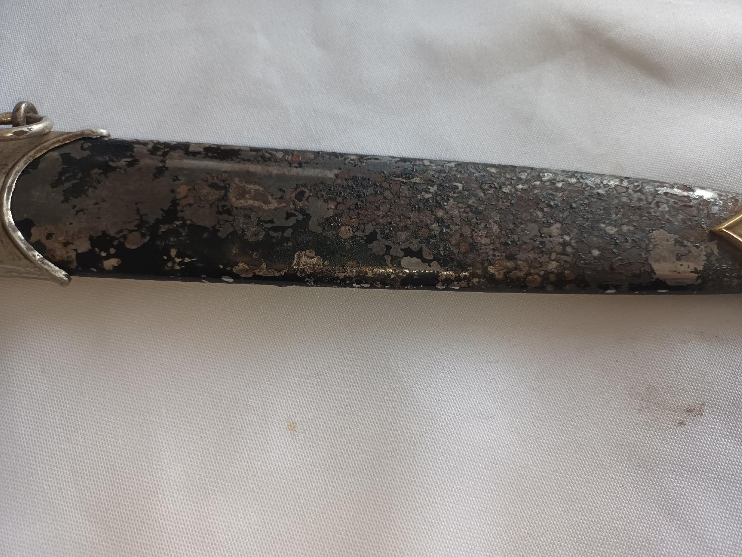 Fourreau de dague Ss ou Nskk laqué noire encore bien visible. Partie haute d'origine avec traces de manipulation. Les lamelles pour tenir la dague sont présentes. Livraison offerte par mondial relais payable avec PayPal de préférence entre proche.