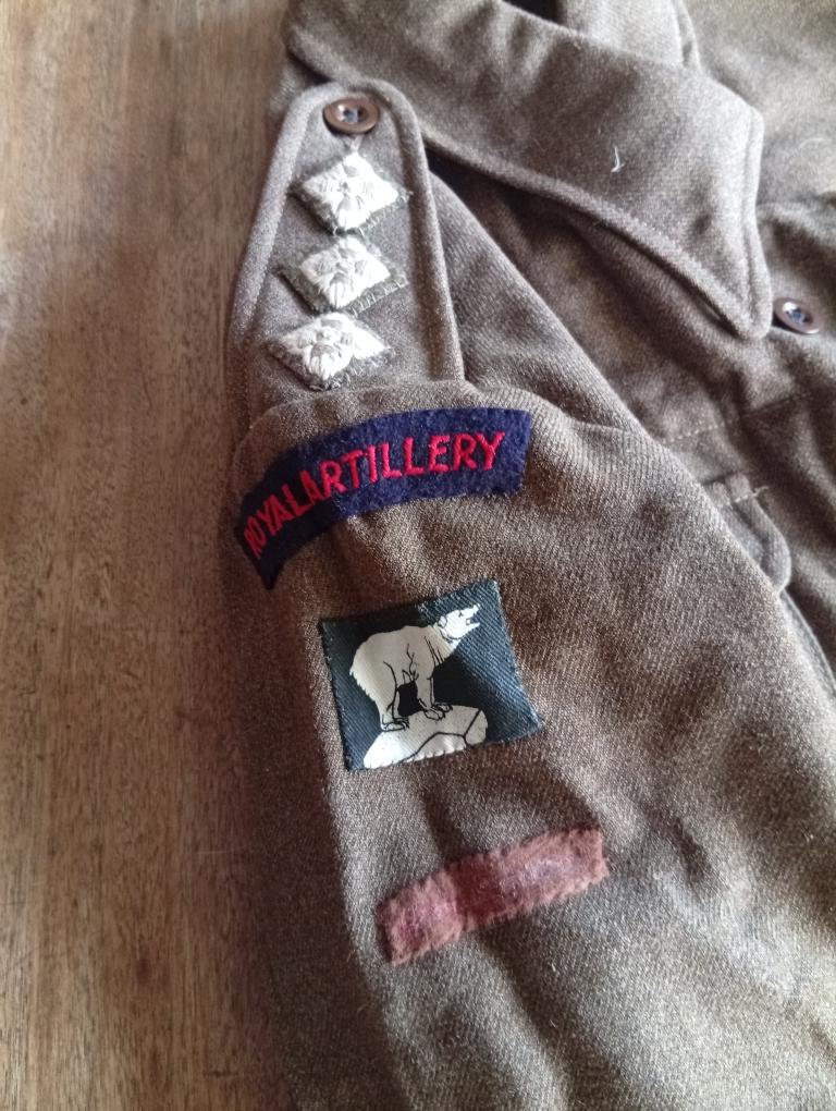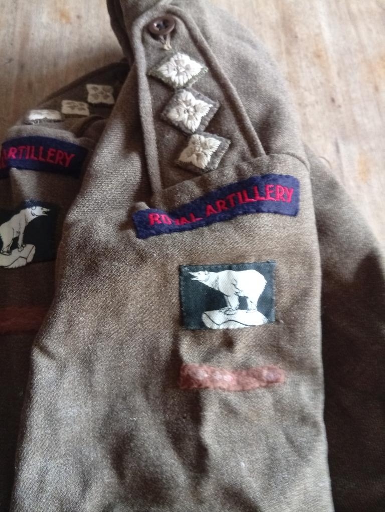 A vendre rare blouson Battle dress pattern 37 fabrication Néo Zélandaise 1943 bien daté et tamponné monté pour un capitaine RA West Riding division. Insignes originaux peut-être remontés, strips de brigade abimés, plusieurs trous de mites particulièrement sur l'arrière des manches. TBE état autrement drap très frais.