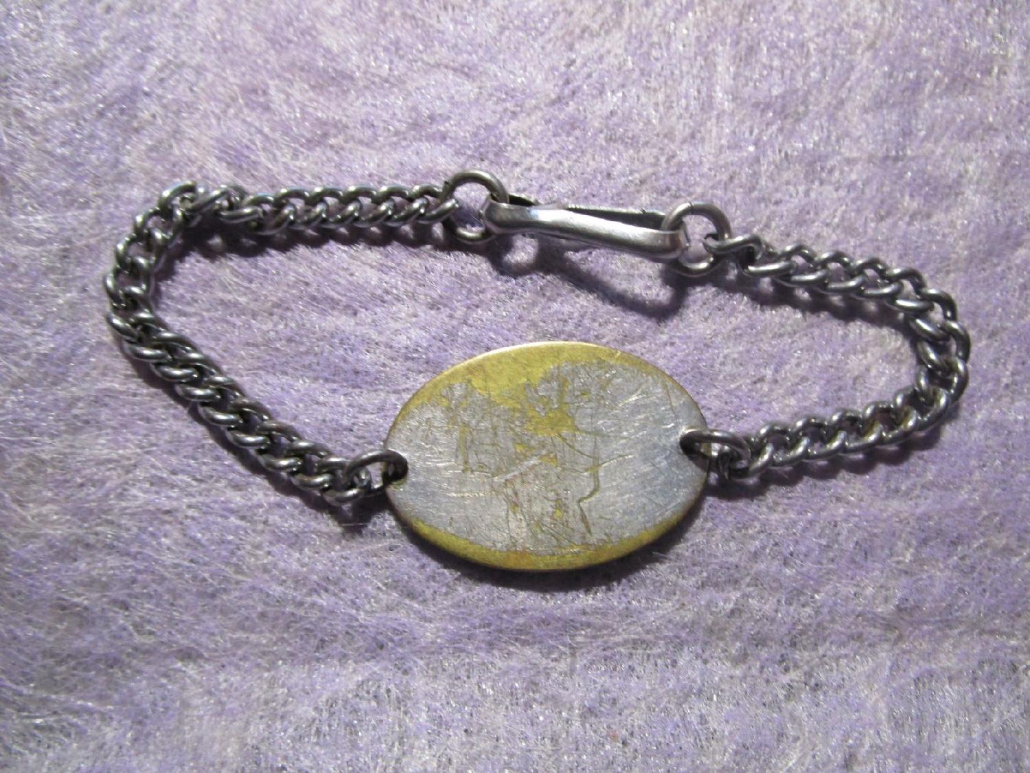Gourmette fantaisie en vente dans les foyers militaires. Modèle pour l'artillerie. Avec sa chainette d'origine. Prévoir 3.10 euros en lettre verte ou 3.70 euros en lettre verte suivie.