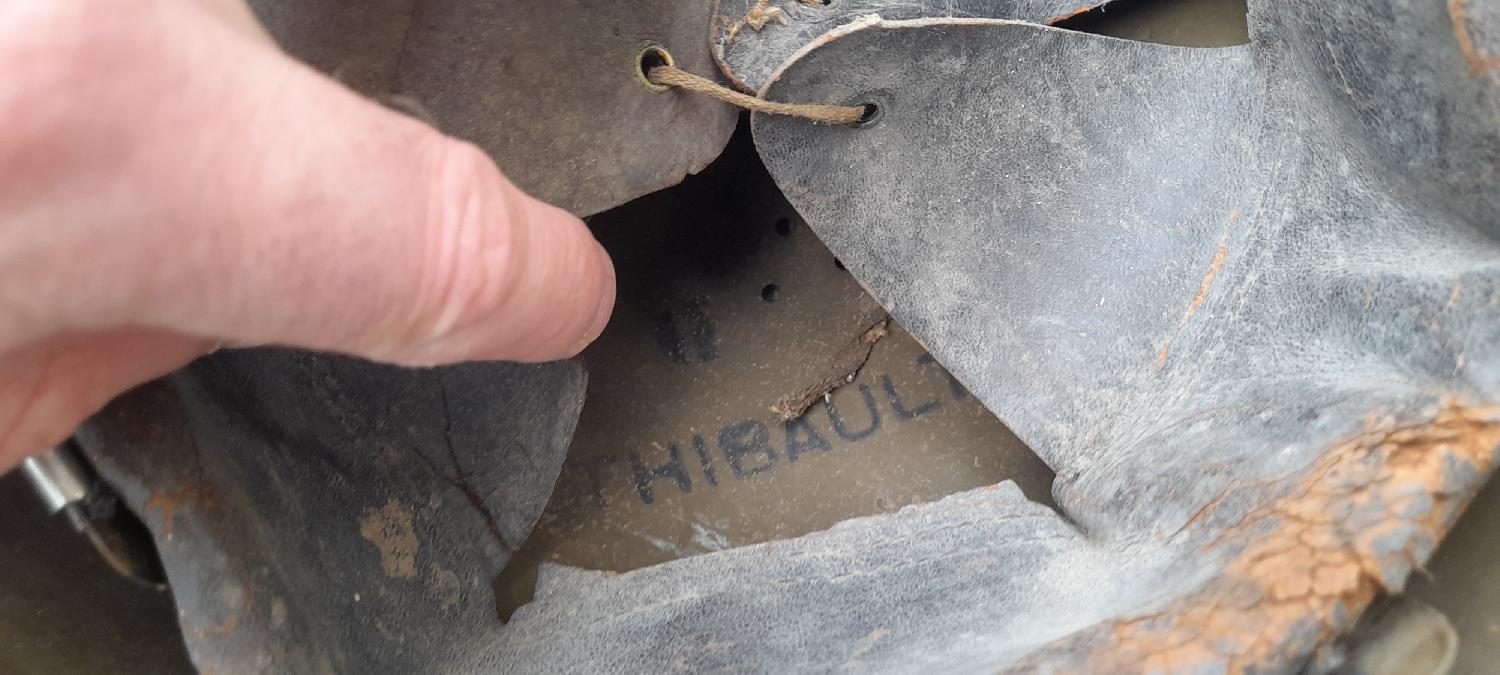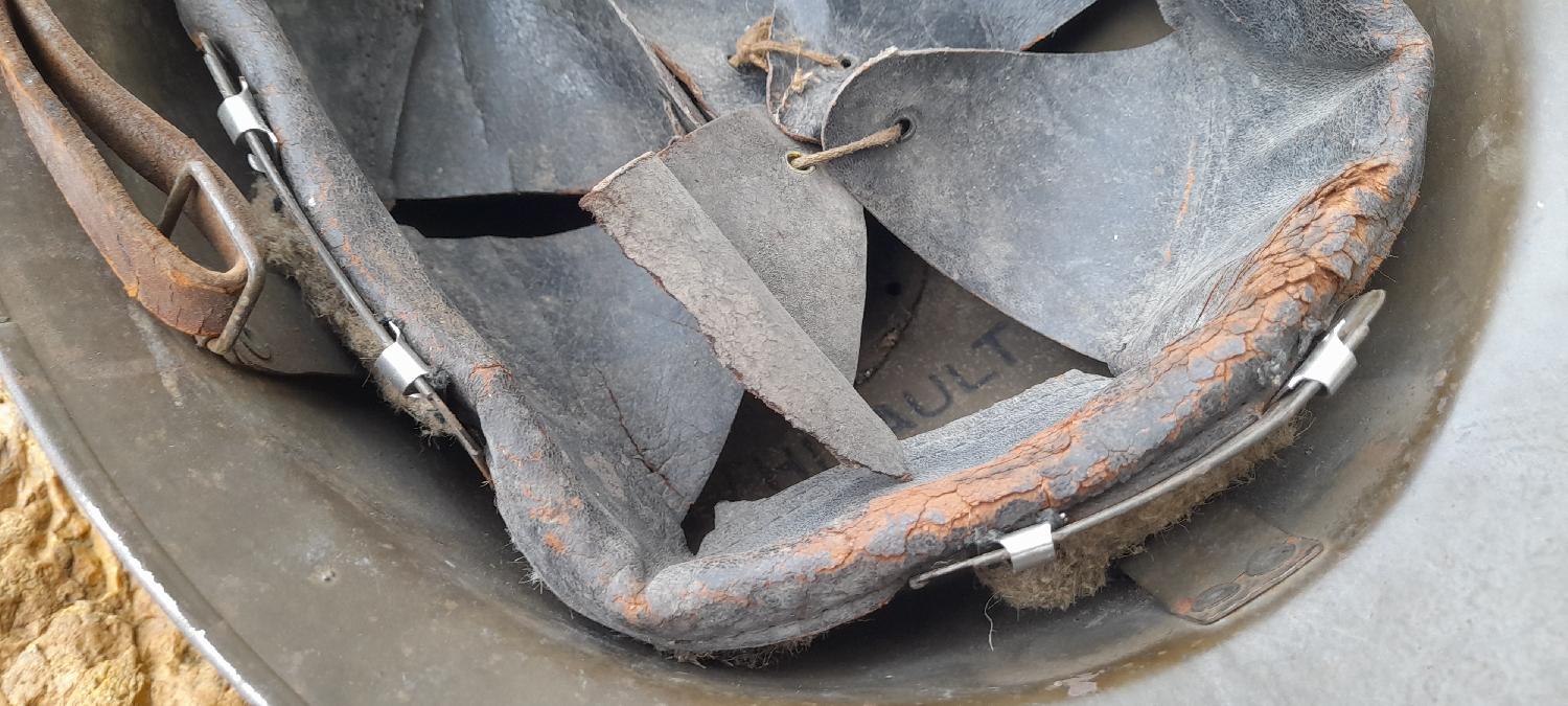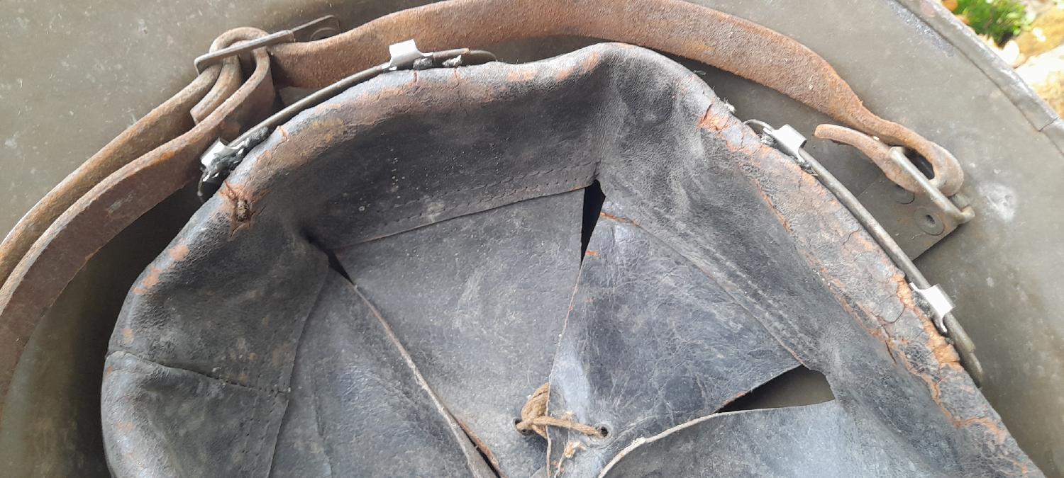Casque dans son état de decouverte, cuir un peu sec et poussiereux.