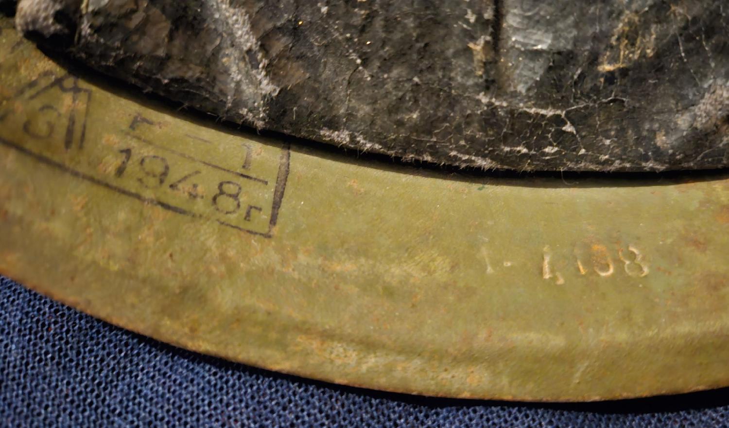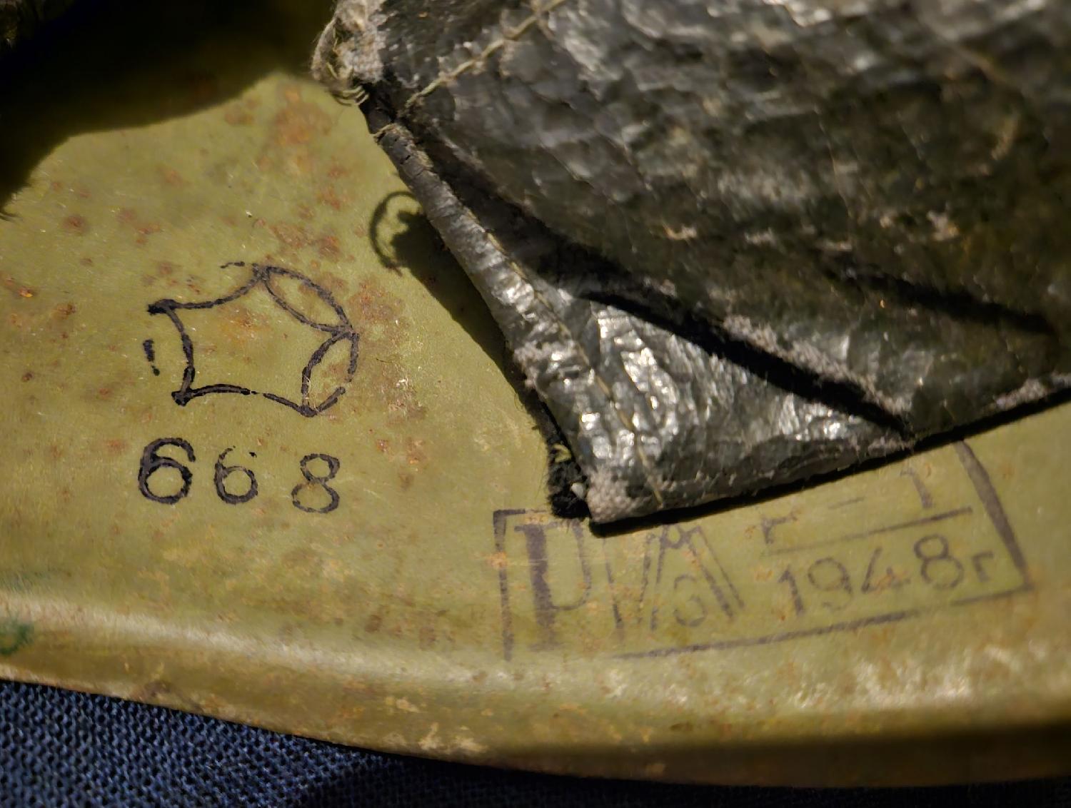 La lettre « P » veut dire Pemohmupyen (reconditionnement en Russe) C’est-à-dire que ce casque a été reconditionné, rénové en 1948 par l’usine Lysvensky de LYSVA (LMZ).