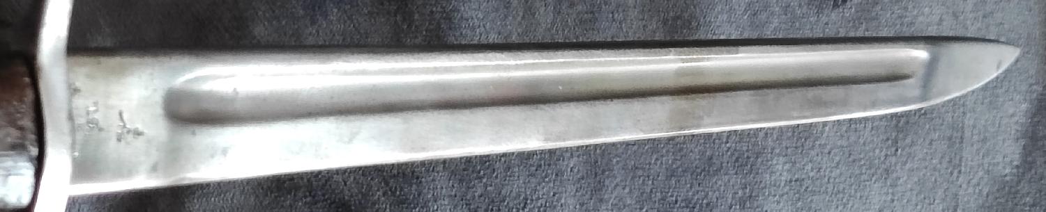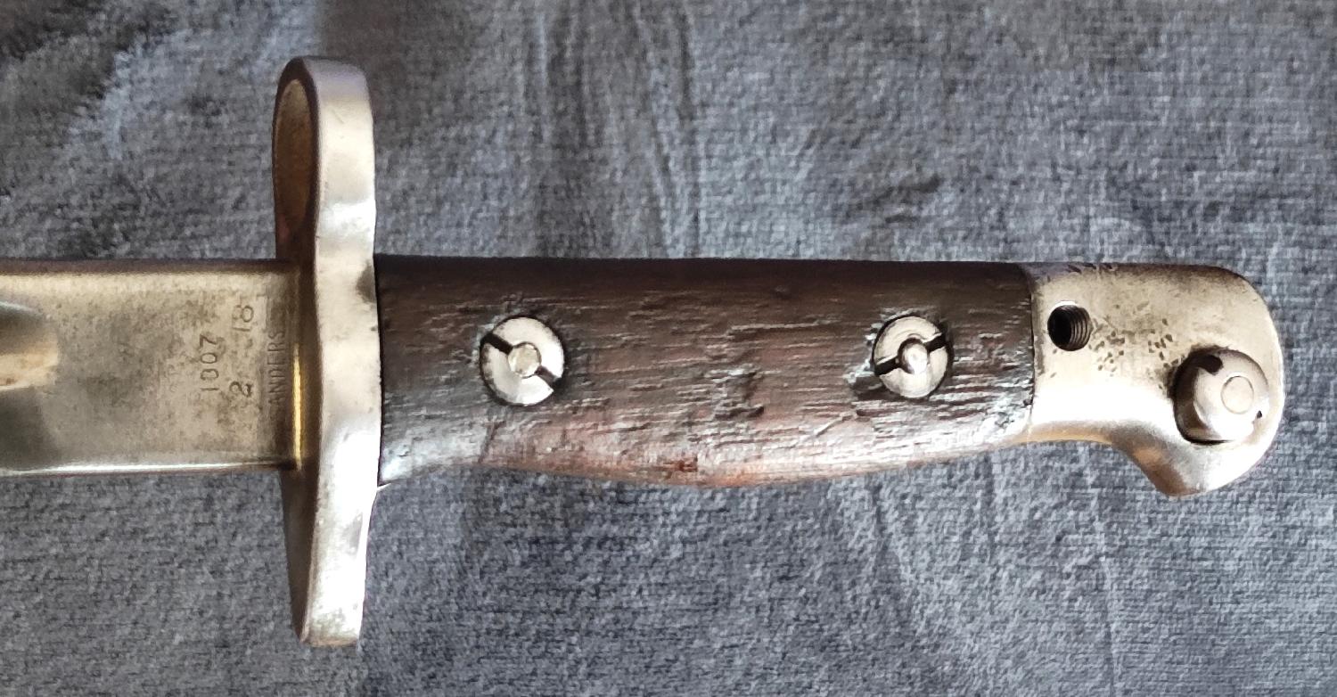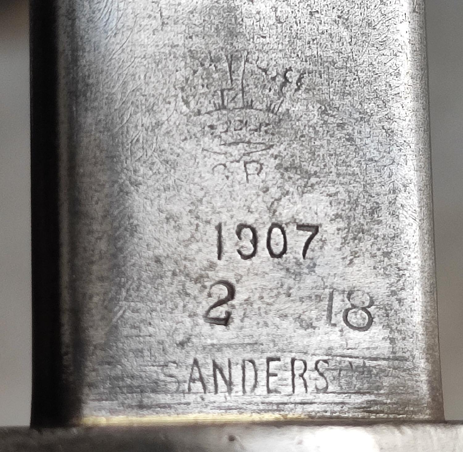 Baïonnette british modèle 1907 sans fourreau , longueur totale 55cm lame de 43cm bon état , une vis de plaquette n'est pas la sienne , belle lame , bouton poussoir fonctionnel , fabrication SANDERSON