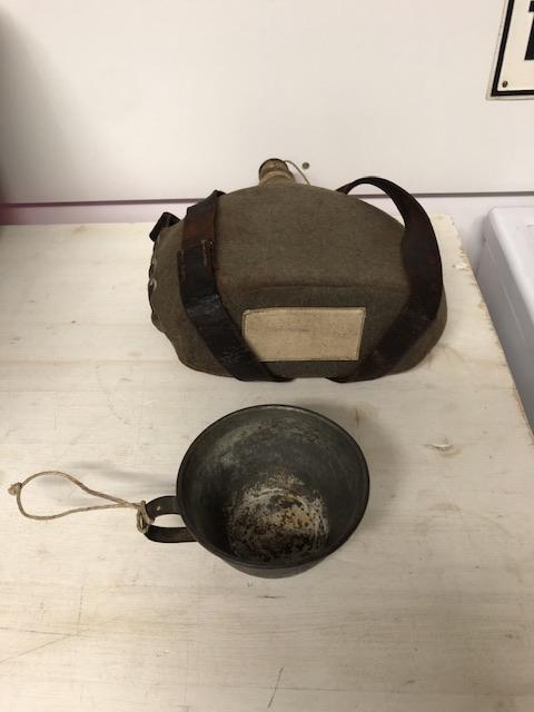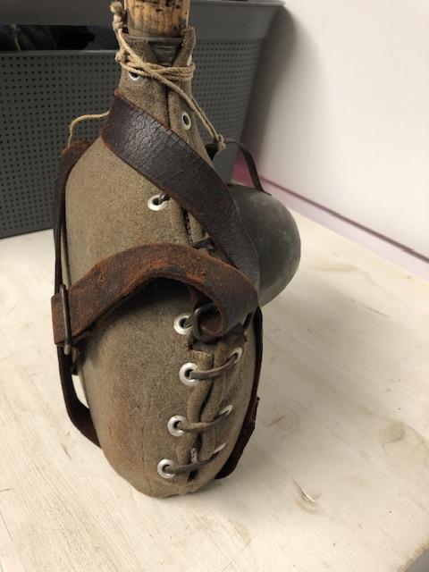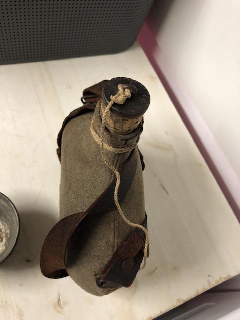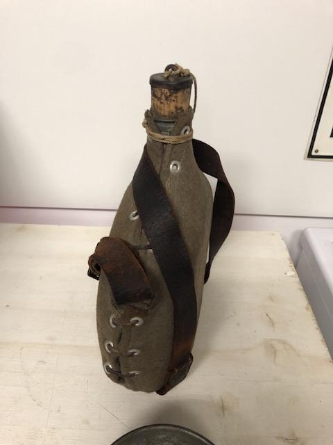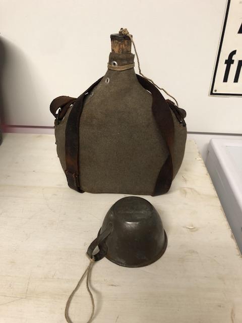 Bon mle œillets alu ,sangle cuir souple mais coupée au niveau du rivet mais tiens bien.son vrai bouchon et sa bonne ficelle .peu de trou de mites devient rare à trouver .je donne avec une sangle cuir sec en rable .quart fer avec sa ficelle .port compris en mondial relay