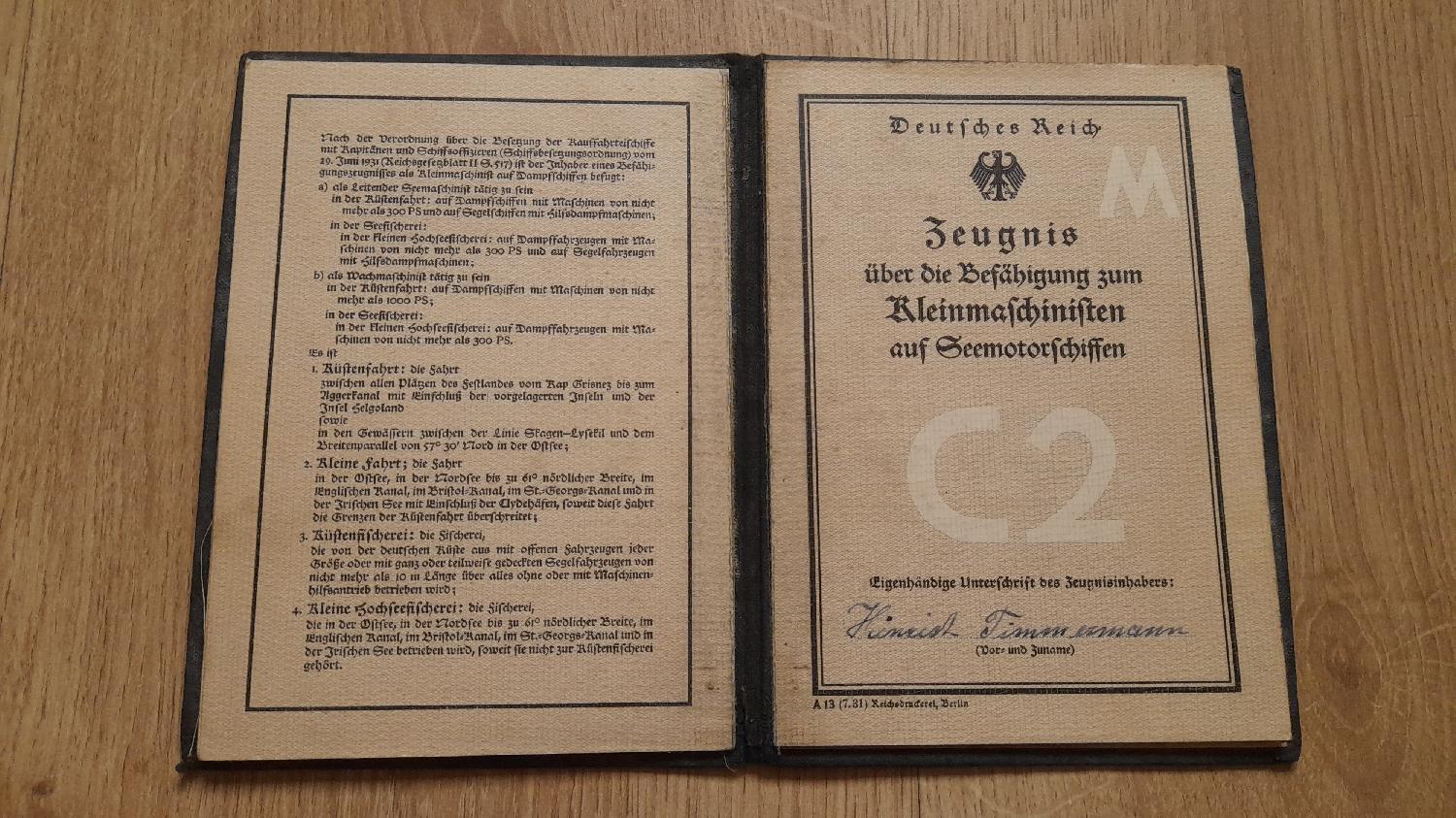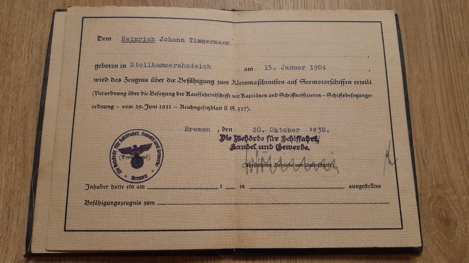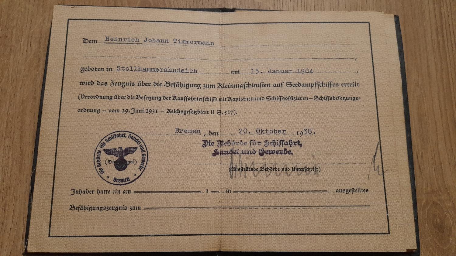 Brevet de qualification mécanicien à bord des navires BREME 1938
