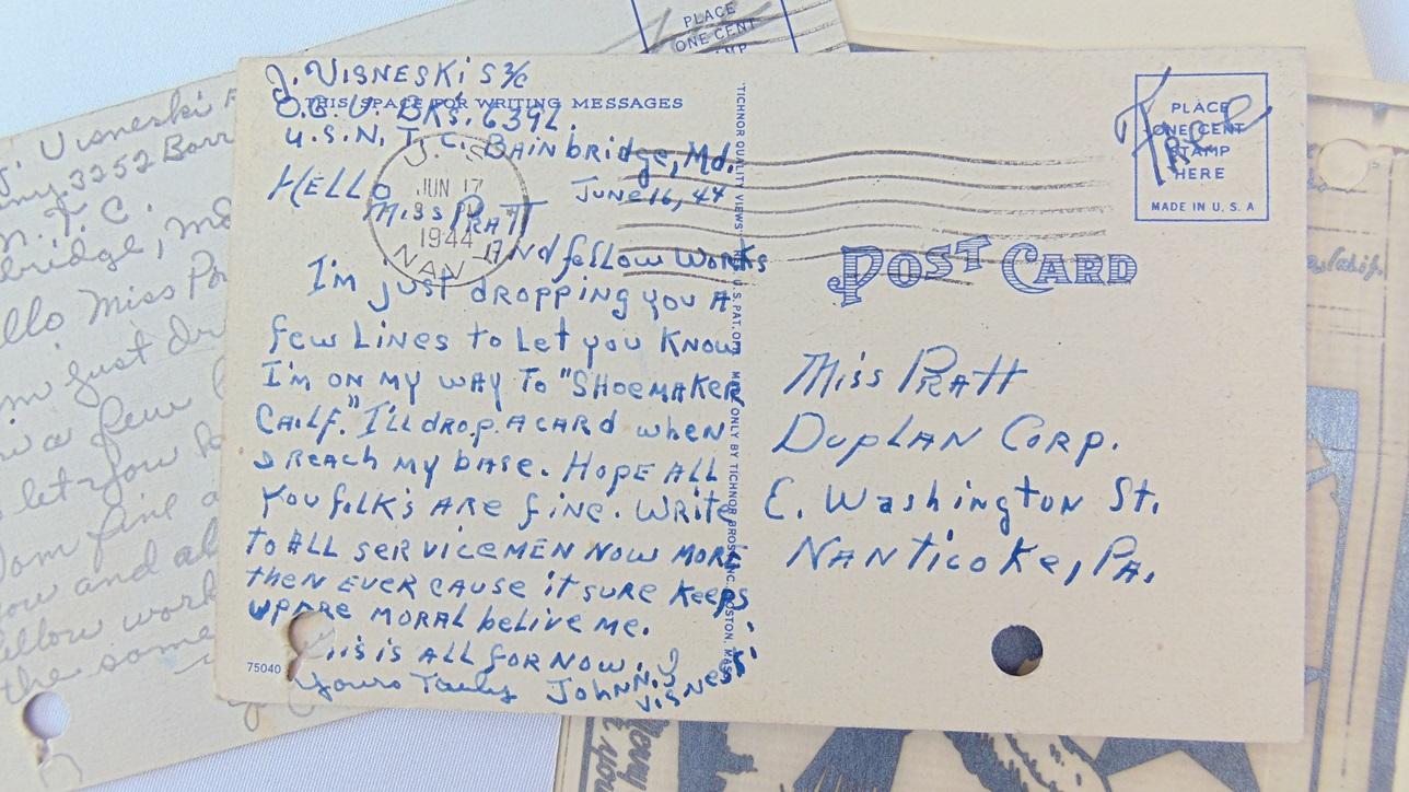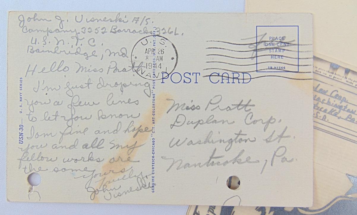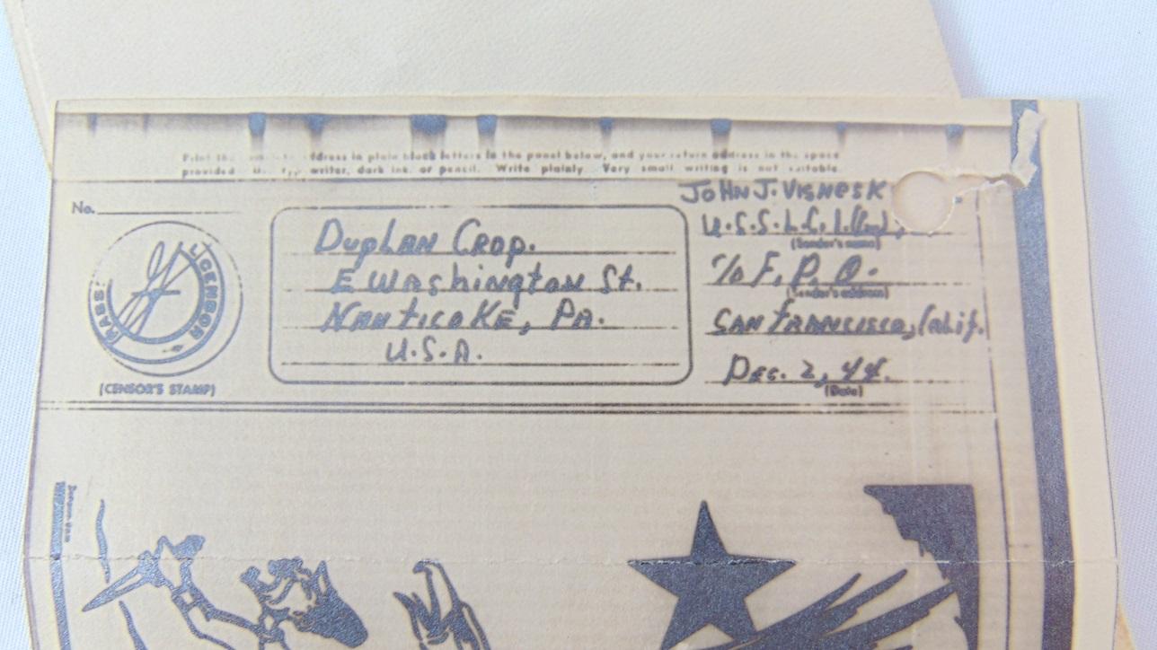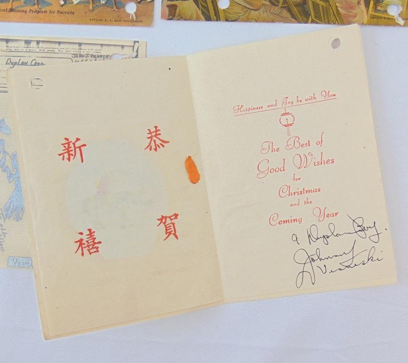 Grouping US Navy du soldat Visneski, le grouping se compose d'un V-mail, deux cartes postales datées 1944, et une carte de vœux chinoise pour Noël.