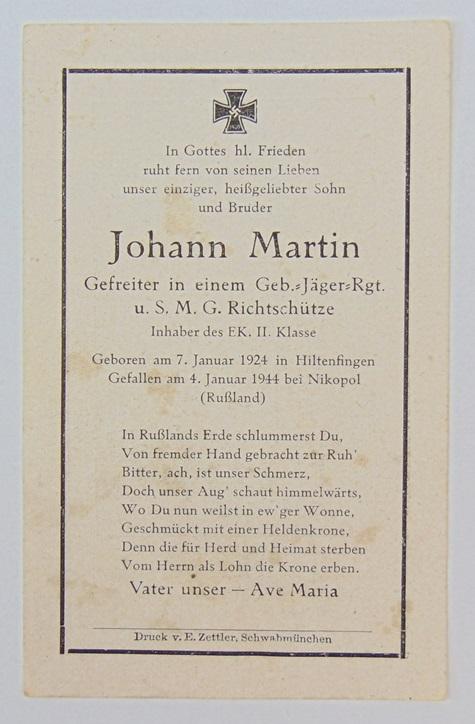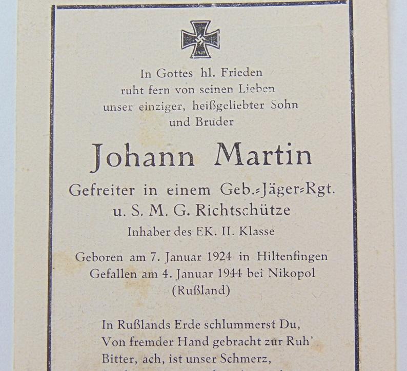 Avis de décès d'un GebirgsJäger d'un régiment de MG mort en Russie en 1944.