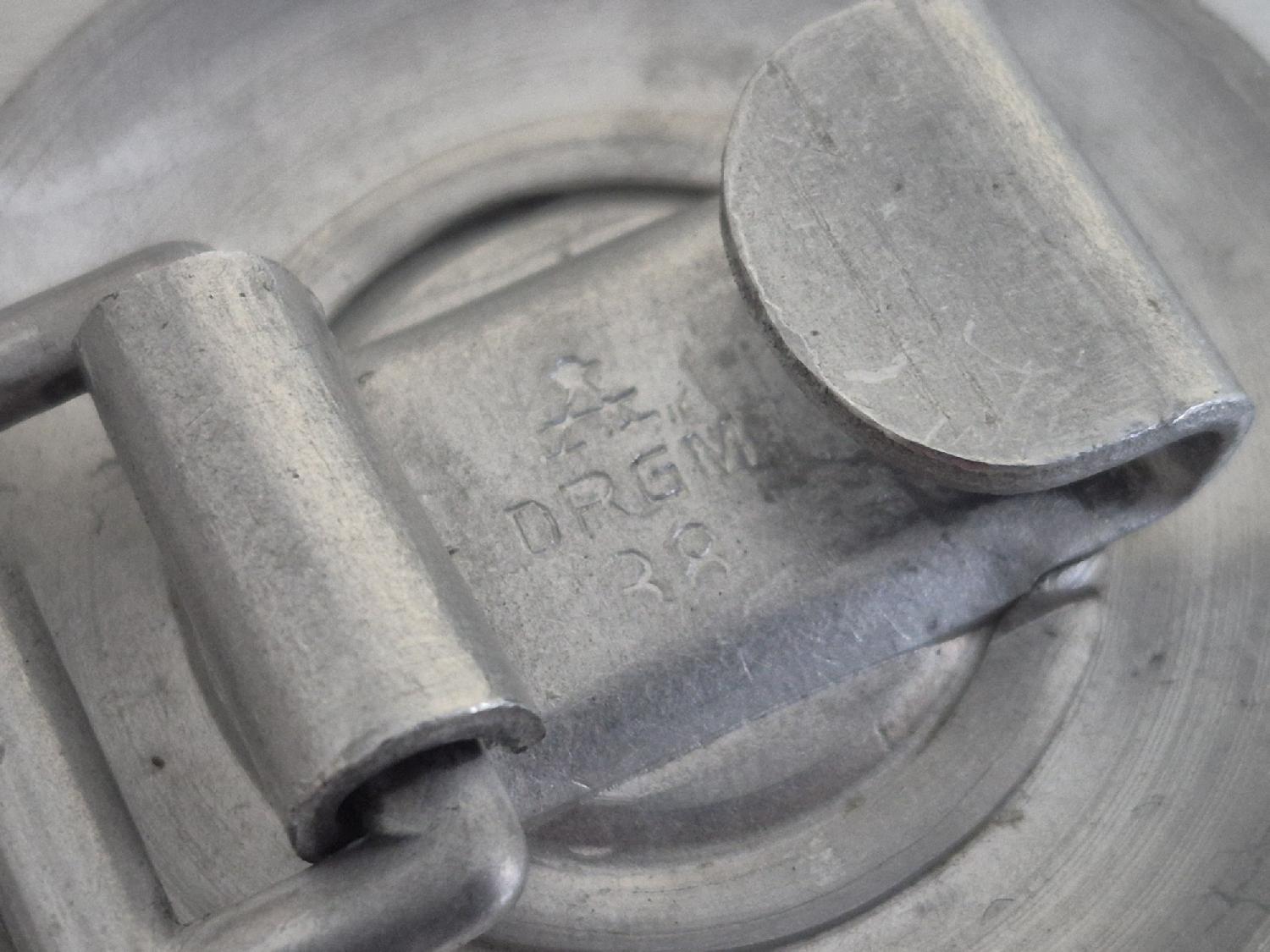 Boucle de ceinturon d'officier de la Police. Fabrication en aluminium marquage au dos de la boucle A DGRM 38 qui identifie la firme " Assmann " en 1938.