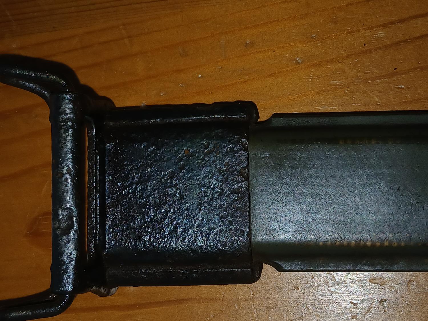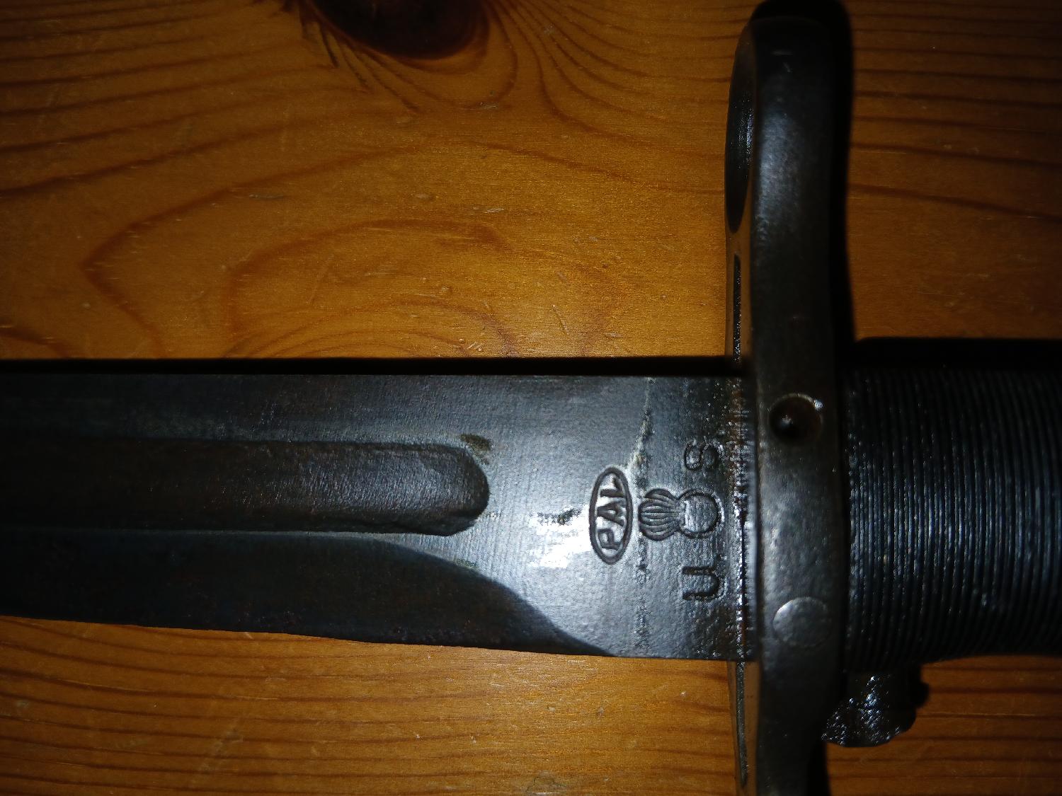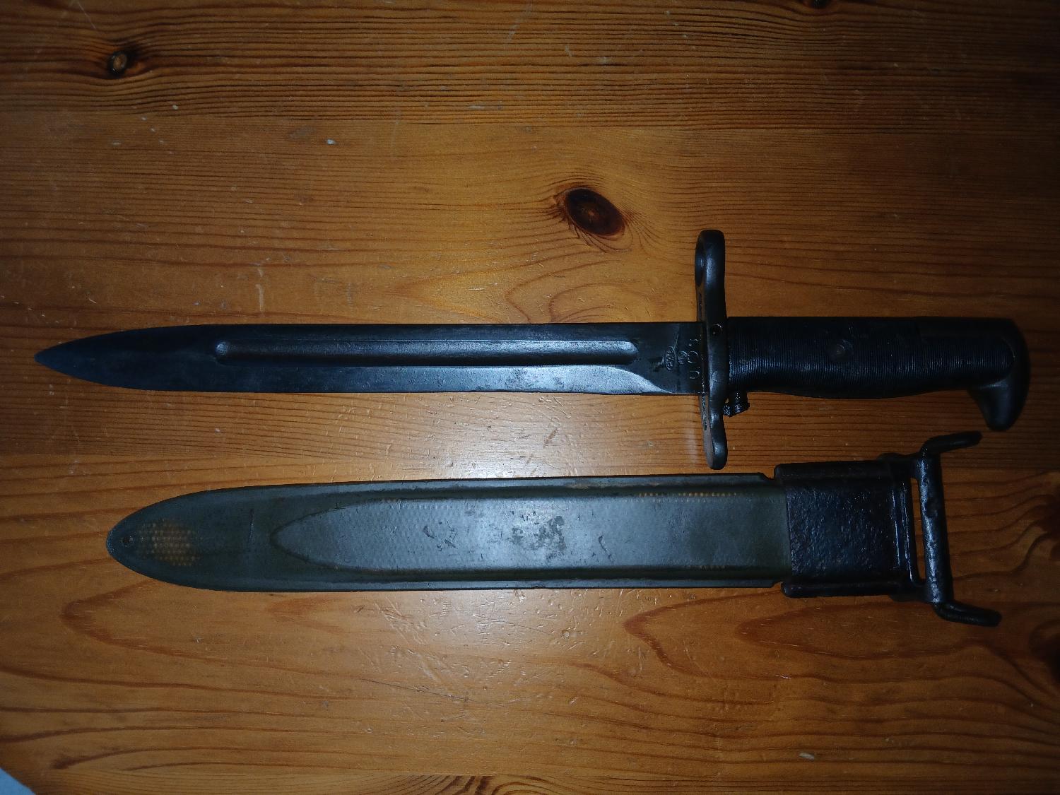 Baionnette US M1 PAL en bon état, manque une goupille de fixation de la garde. Etuis avec reste d'oxydation et usure de l'étuis (cf photos) . Marquage US visible