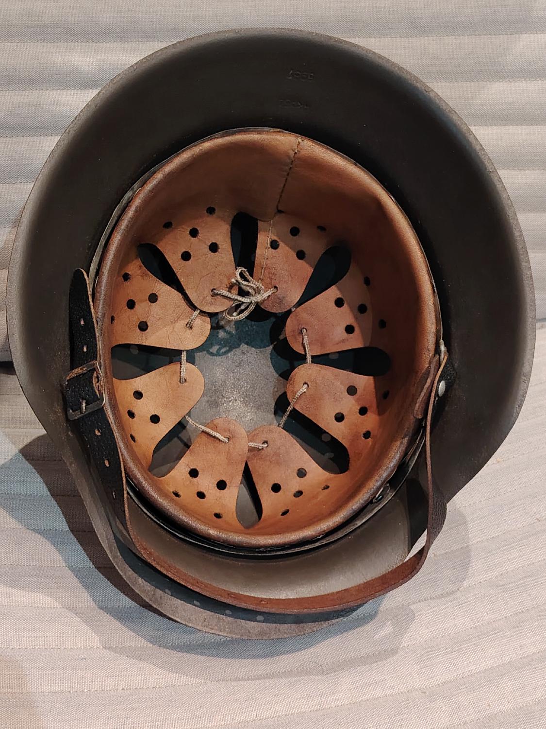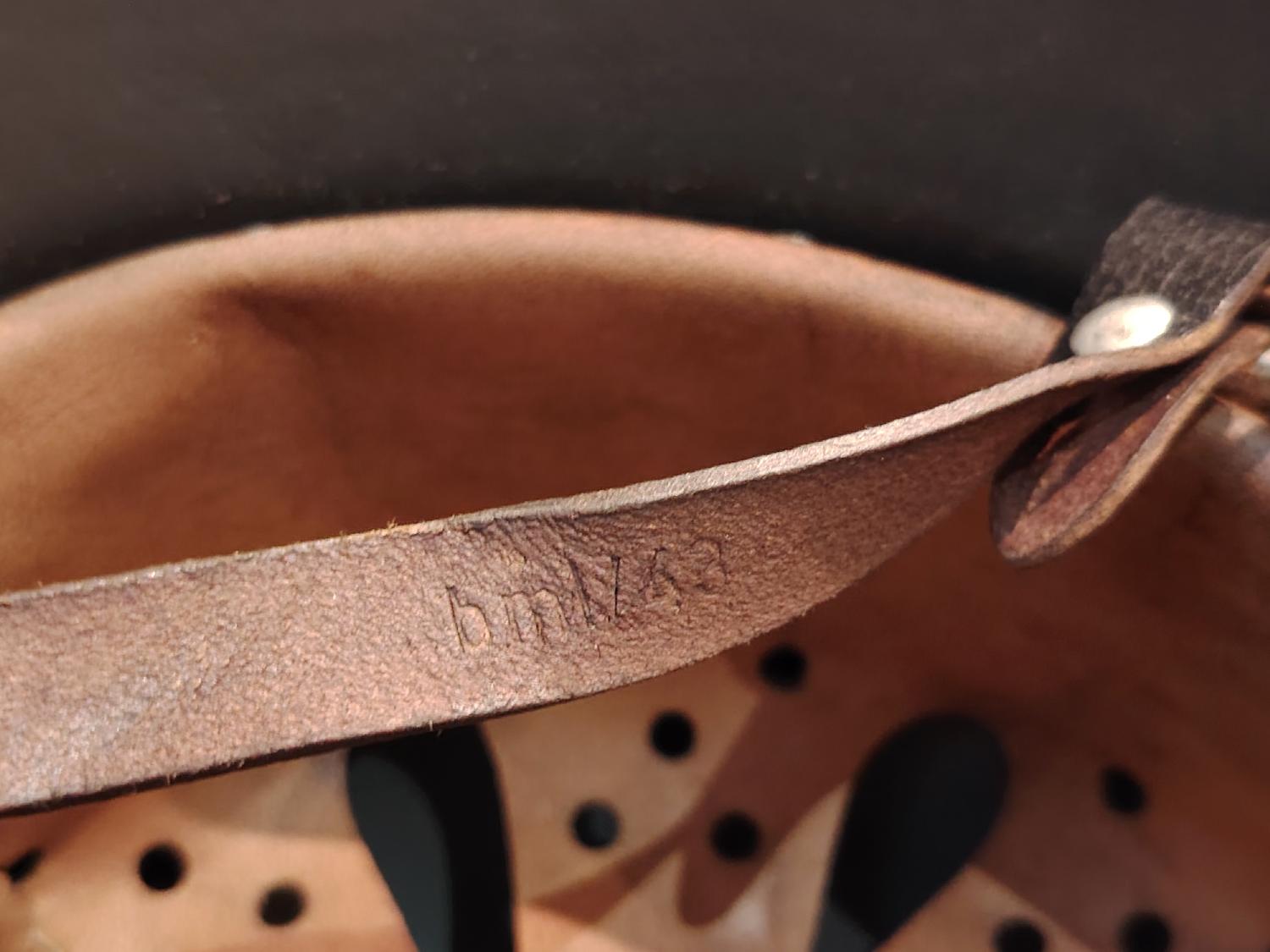 Le casque est équipé d'une jugulaire en cuir naturel et porte le marquage bmI/43.