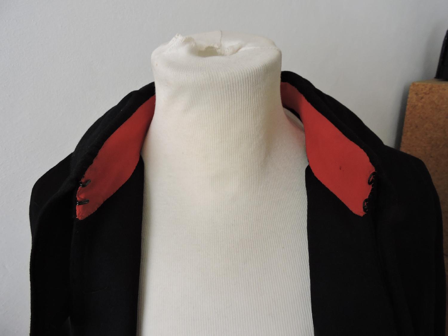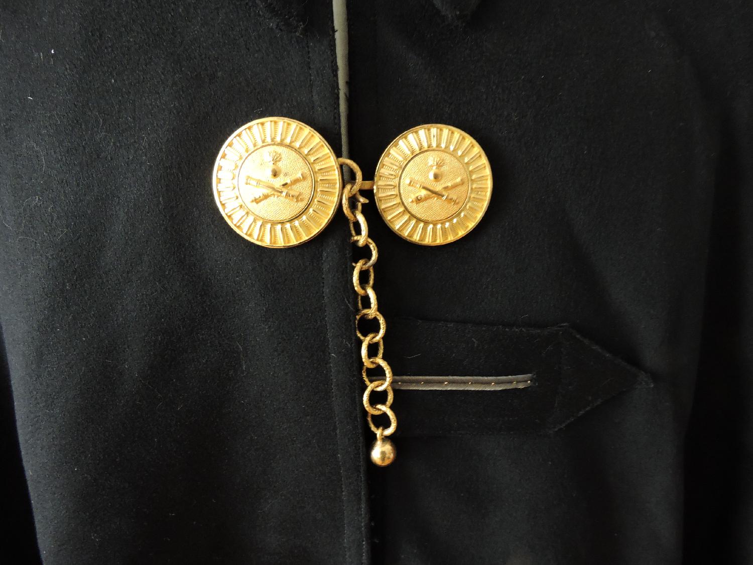 En drap fin noir, col demi-saxe, sur le devant patte ade grade de sous-lieutenant, doublure en satin noir. Col doublé de drap écarlate. Boucles dorées de l'Artillerie.