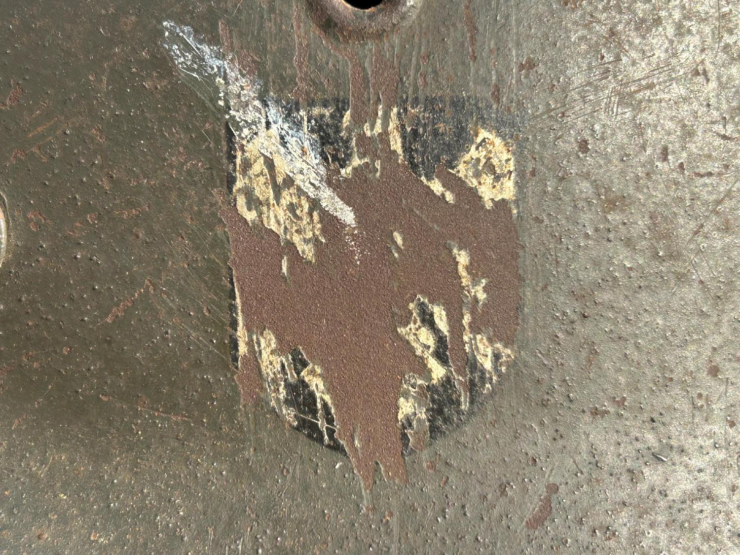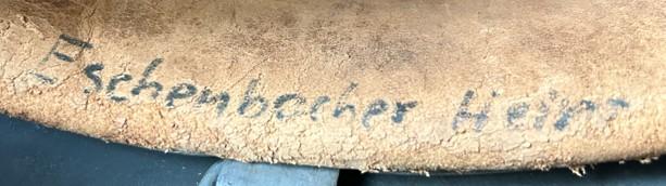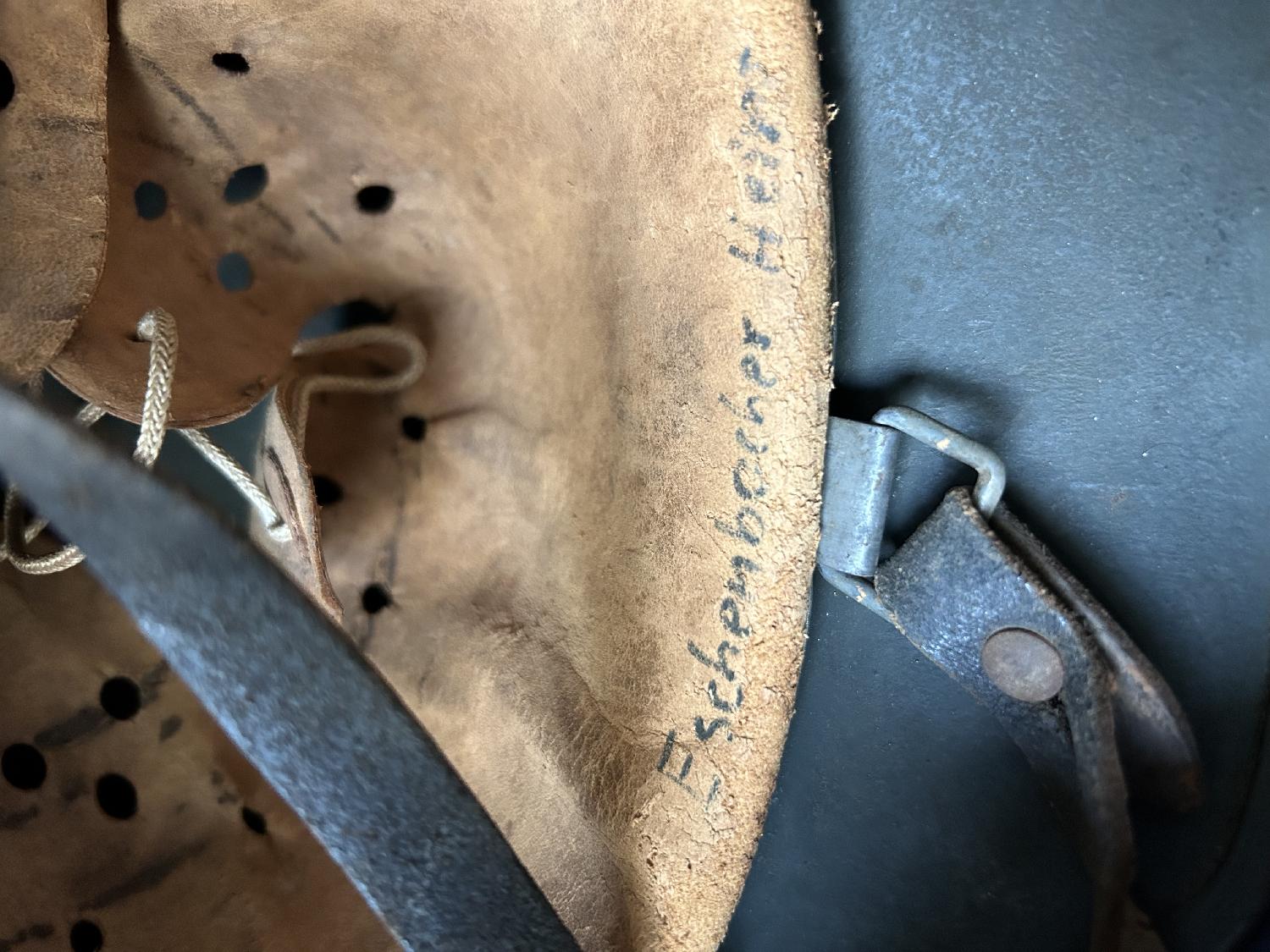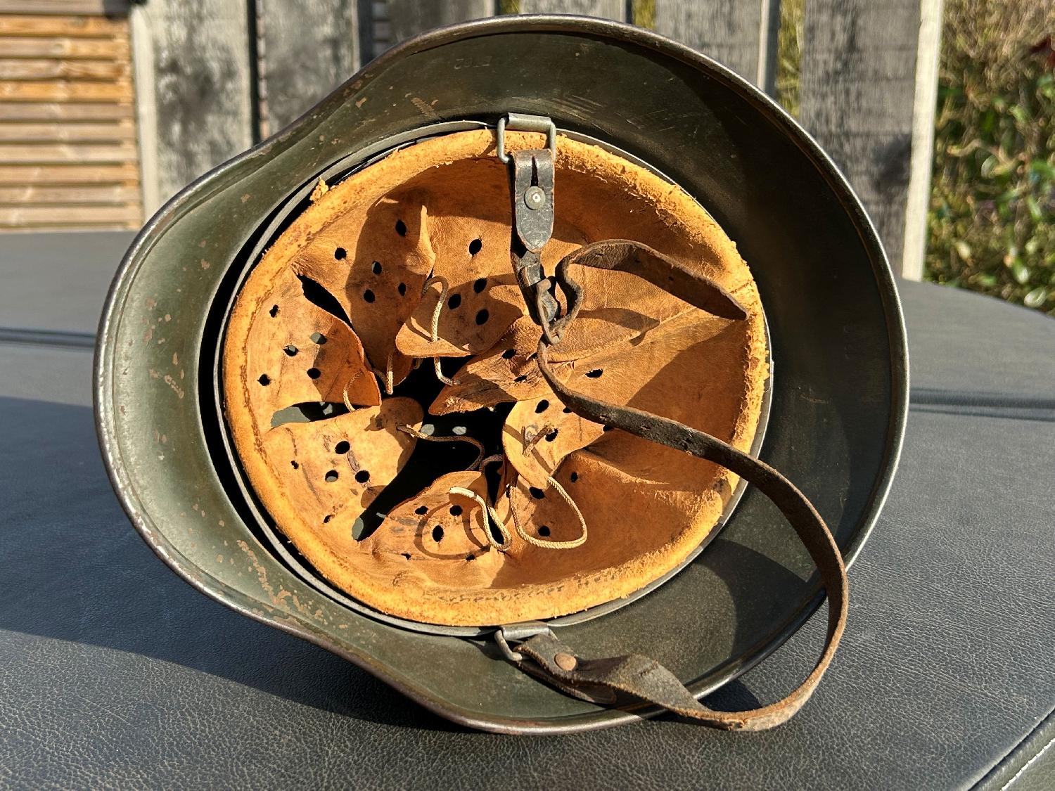 Fabicant ET taille 62, numéro de lot 1220. Casque nominatif avec cuirs bien souples, couleur vert sapin. Entièrement original.