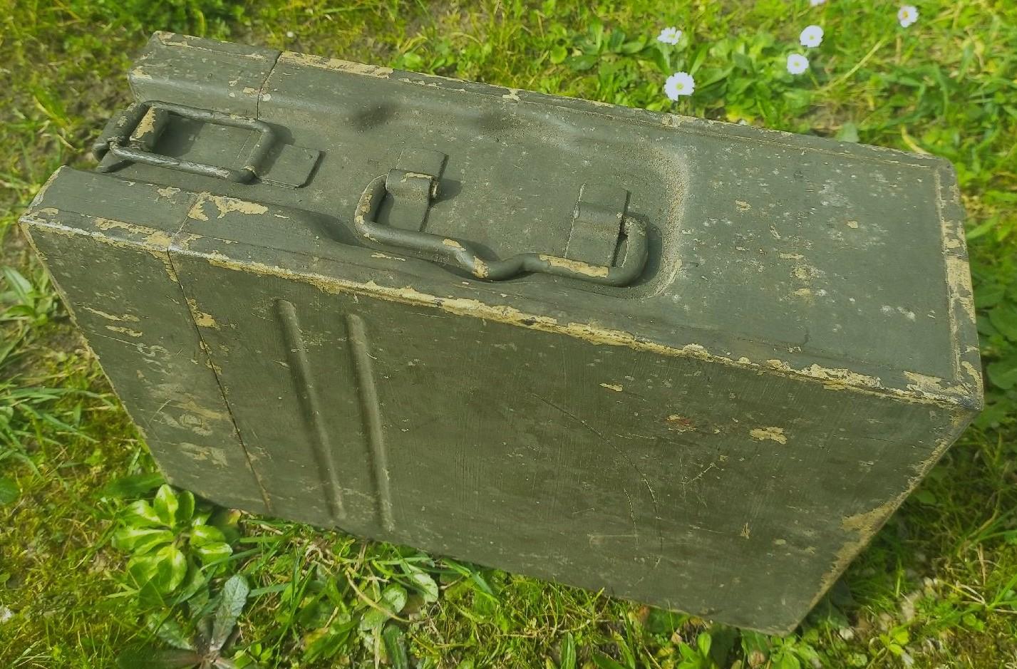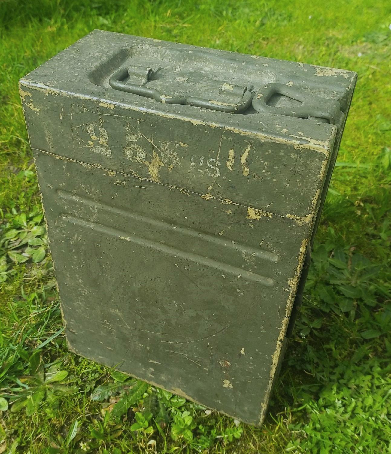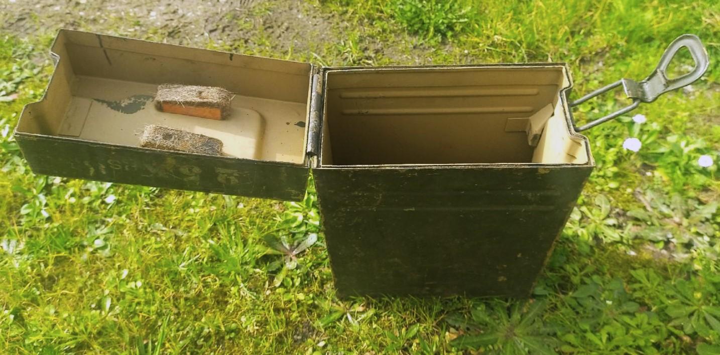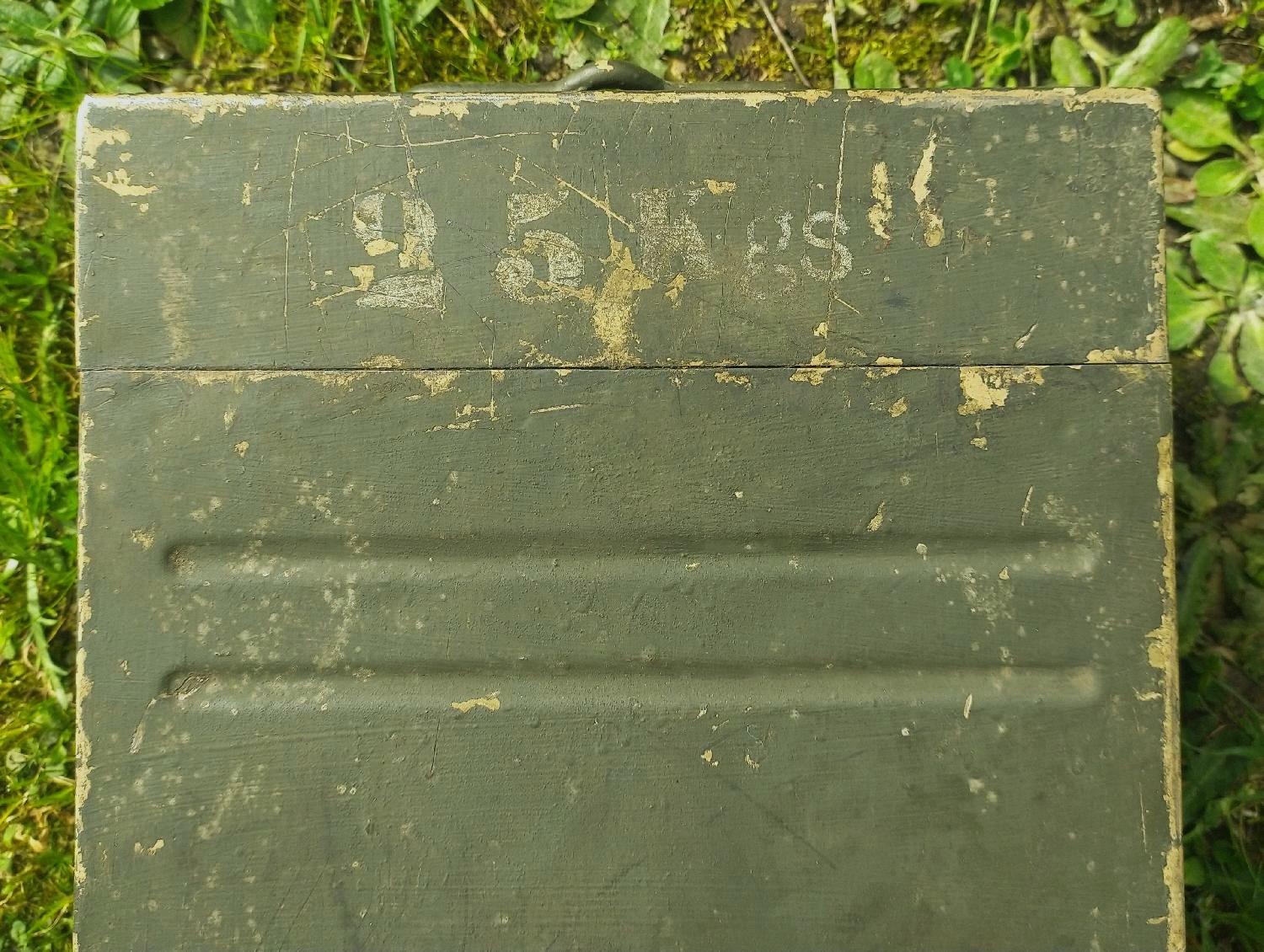 Je me sépare de cette caisse pour 2 chargeurs de 2 cm FLAK 30 & 38. Peinture sable d'usine recouverte d'une peinture marron/feldgrau au pinceau. Marquage de poids en charge au pochoir. Réceptionnée en 1943, fermeture et charnières fonctionnelles.