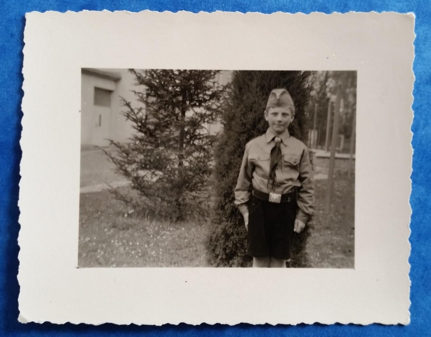 Photo d’un jeune HJ en tenue. Format 6,2 cm sur 7,8 cm. Au revers, marque de papier « Agfa-Lupex ». Très bon état.