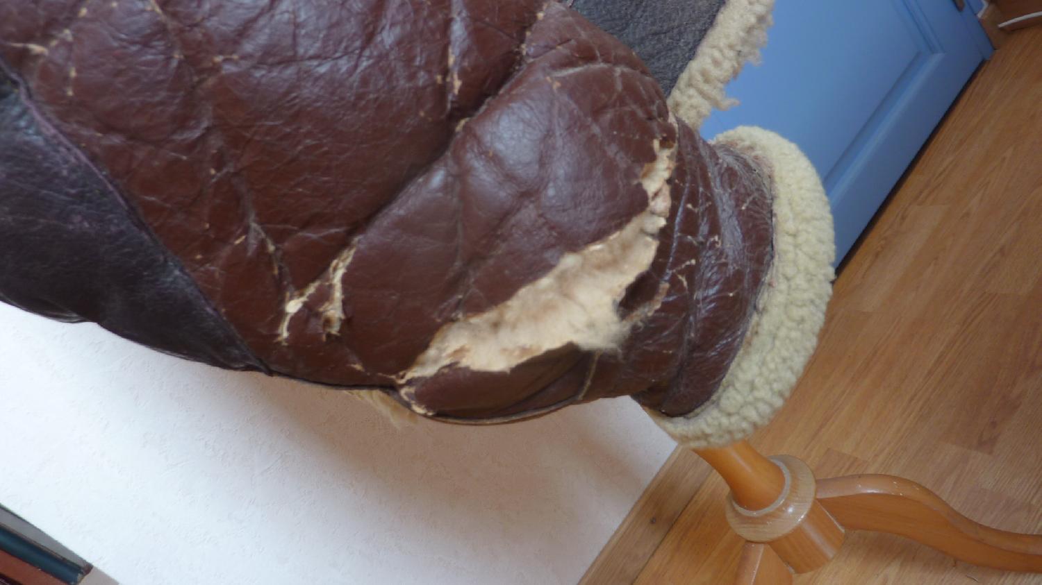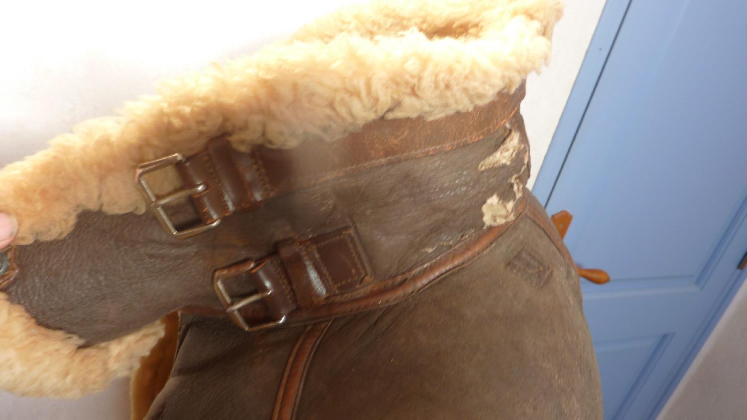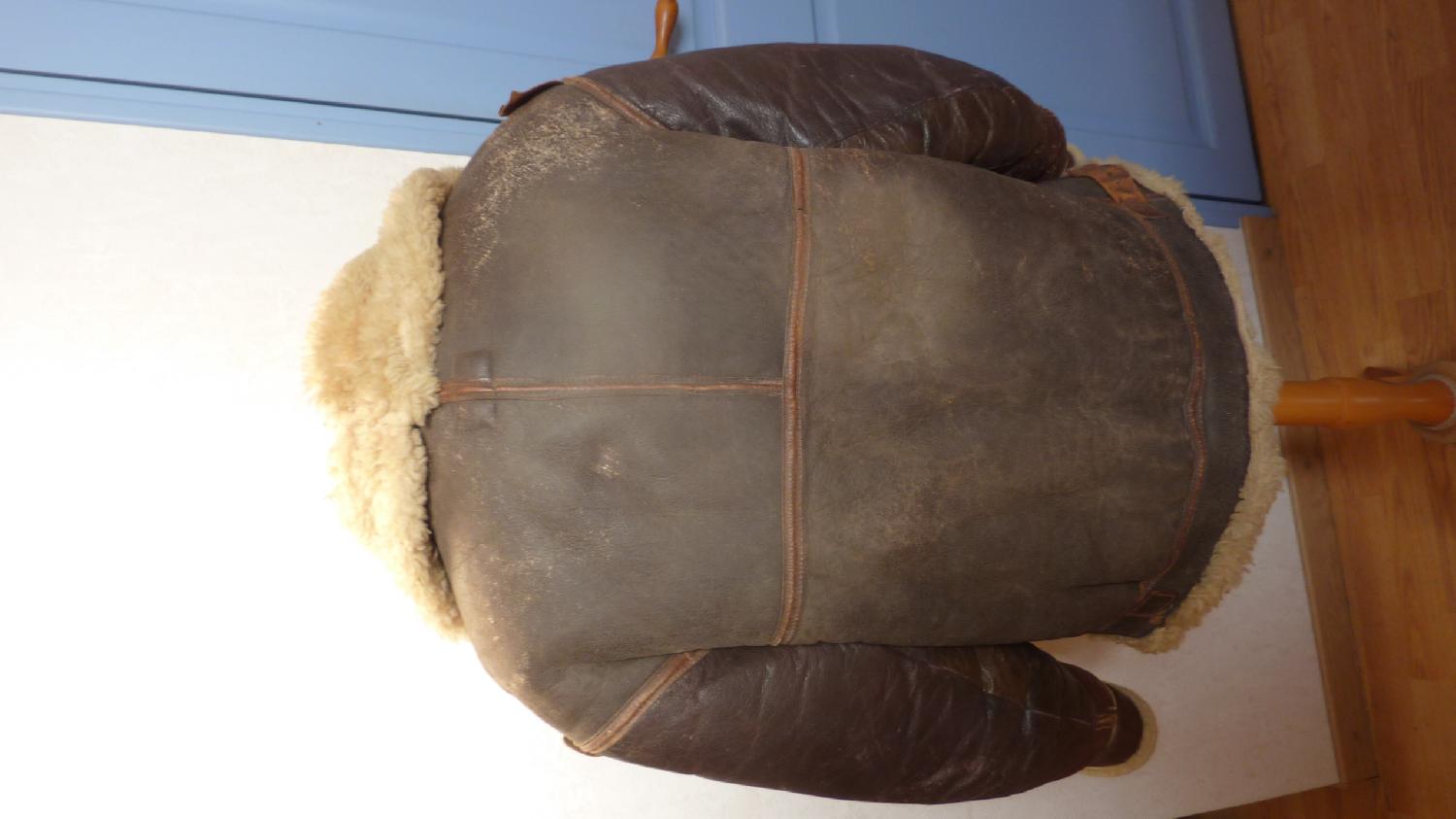 Blouson bombardier B-3 Army Air force 39-45 en deux couleurs. Cuir bien souple, jamais graissé ni ciré taille 40. Quelques petits accrocs sans gravité. Fermeture éclair fonctionnelle. Une petite sangle de serrage raccourcie sur le côté. Autres photos sur simple demande. 600 euros plus port 8,25 euros en mondial relay. Paiement par chèque ou par paypal. Possibilité de venir chercher sur place