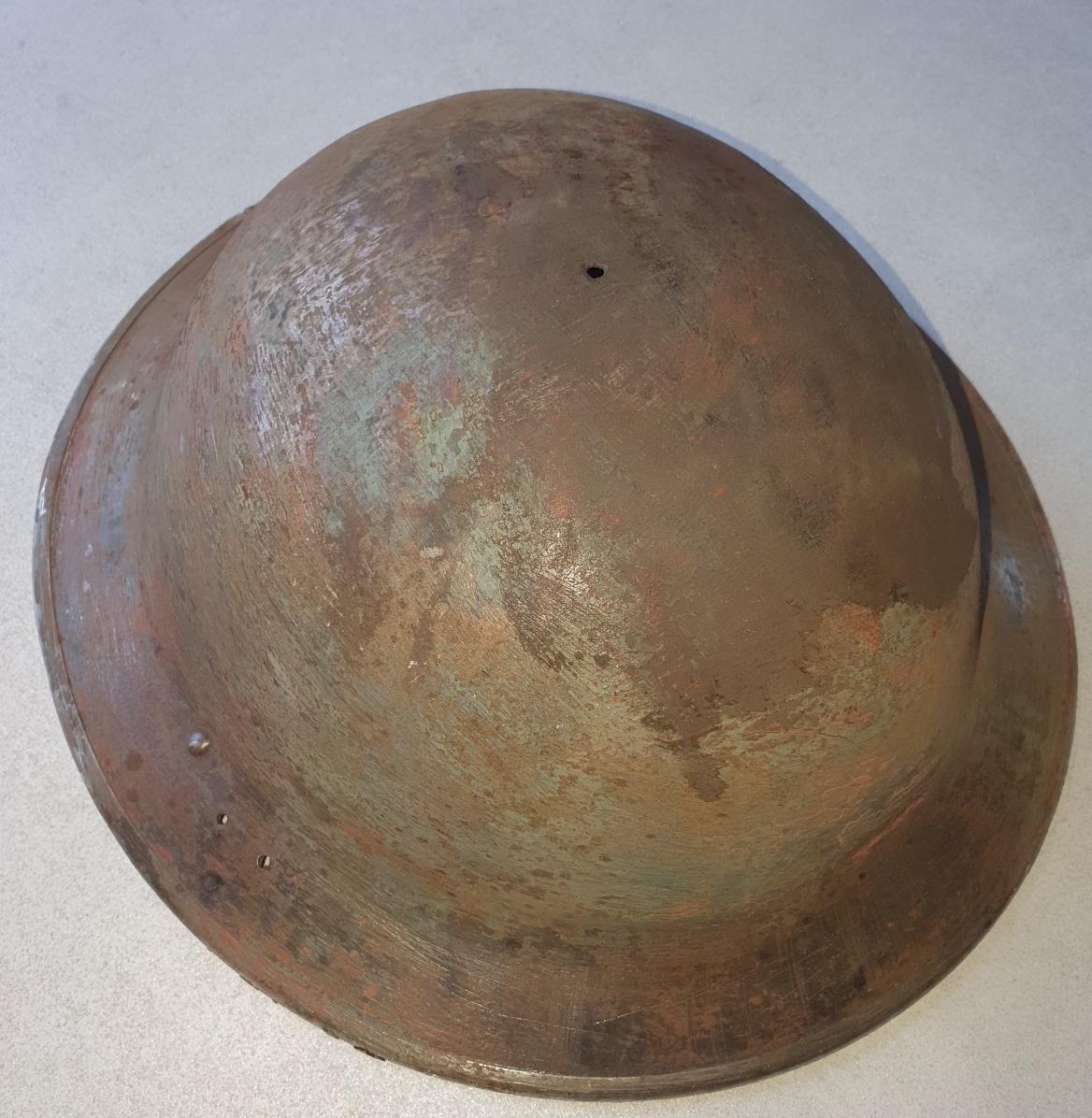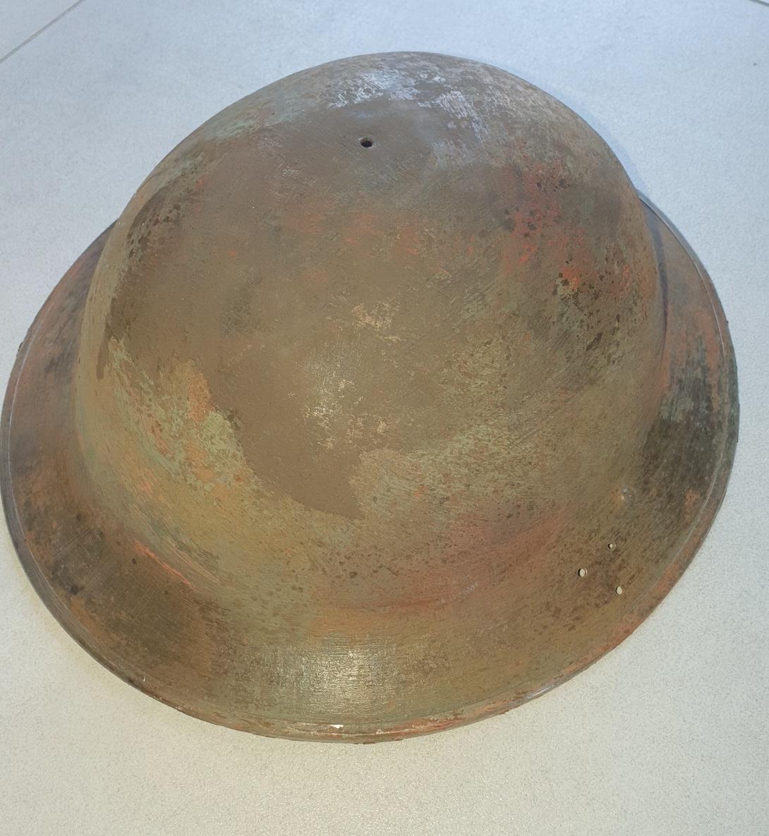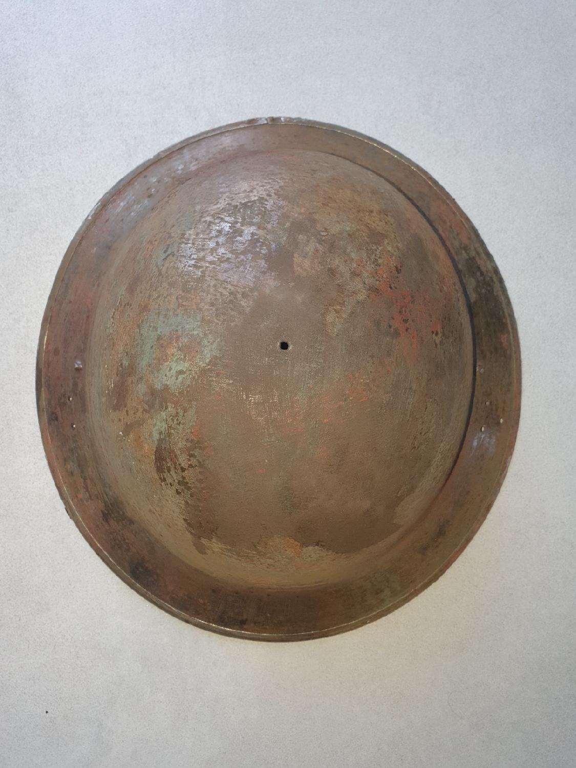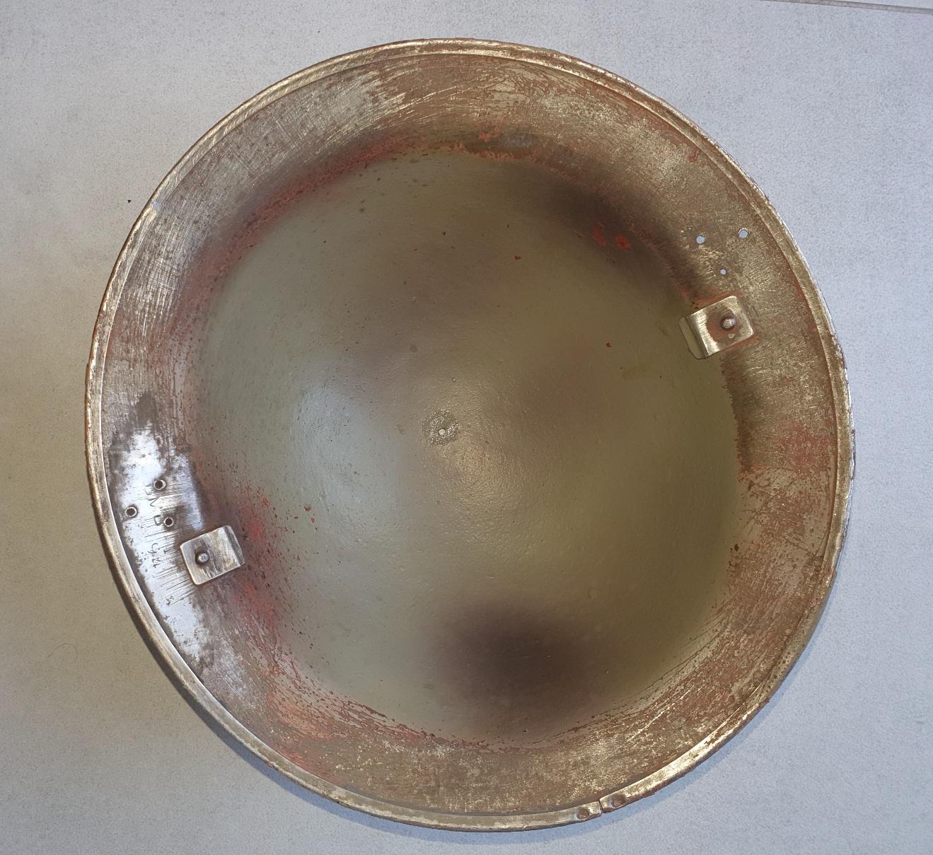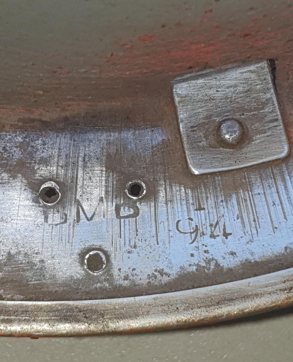 Coque trouvaille terrain mais métal très sain sans trous ou oxydation sur la bombe, a été remise en peinture jadis ce qui l'a protégé. 3 petits trous parfaitement symétrique de chaques côtés et d'origine (pour fixer visière? nuquiere ? ) . Emplacement de marquage decapé laissant apparaître les marquages BMB et la date 1941. Port compris en mondial relay