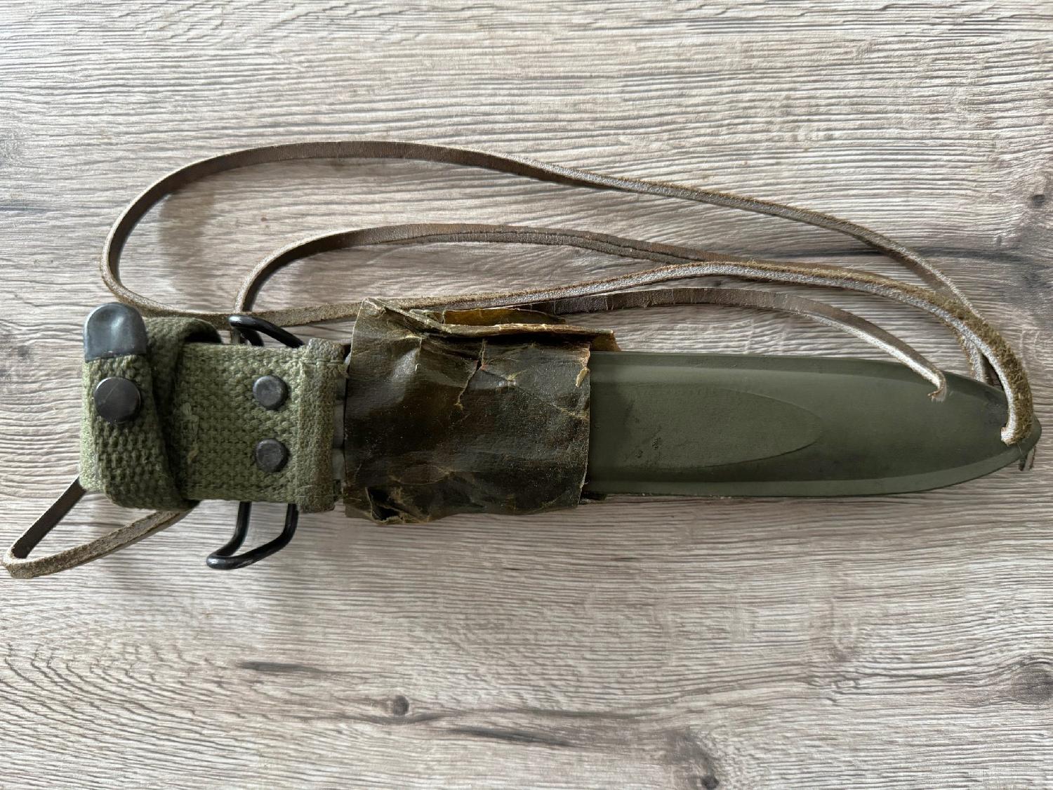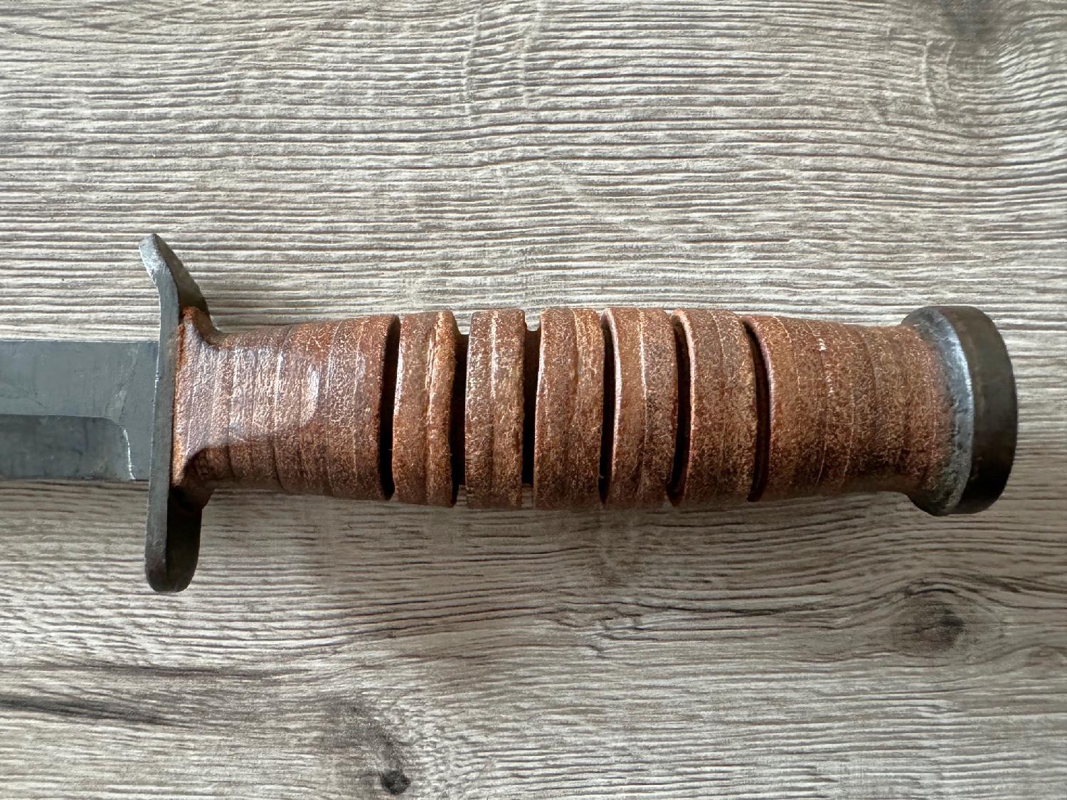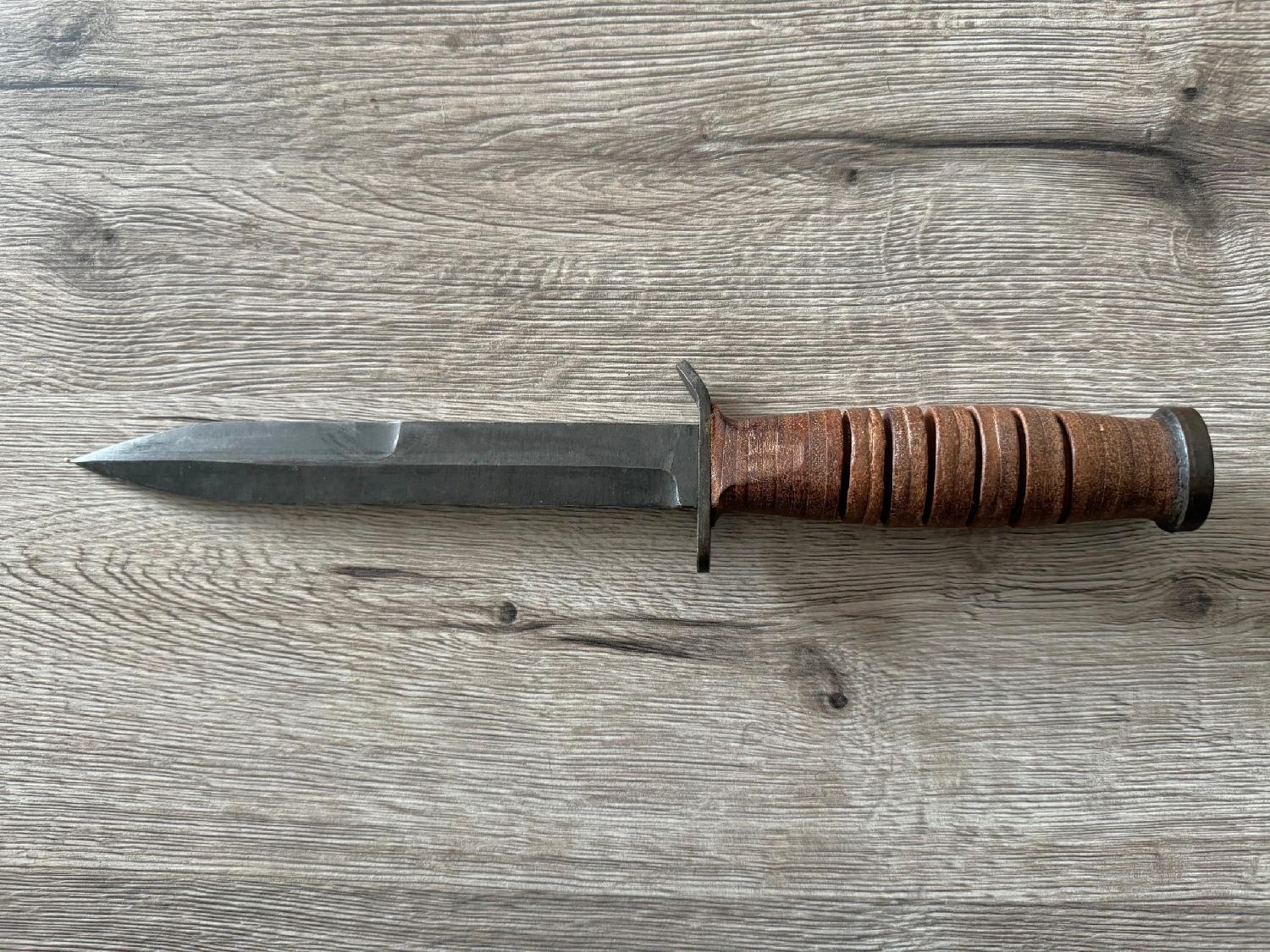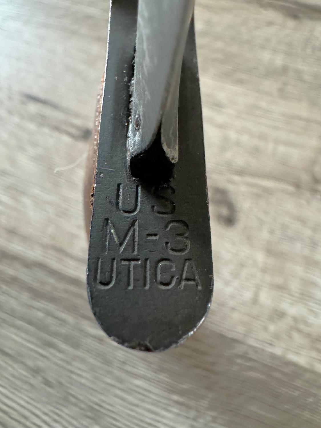 Vends un Superbe Poignard US M3 UTICA de 1943 ww2, Poignée Composé de Rondelles ou Anneaux de Cuir Fauve,Lame non Affutée, Plusieurs marquages présents , Fourreau d'origine avec le reste de sa couleur à 90% avec le lacet de cuir d'origine ainsi que la boîte